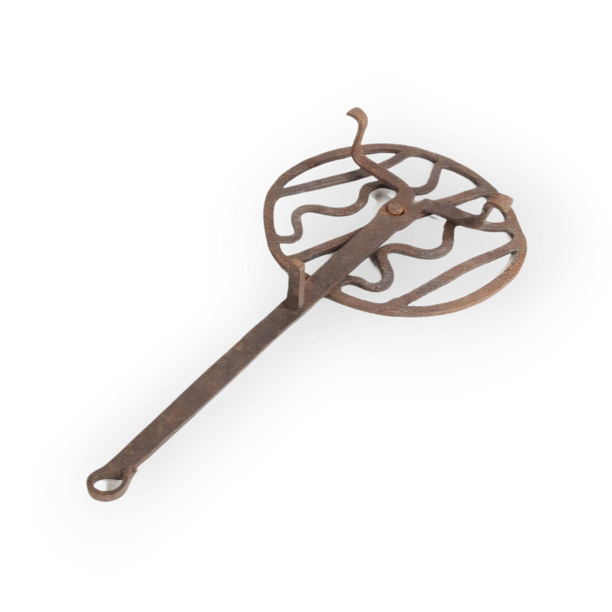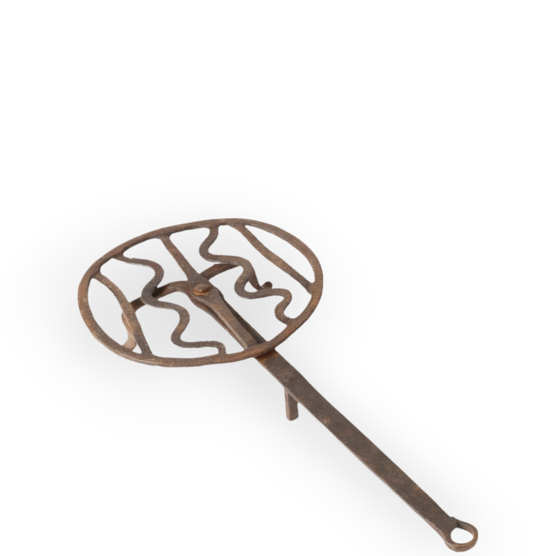 With an elongated handle and shaft with hanging hook, adjoining a rotating iron pan by way of a central pivot. The rotating pan with decorative linear and rippled iron work. Supported overall on three legs.