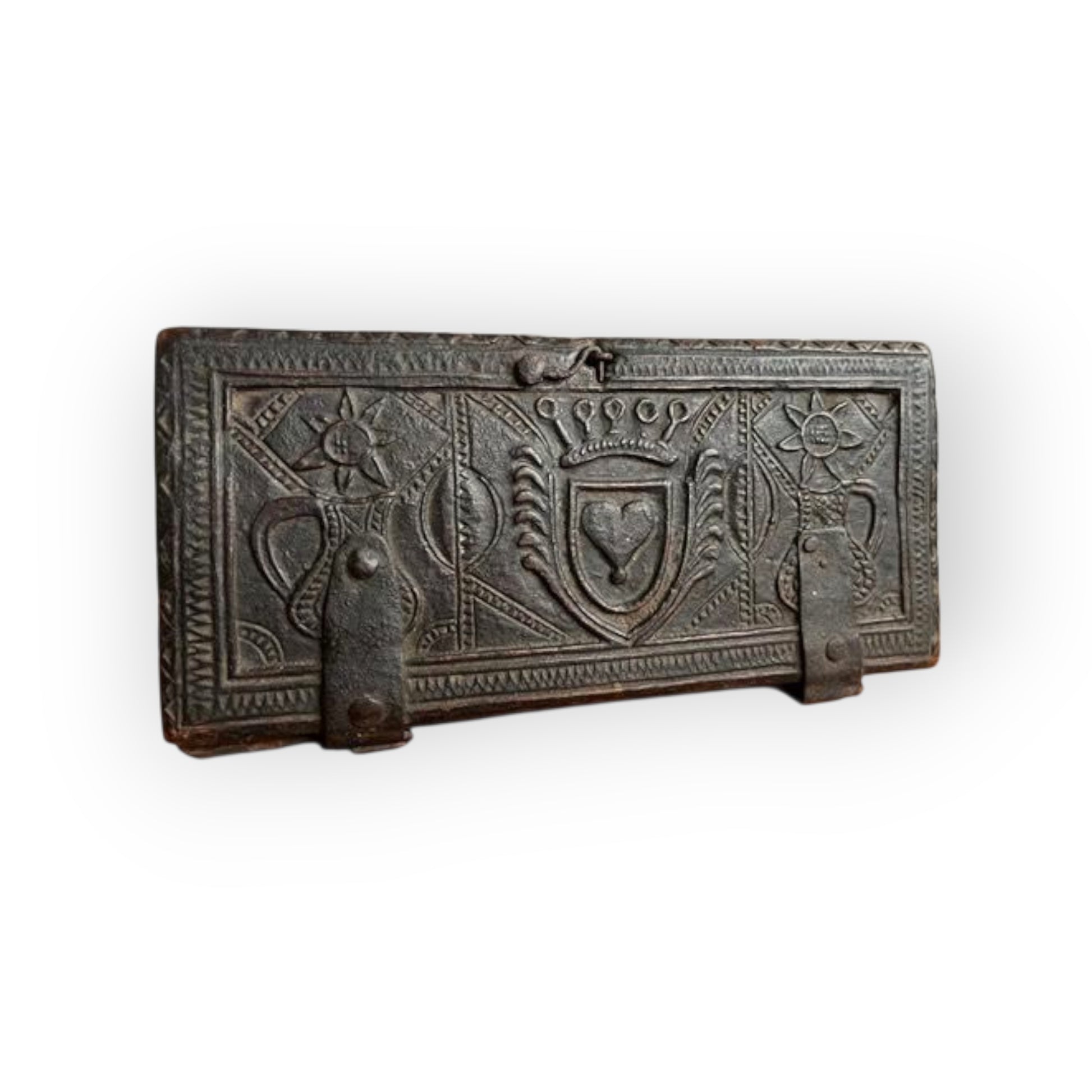 Condition: Please refer to the images. Structurally sound with age-related wear. The surface patina is consistent with 17th-century timber. There has been an old sheet metal repair to one corner and the opposite end board has also had an old sheet metal repair.