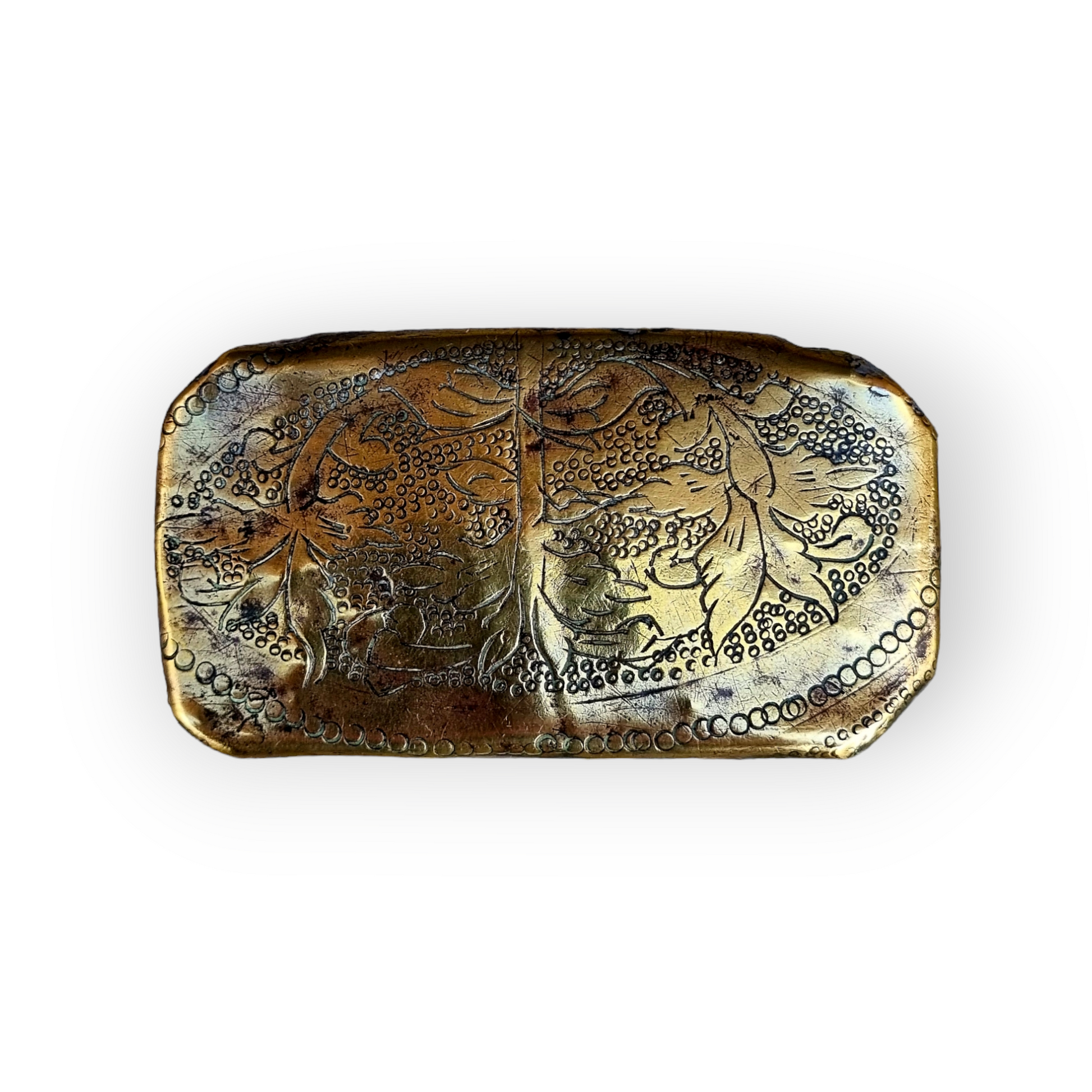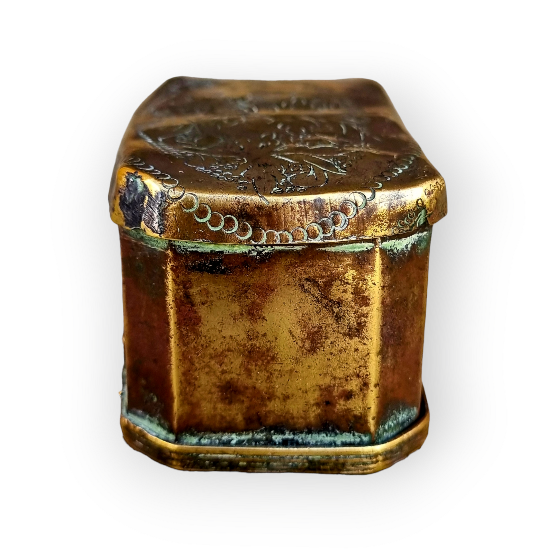 A small early 17th-century antique brass box with punchwork floral decoration made from sand-cast brass sheet.