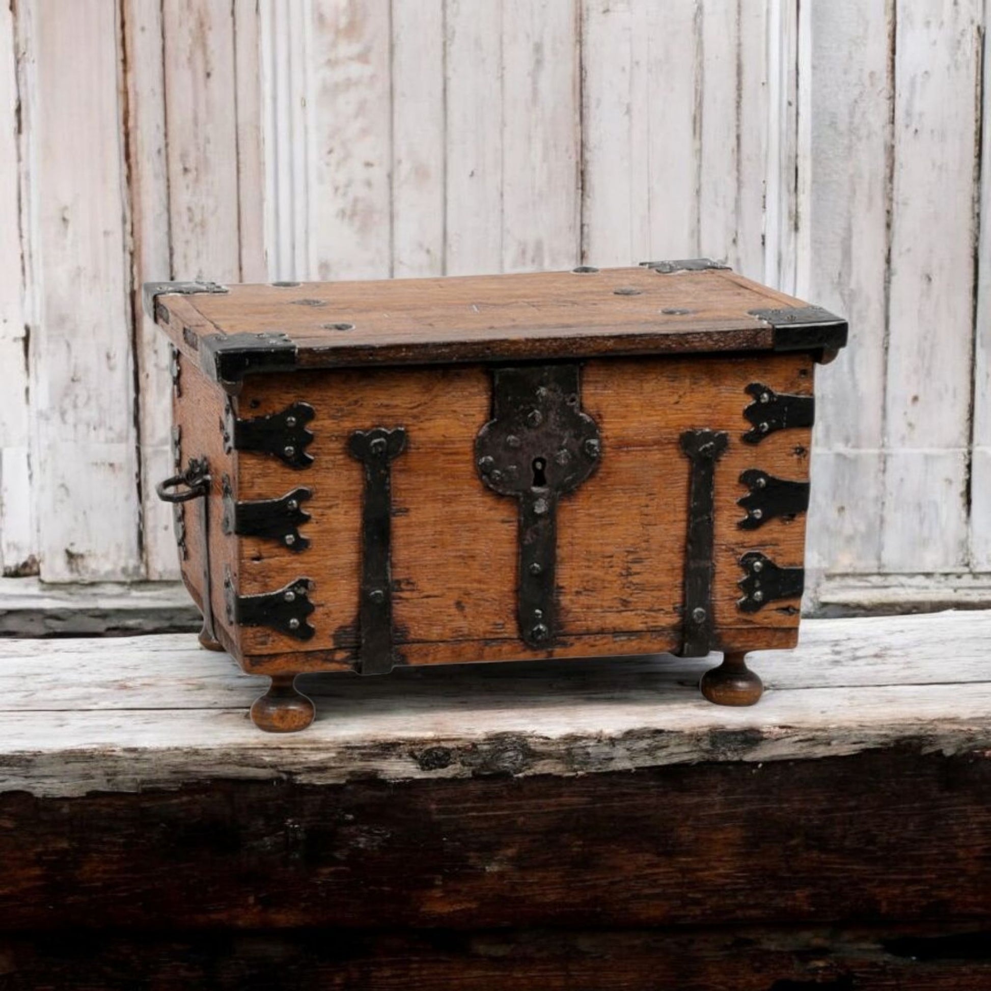 Table boxes or caskets like this were used across Europe in the 17th century to store valuables, documents, or personal effects. The six-plank nailed build and cleated lid reflect vernacular joinery techniques of the period, while the iron strapping and lock plate suggest secure domestic or clerical use.