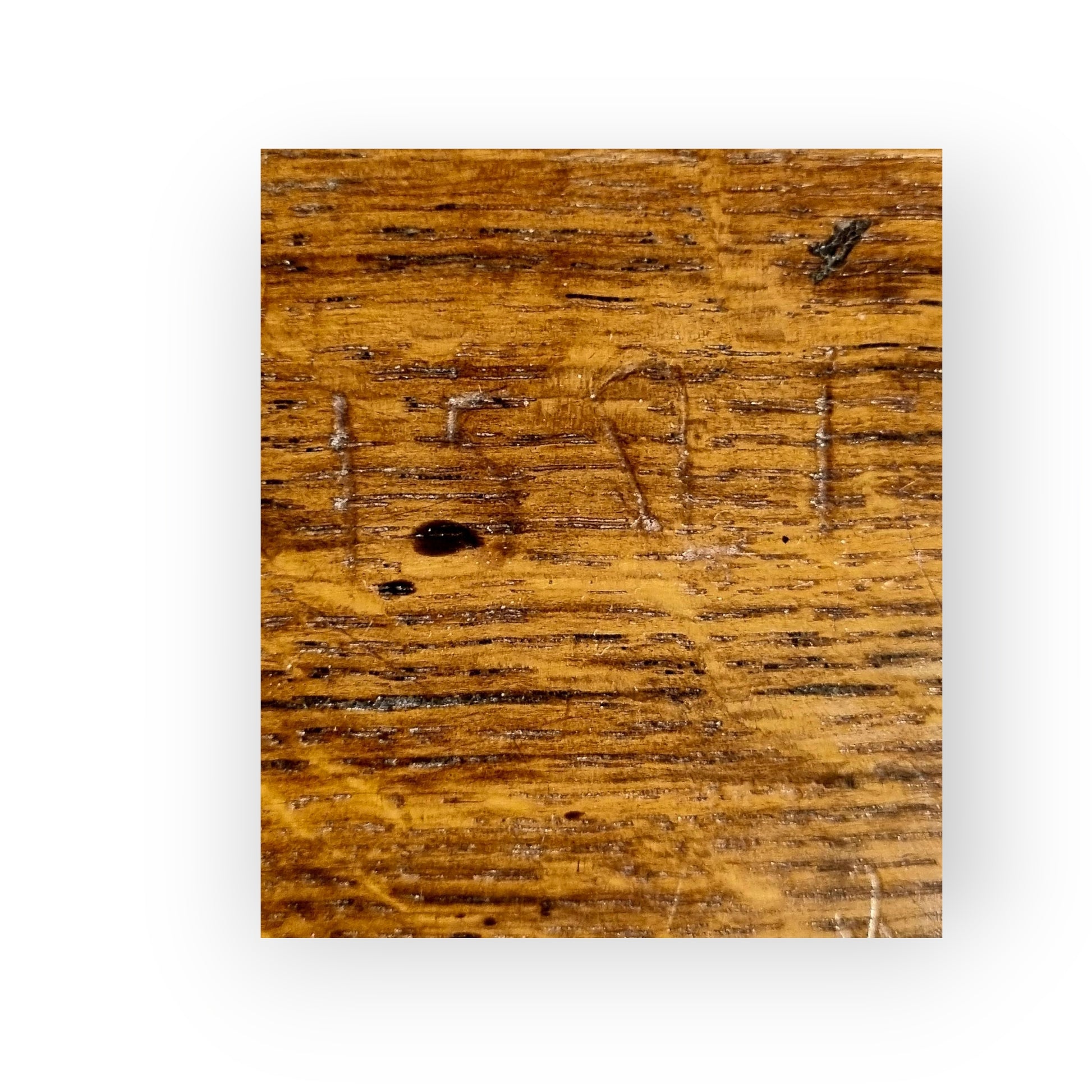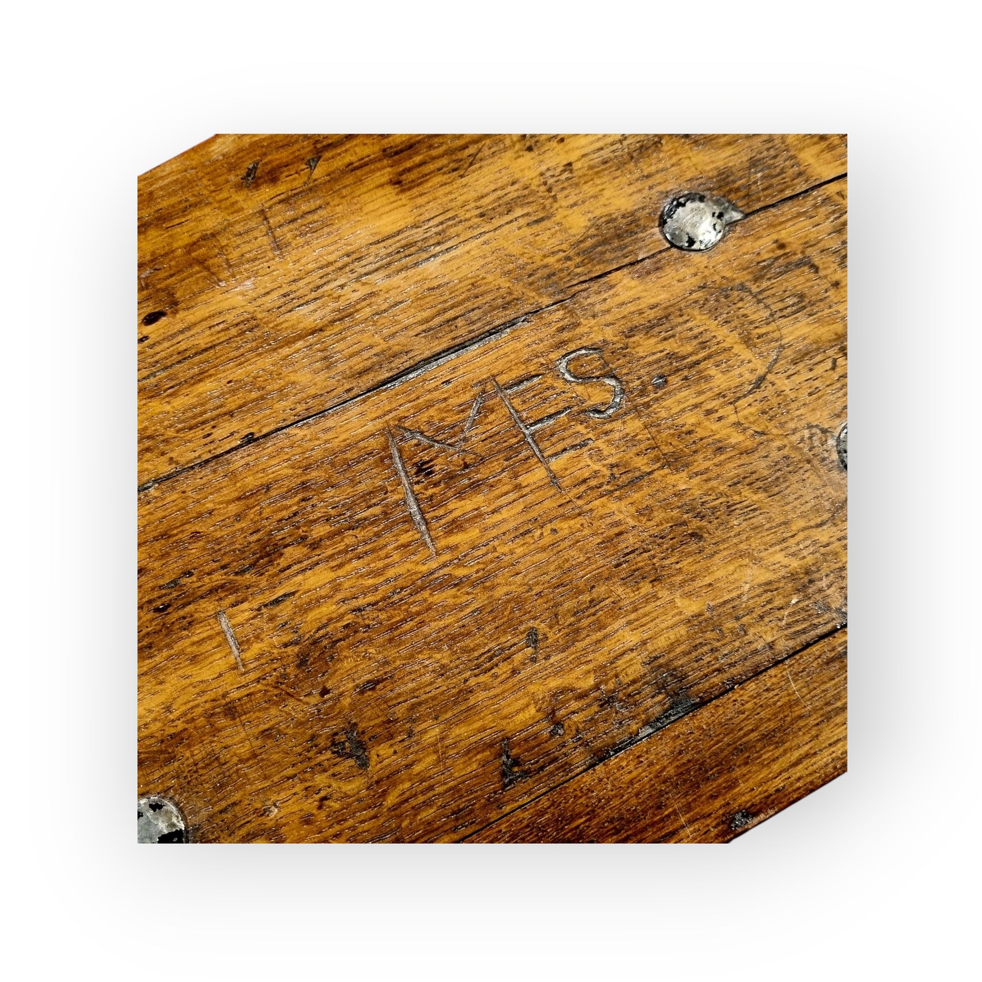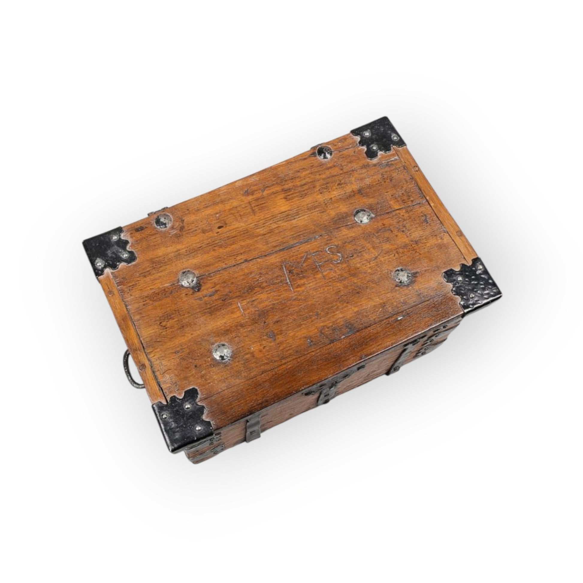 The upper surface of the lid is inscribed with graffiti-carved initials of "MES" and the date of "1501". The date cannot be relied upon in terms of the age of the box and was more than likely inscribed at a much later date.