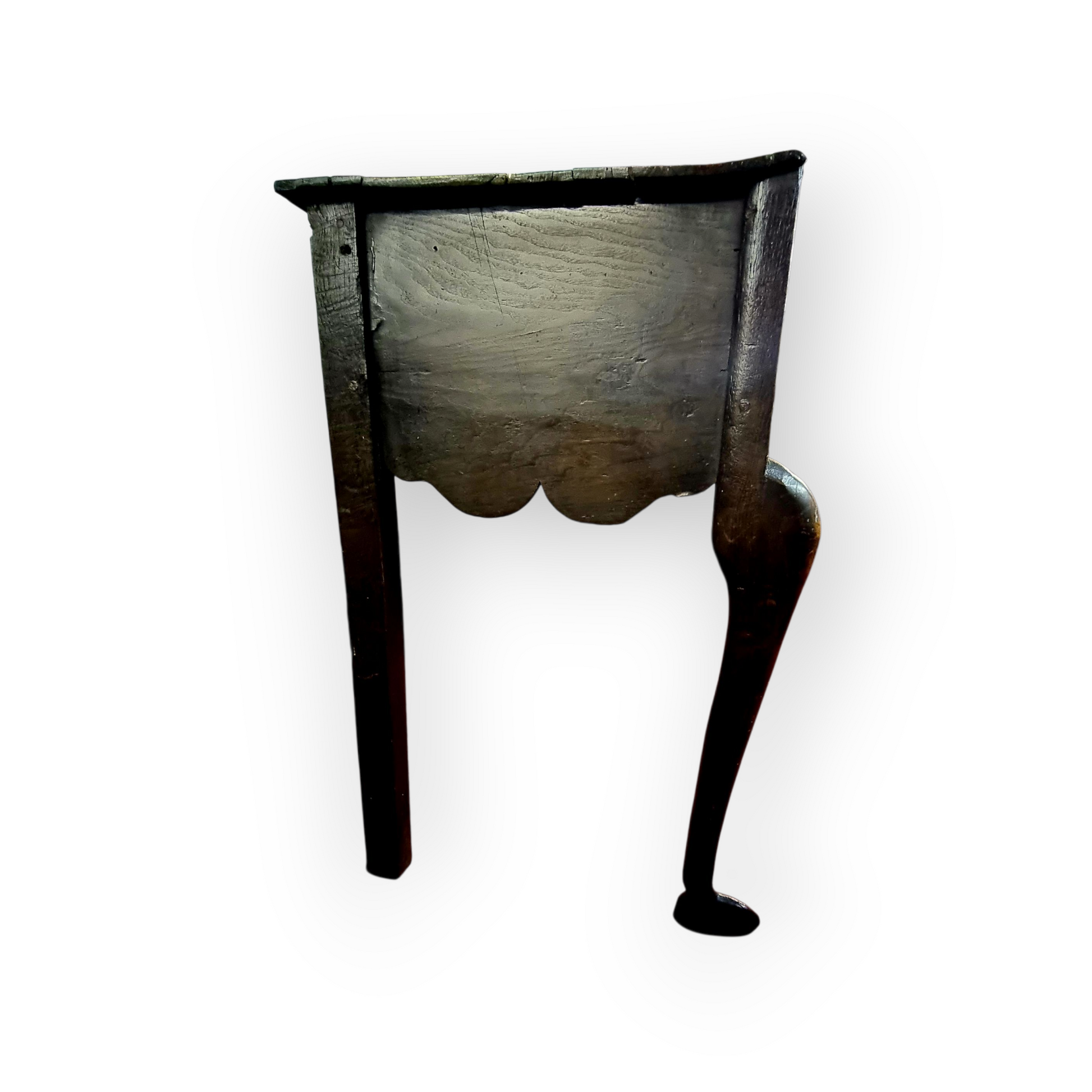With a plank top over an arrangement of three drawers, supported overall on cabriole legs and pad feet to the front and plain legs to the back.