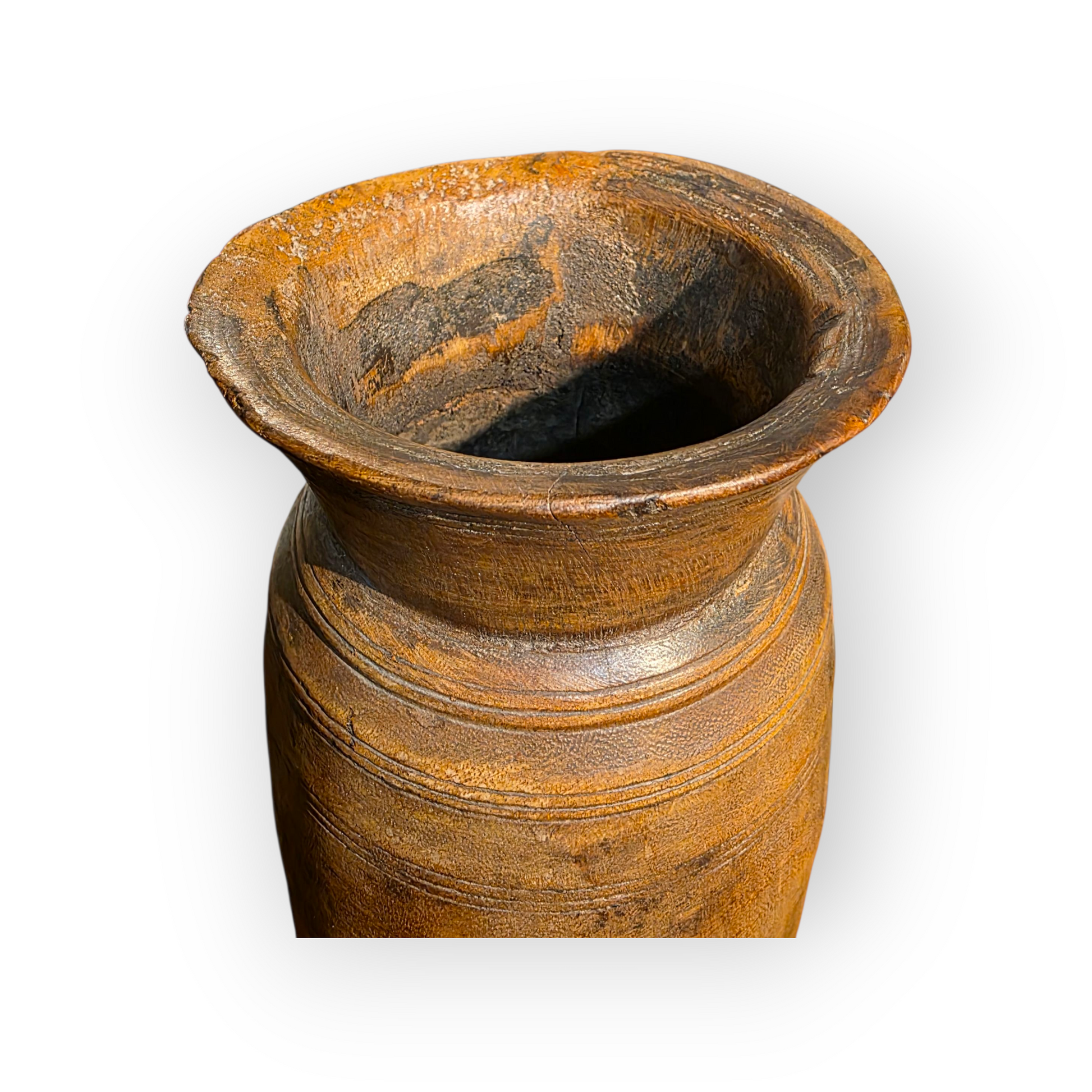 A finely turned dry goods jar in the 18th-century style, showcasing the timeless appeal of treenware craftsmanship. This piece, turned from hardwood, evokes the utilitarian elegance of Georgian domestic life, albeit made at a later date, probably in India or Pakistan, with a smooth patina and subtle tool marks that speak to its handmade origins.