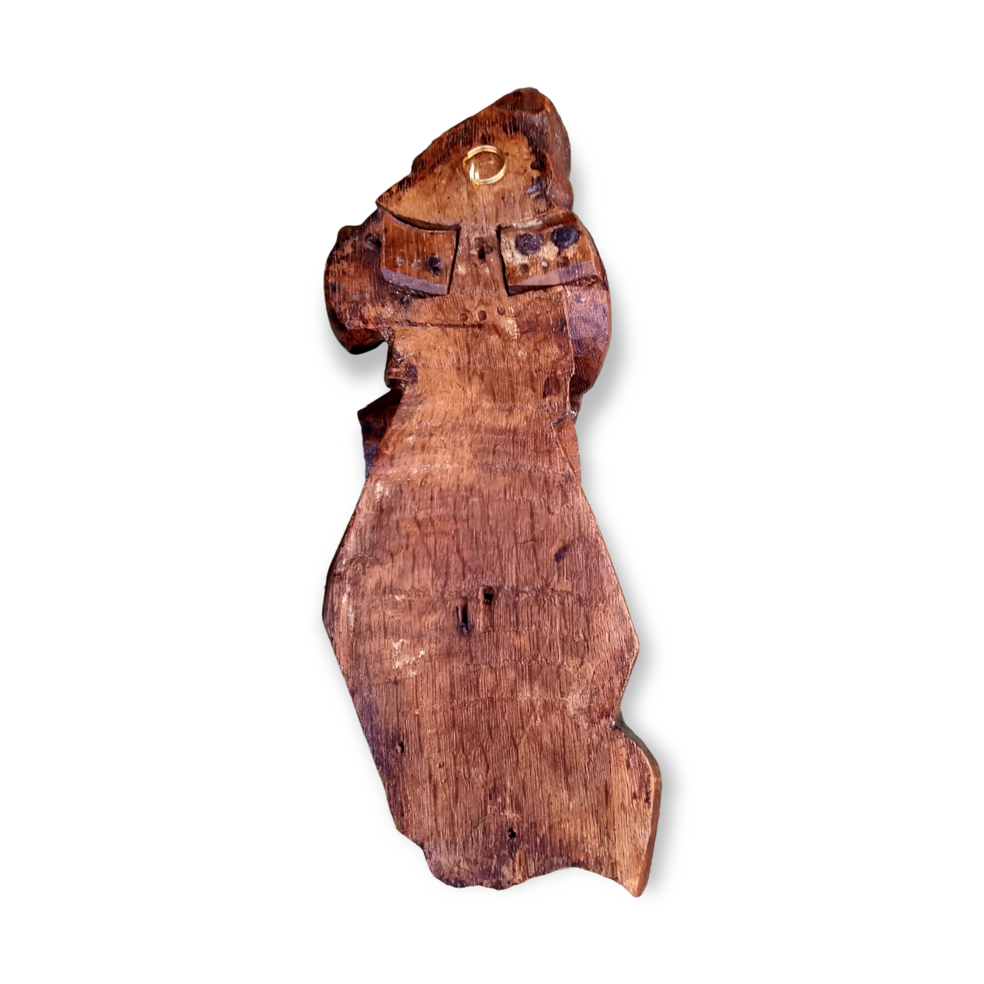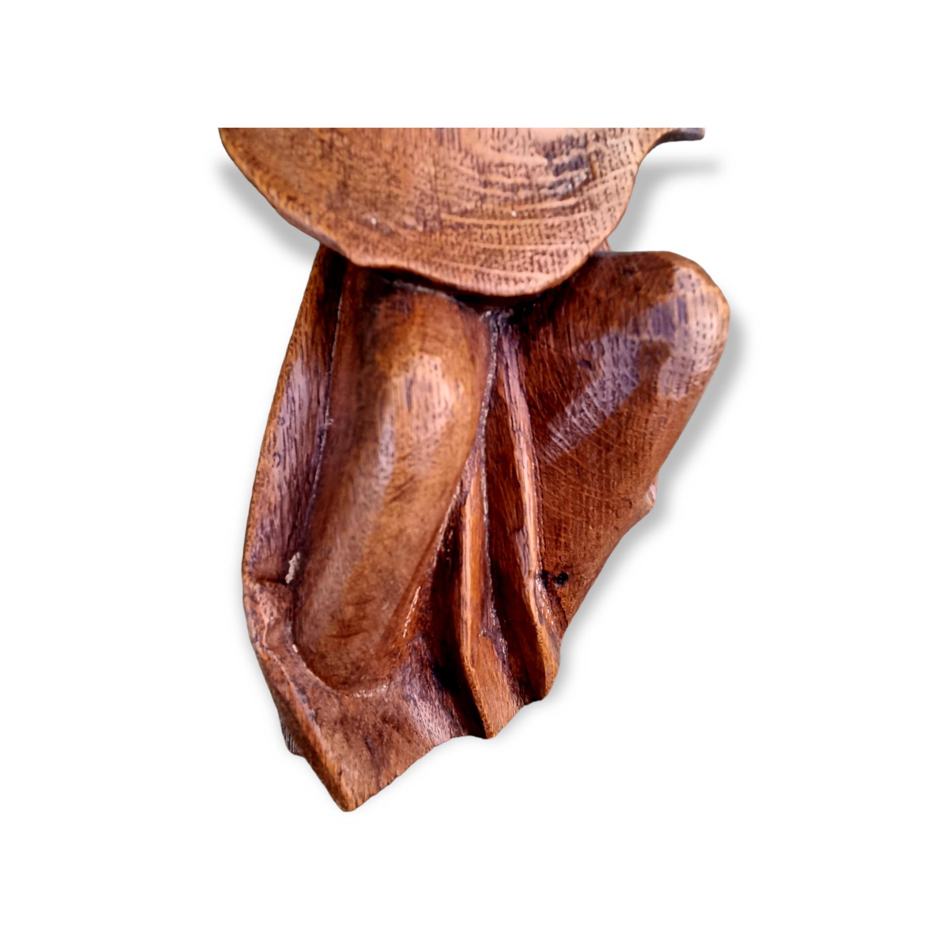 The oak retains a dry, aged patina with traces of early toolwork and surface wear. The shield may have once borne a painted or gilded emblem, now lost to time. Likely part of a larger ecclesiastical ensemble or architectural setting, the figure carries both spiritual and symbolic weight.