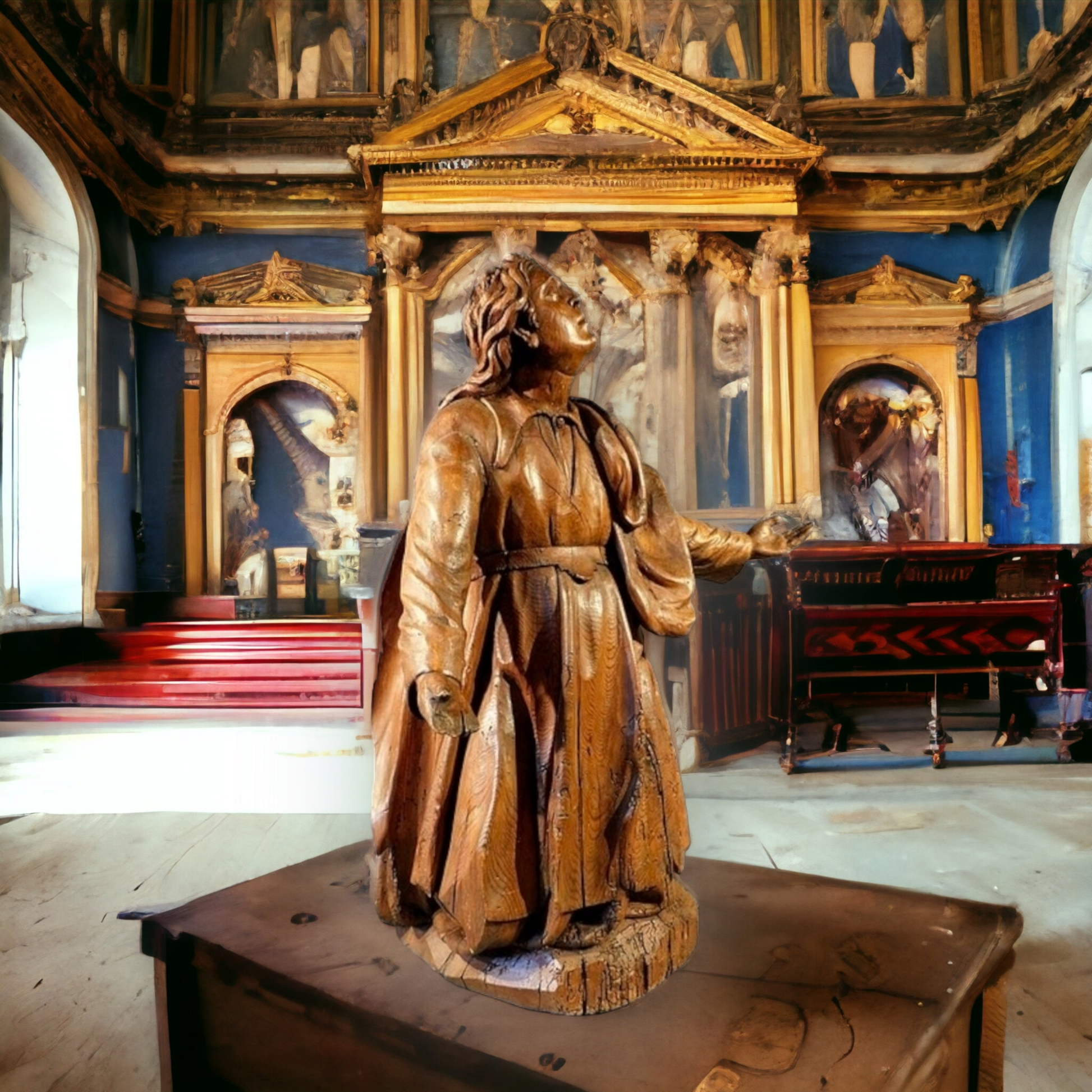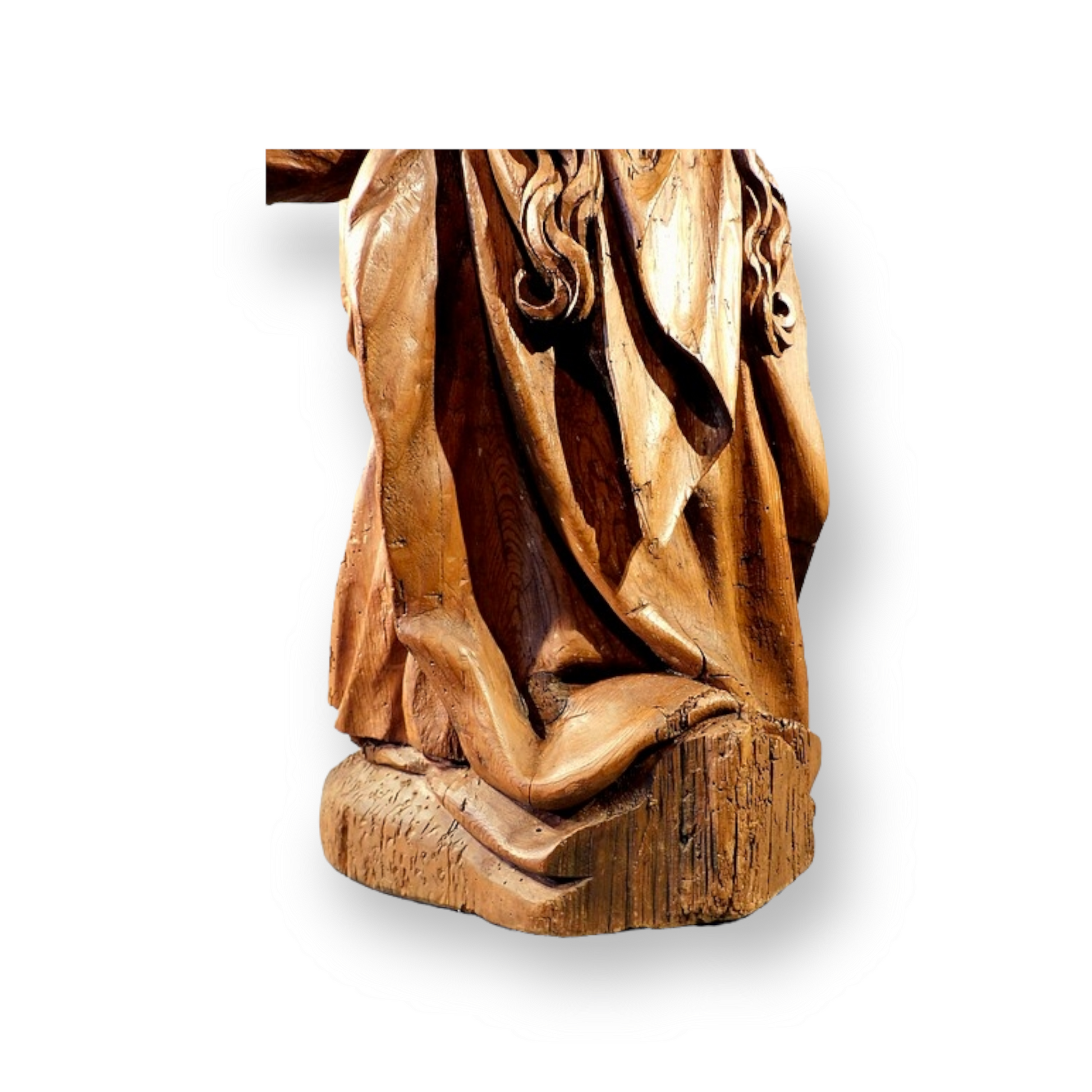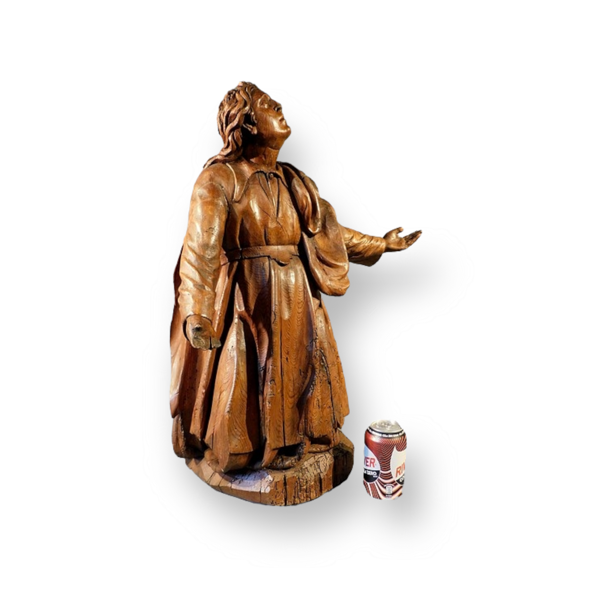 An early 17thC antique carved pine sculpture depicting Mary Magdalene kneeling. This sculpture once formed part of a larger figure group where she would have been portrayed kneeling at the Cross of Christ following his crucifixion.