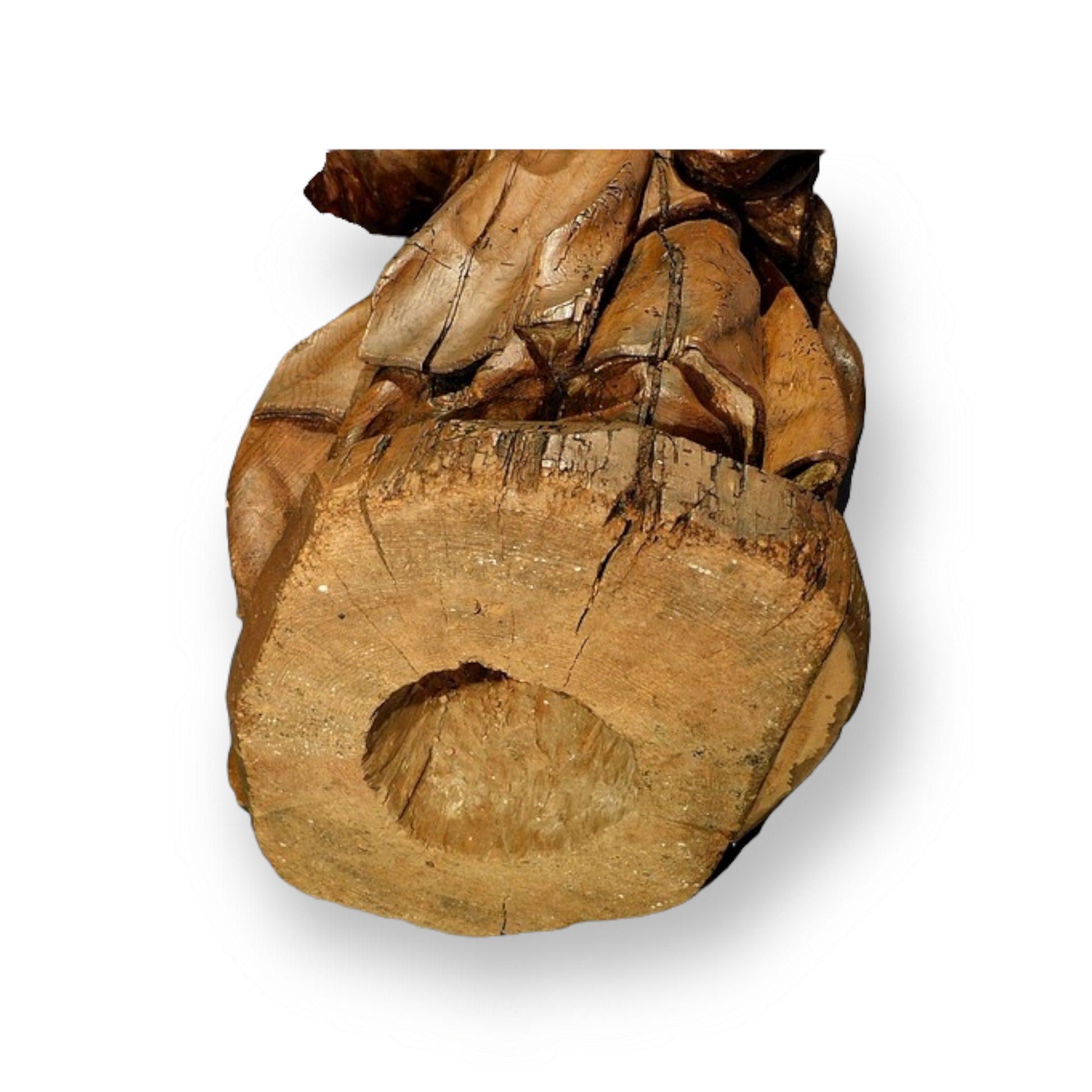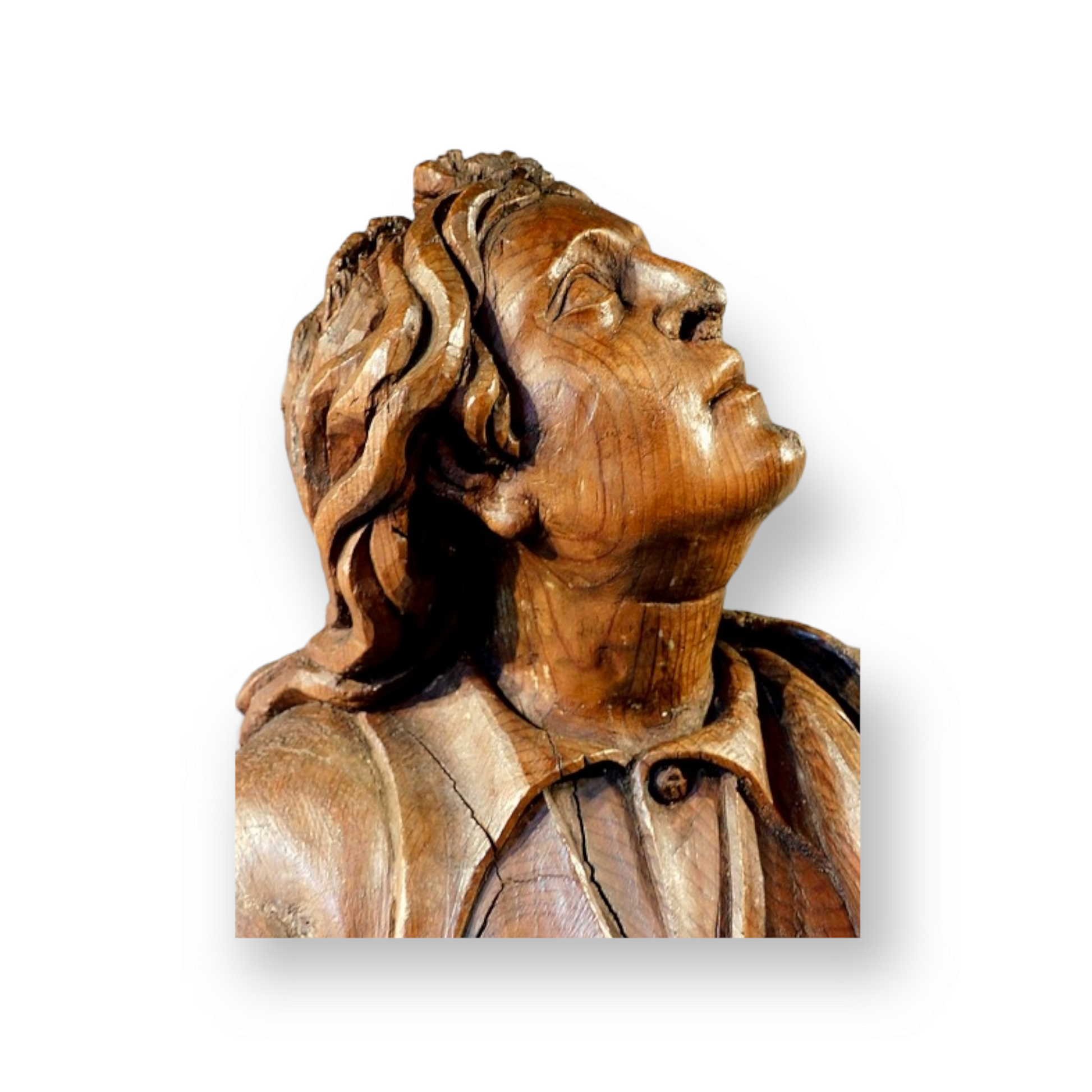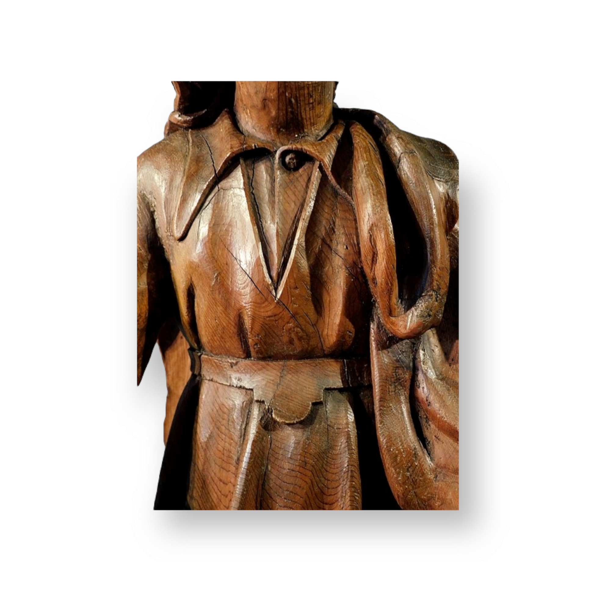 An early 17thC antique carved pine sculpture depicting Mary Magdalene kneeling. This sculpture once formed part of a larger figure group where she would have been portrayed kneeling at the Cross of Christ following his crucifixion.