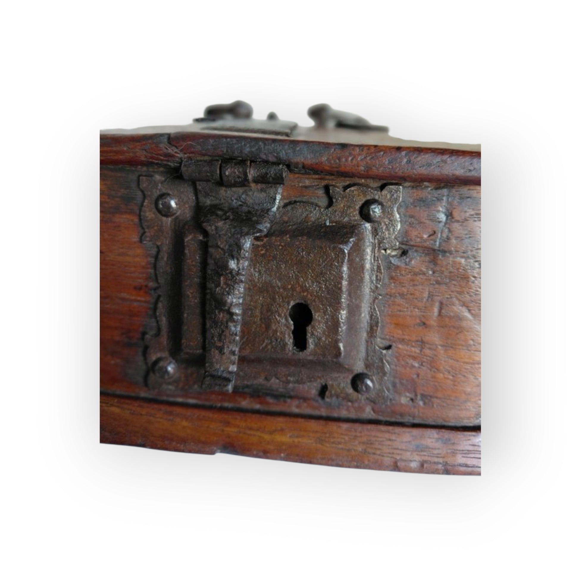 The surface has developed a rich, centuries‑old patina, with the timber and ironwork showing the gentle irregularities and tool marks that define genuine 17th‑century craftsmanship. Early bentwood boxes of this form are increasingly scarce, and this example carries a quiet authority that only true age can bestow.