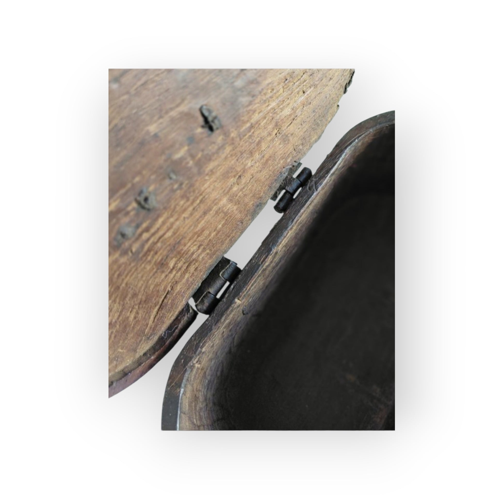 This evocative 17th‑century bentwood box is a superb survival from the early modern / Baroque period, crafted in solid timber and shaped using traditional bentwood techniques. The domed lid, original swing handle, and hand‑forged iron hasp are all characteristic of the era, when such boxes were used to safeguard documents, coins, and personal effects both at home and on the road.