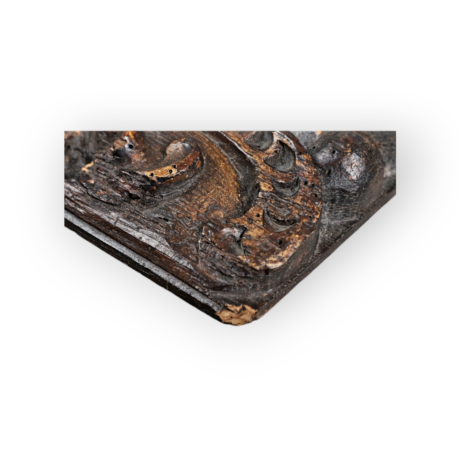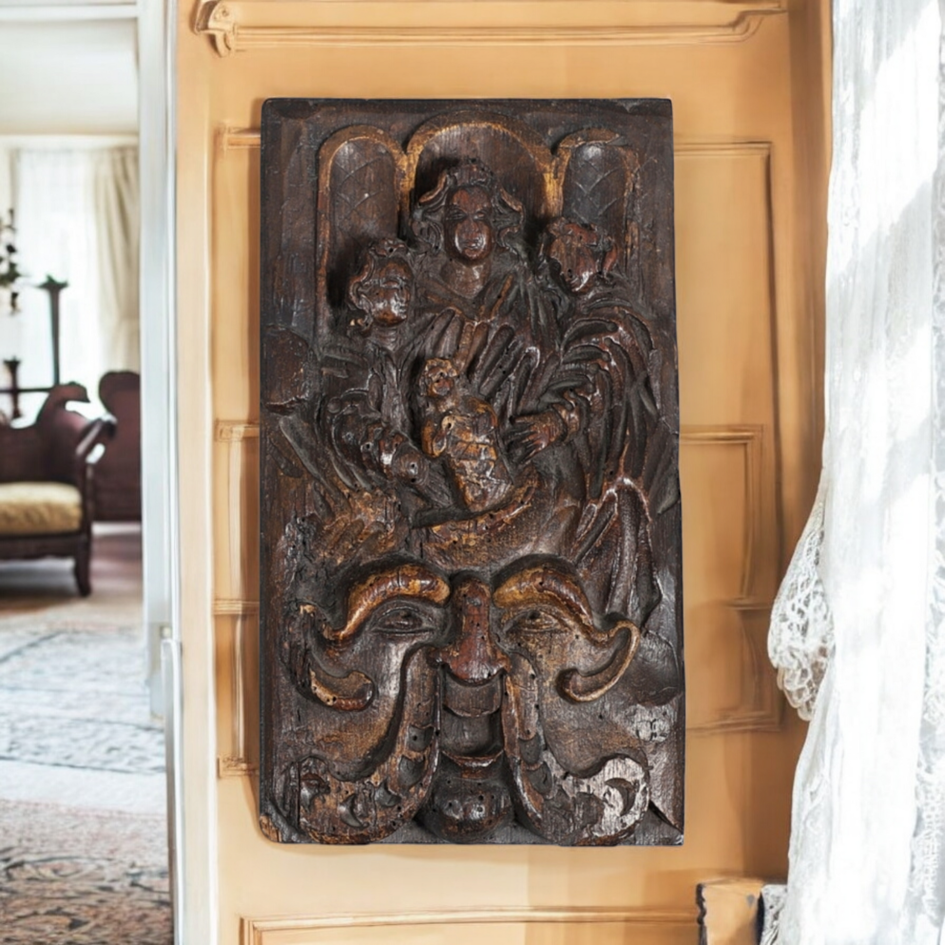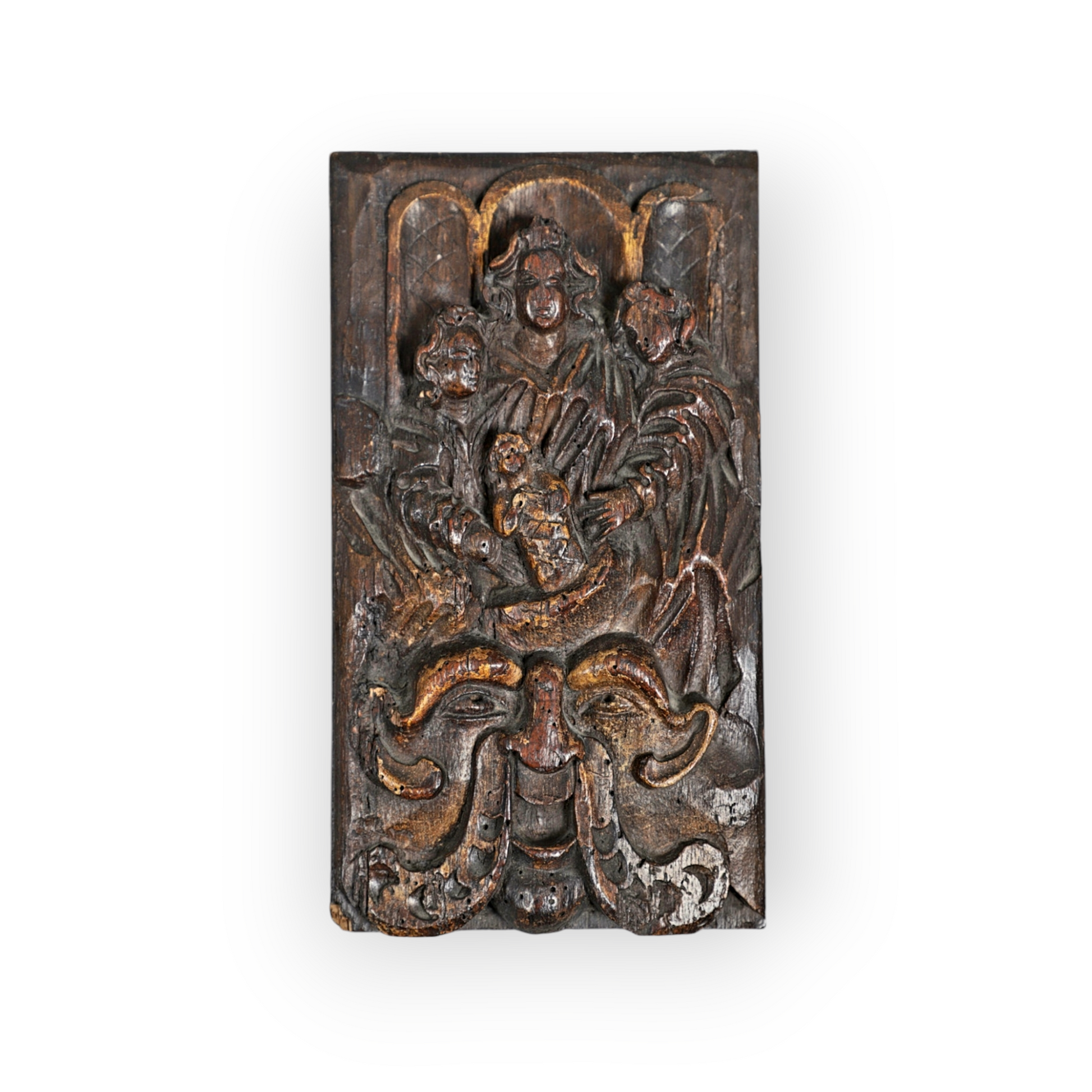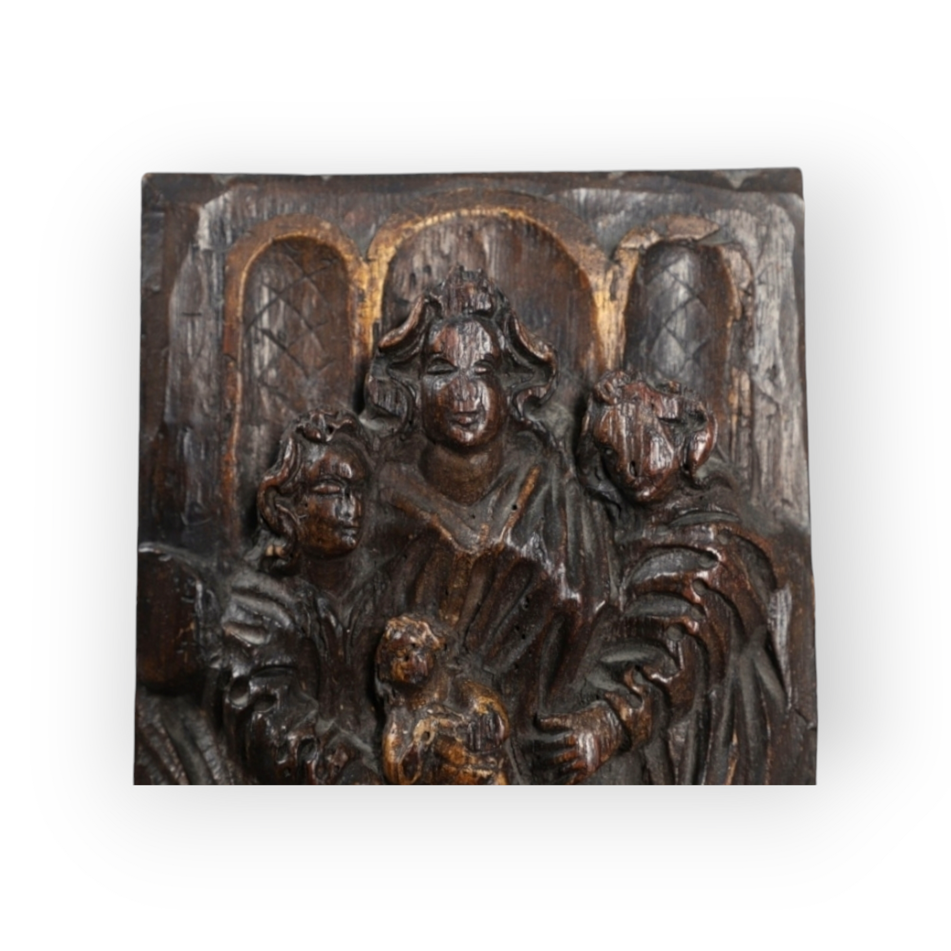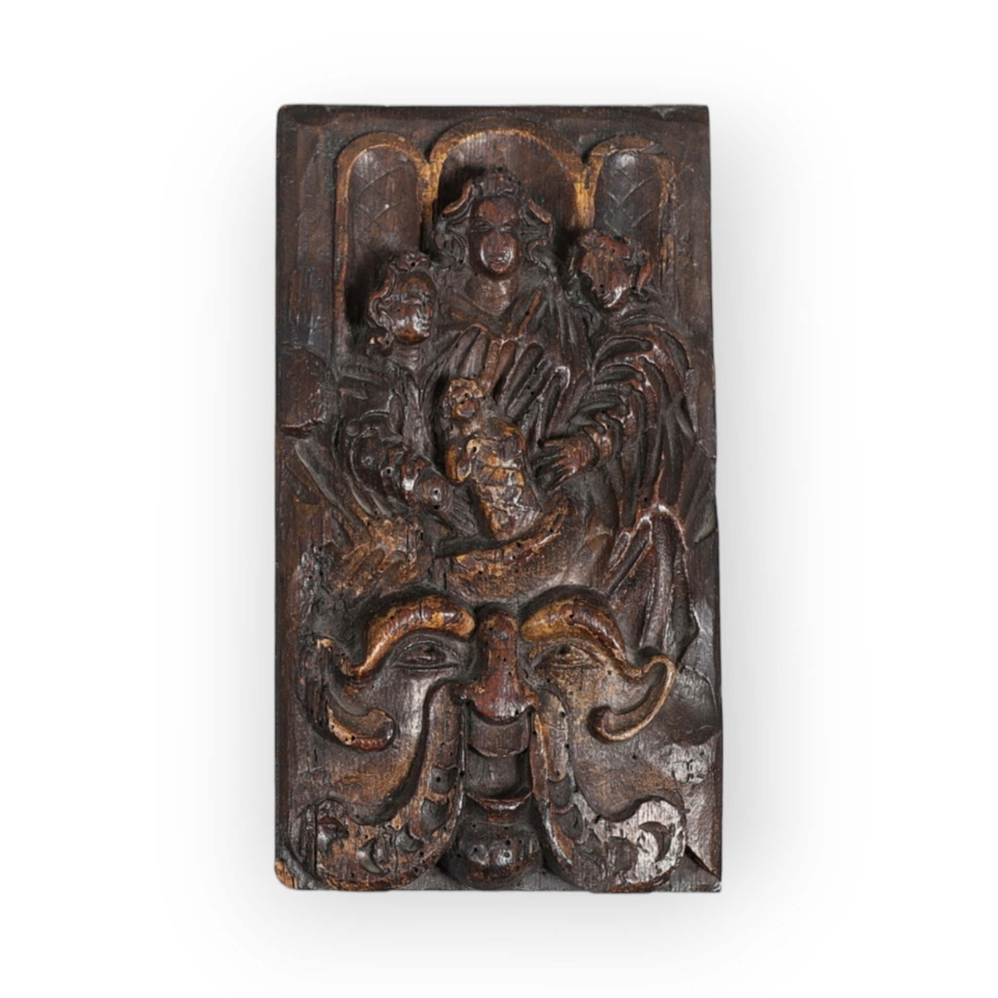 An early 17th-Century antique carved oak panel depicting The Virgin, Holy Infant & Two Other Figures, Possibly St. Helena and St. Francis Above A Green Man