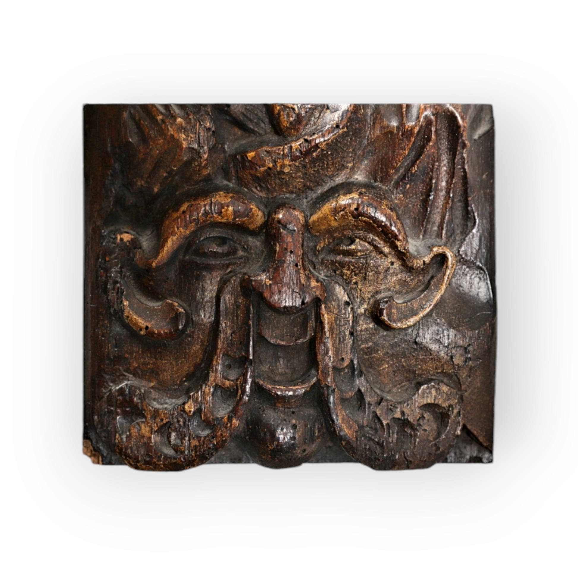 The panel with nulled decoration to the pediment over four carved figures and unusually below, a mask carved in the form of a Green Man.