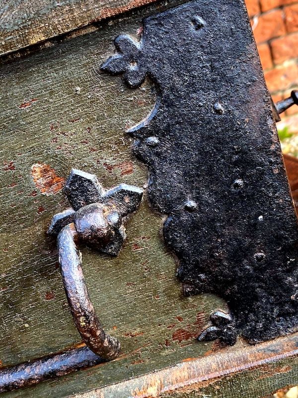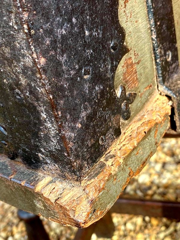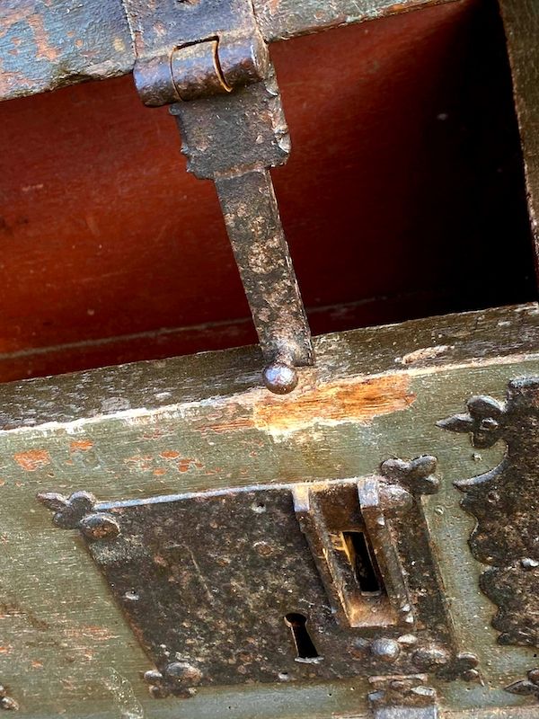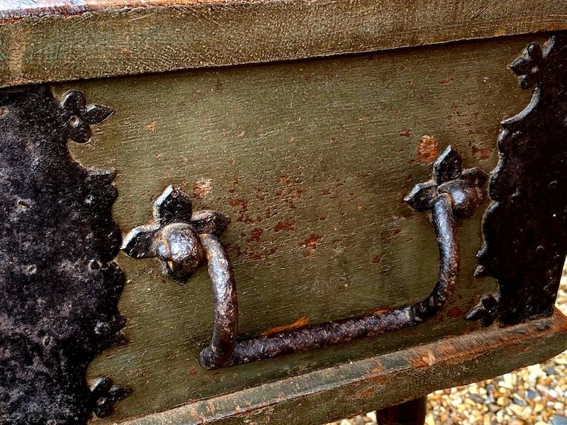 A 17thC Dutch antique box in its original paint with twin locks, two carry handles and iron strapwork and bindings with gothic decoration.