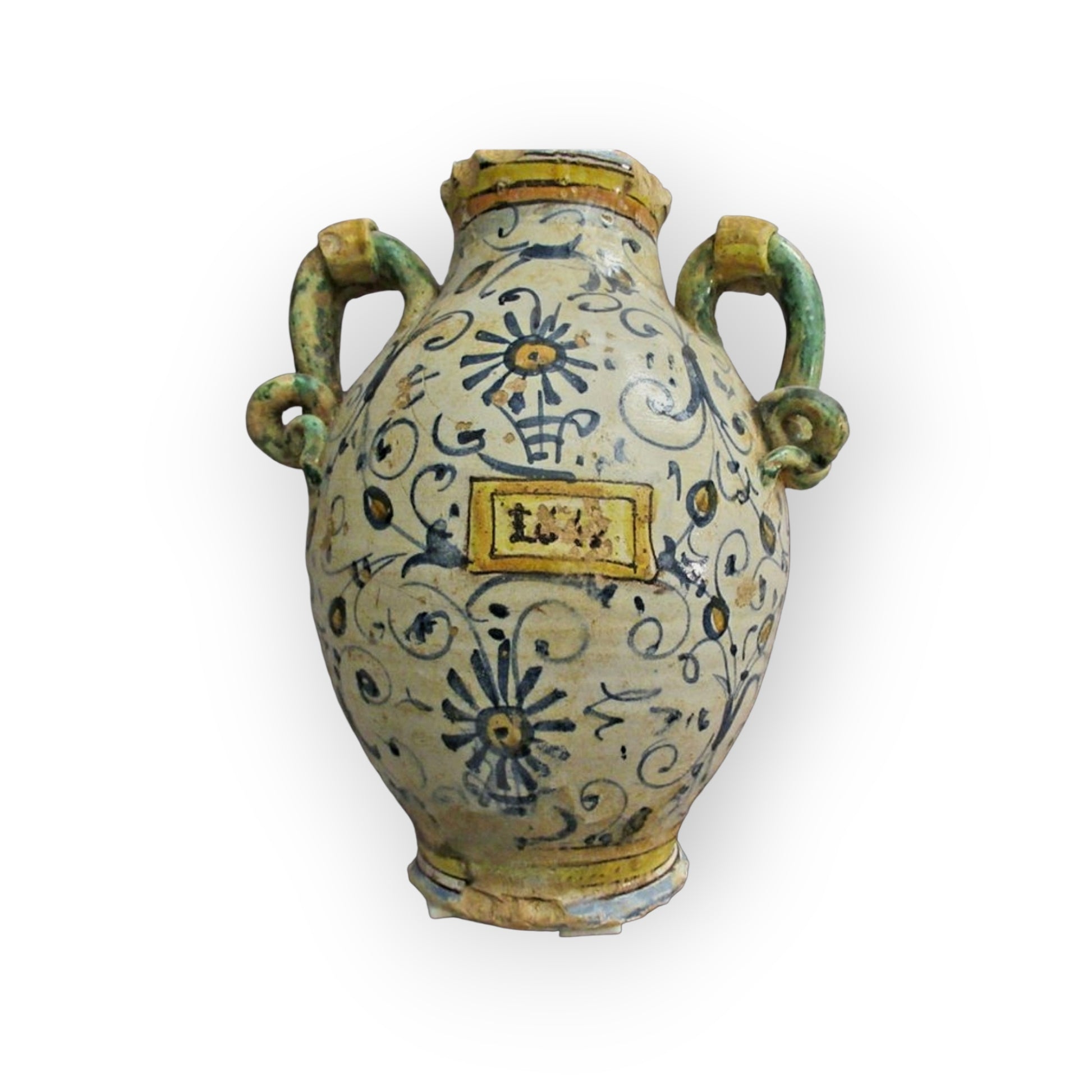 This piece is not only a rare survival of early pharmaceutical ware, but also a devotional object — a fusion of faith, science, and craftsmanship. Its sculptural presence and iconography make it a museum‑worthy addition to any collection of Italian majolica, religious art, or early medical history.