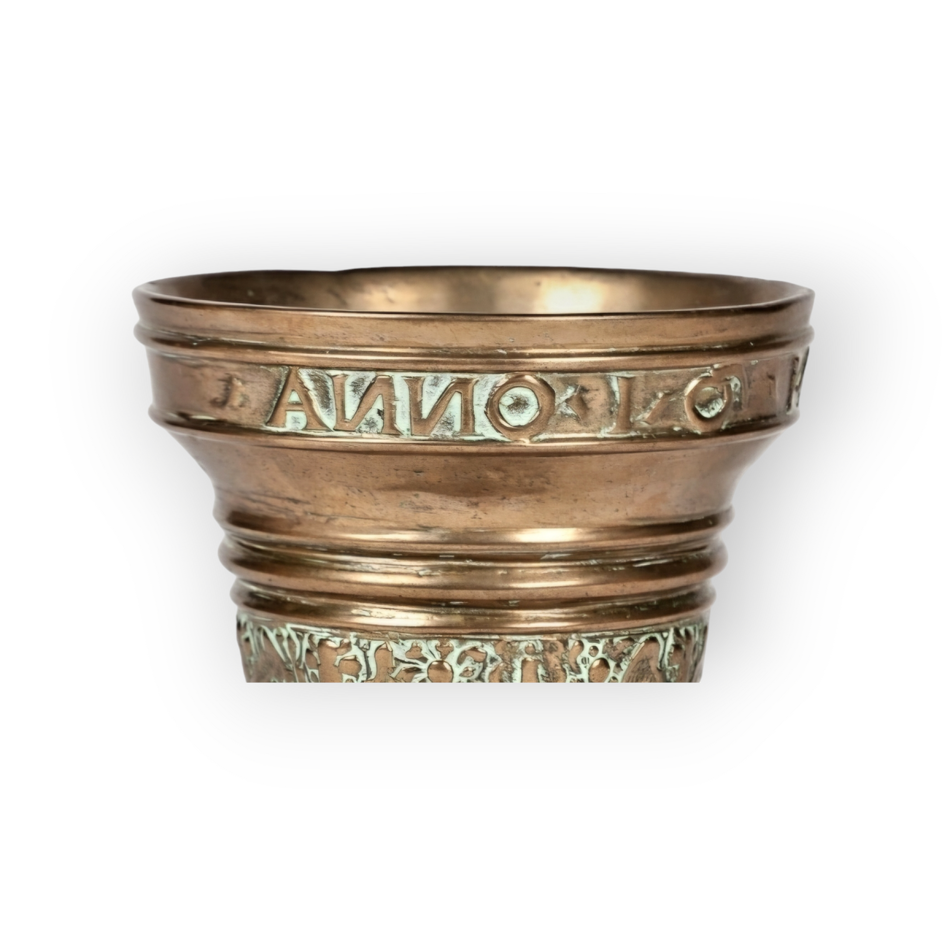 An early 17th-century English antique bronze mortar dating back to the reign of King James I of England, and dated "1614".