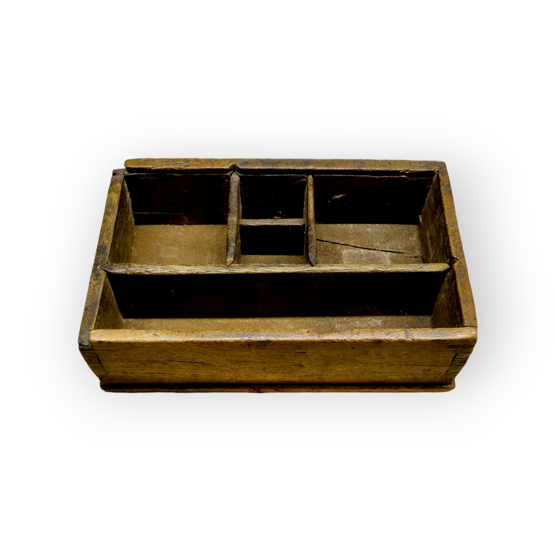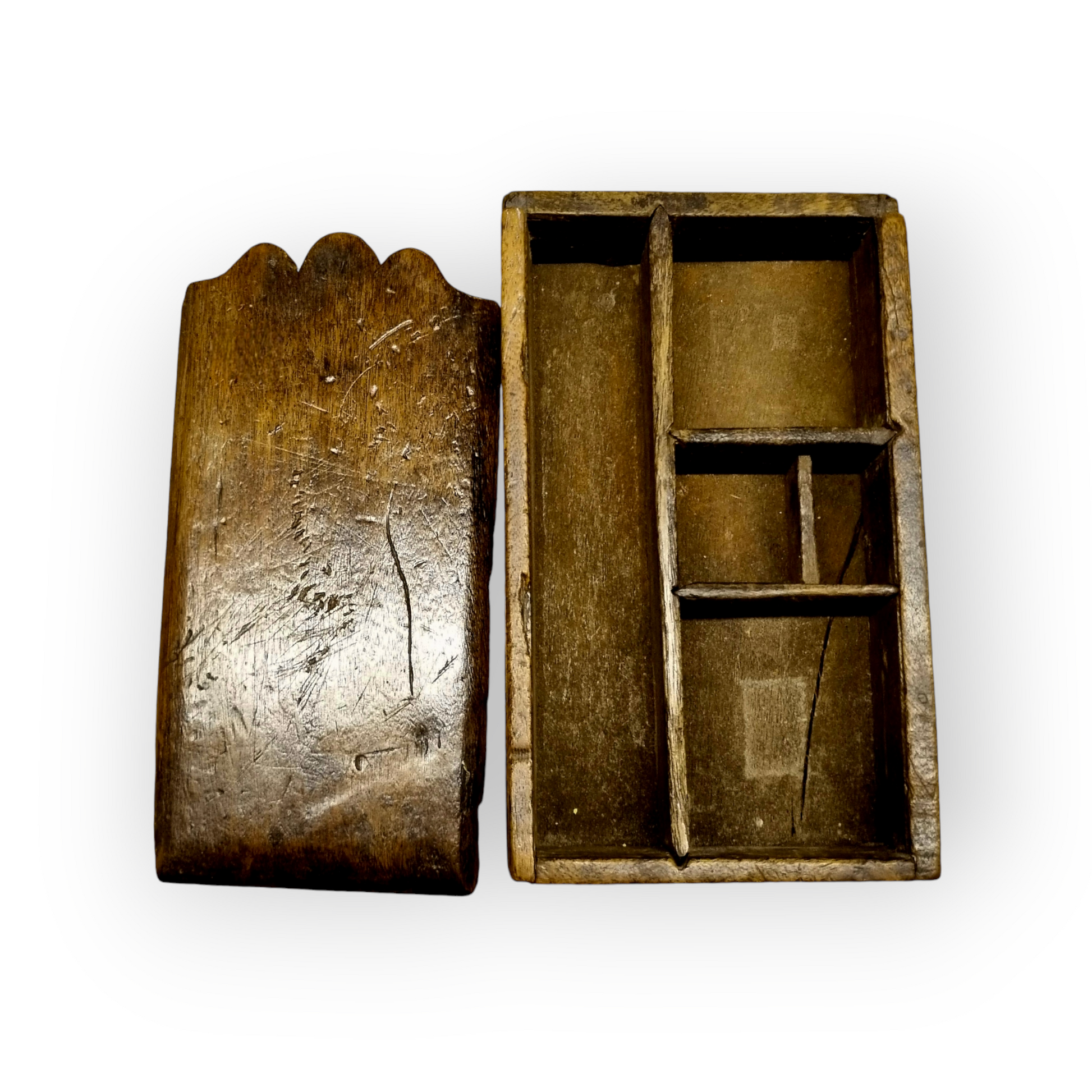 The slide-out lid, with shaped pediment pulls out to reveal a compartmentalised interior.