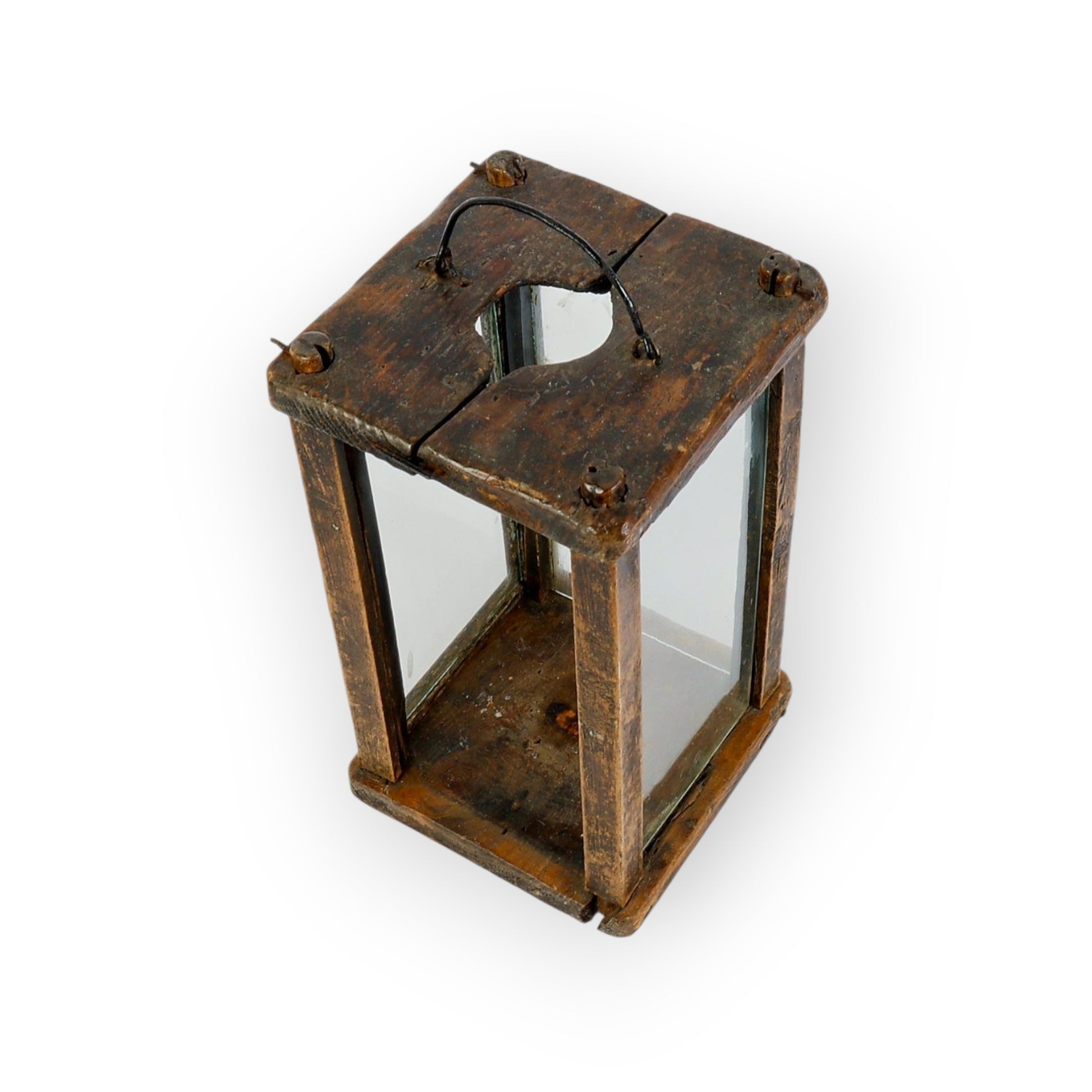 An early 18th-century primitive antique treen (wooden) lantern with four glazed panels.
