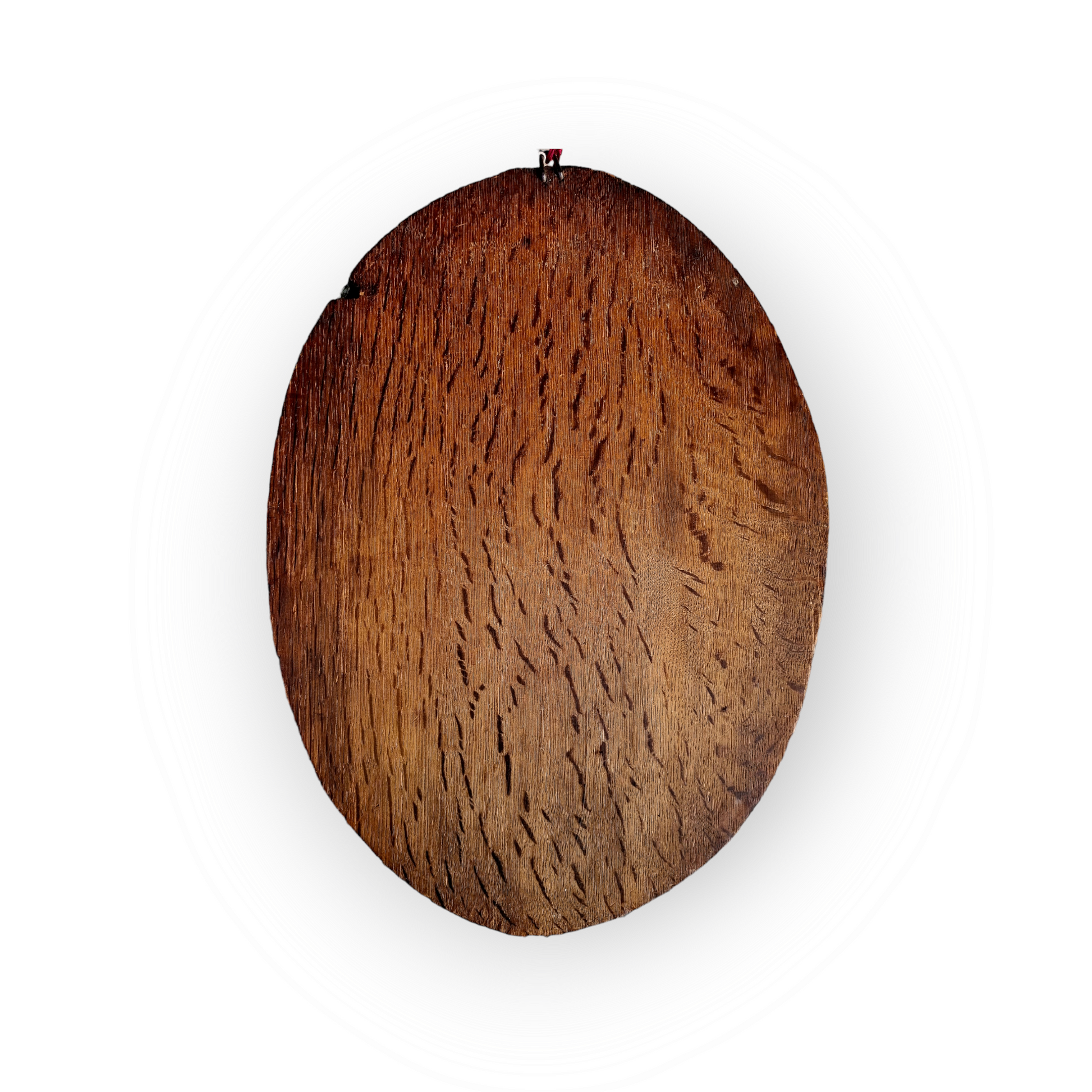 A well patinated early 19th Century antique carved oak vintners panel of oval form.