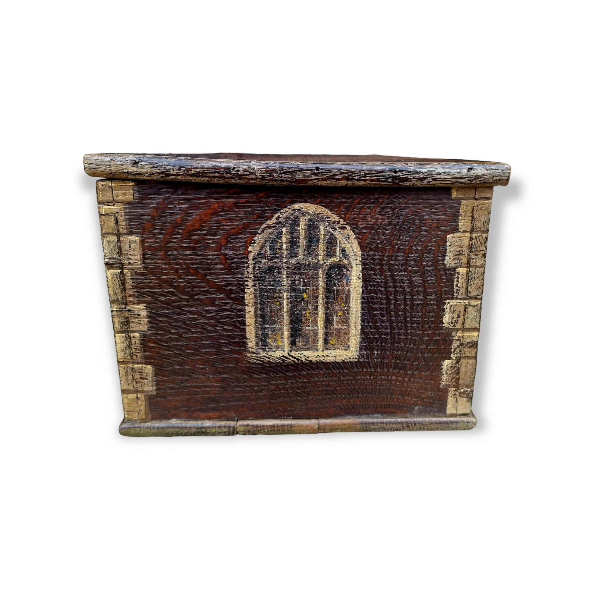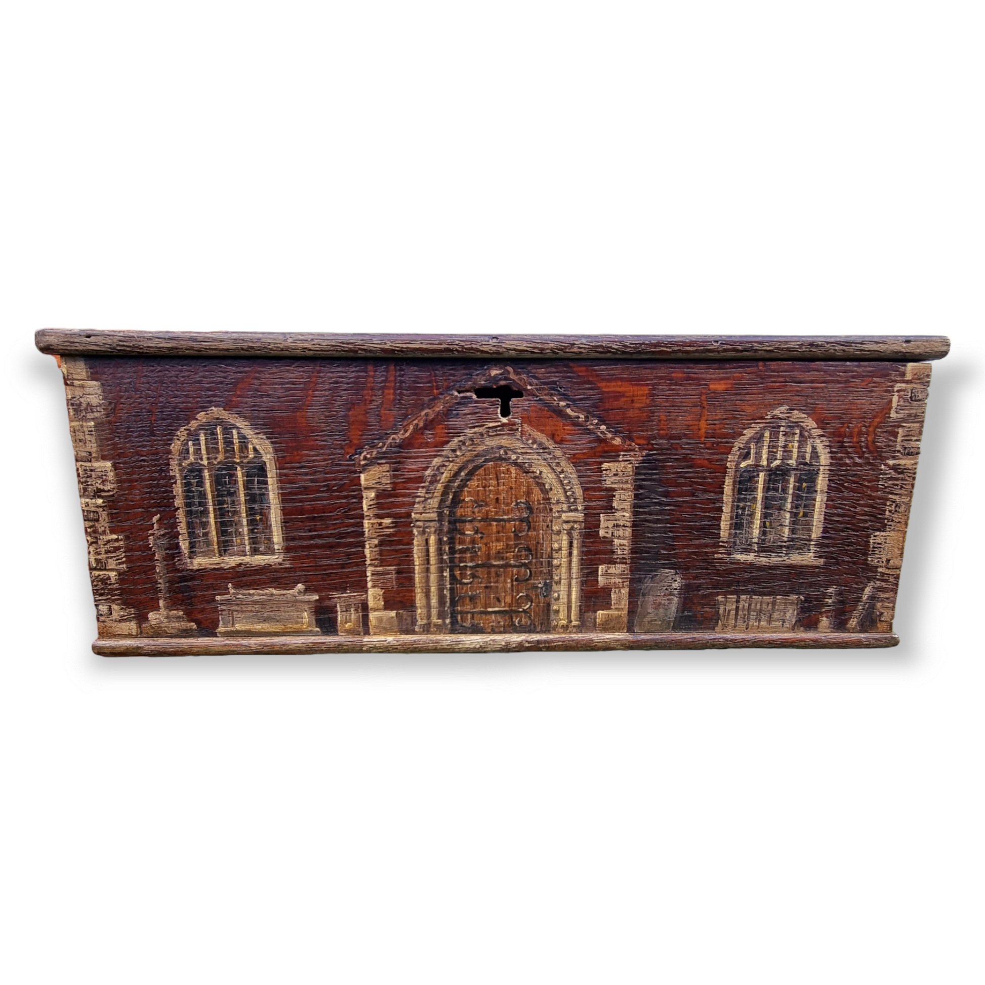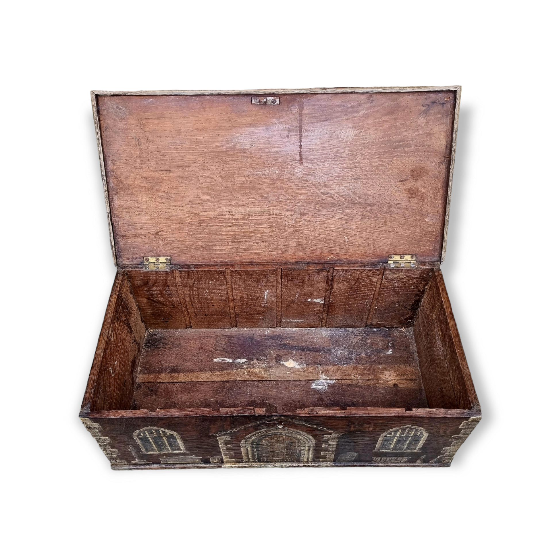 Early 19th Century English Antique Oak Boarded Box With Folk Art Painted Gothic Scene