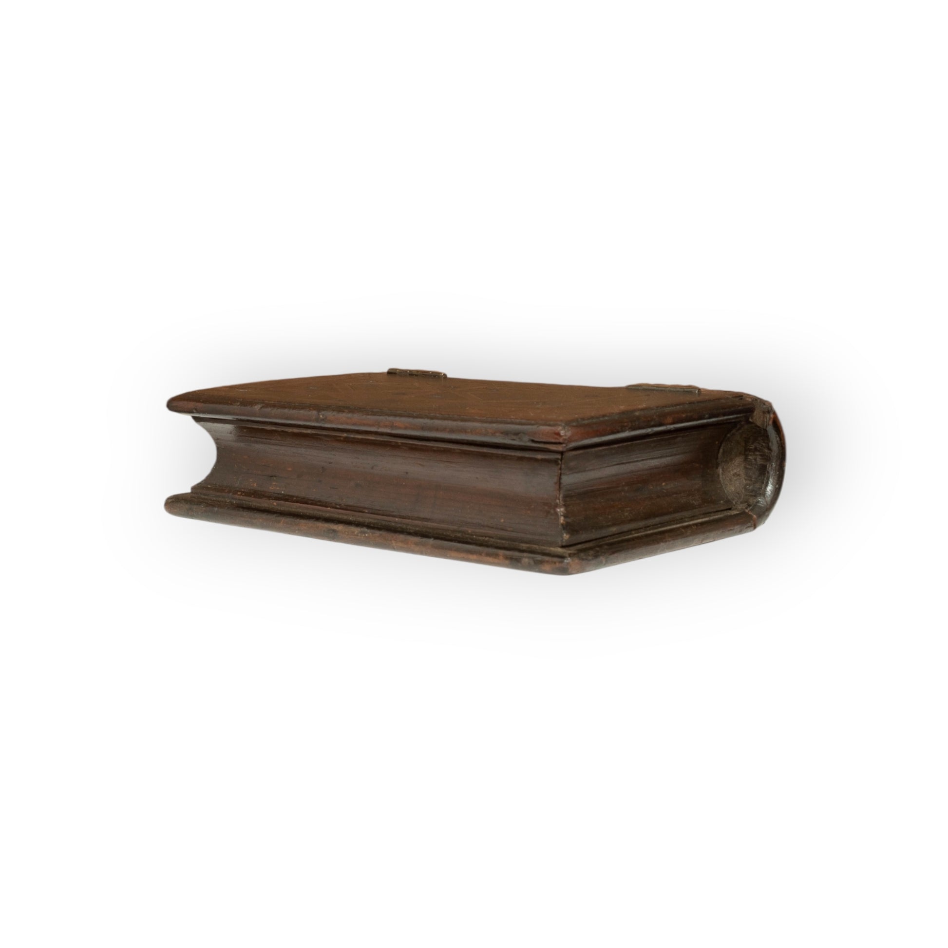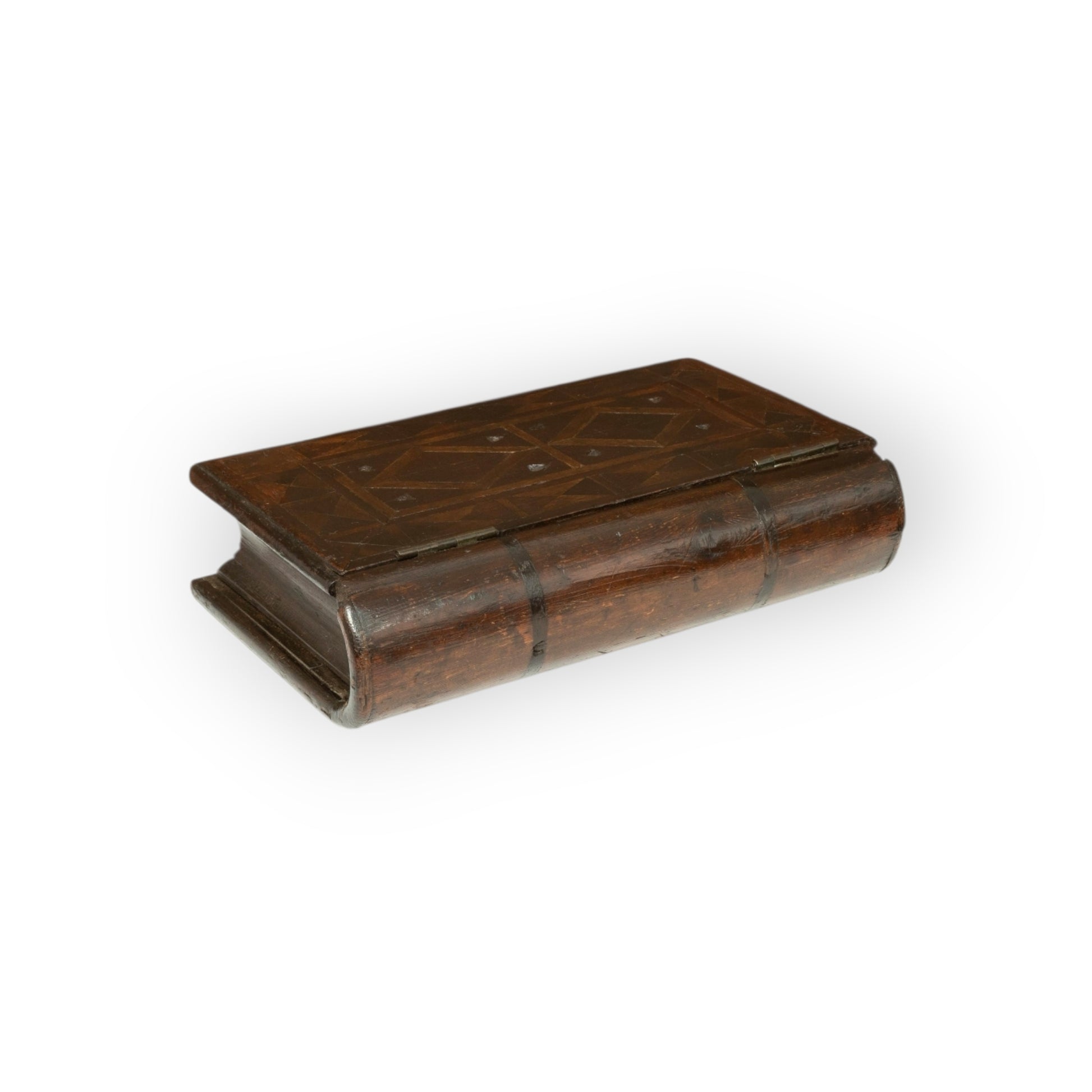 A beautifully made early 19th‑century English treen book box, crafted to imitate a finely bound volume. The hinged lid is geometrically inlaid with various specimen timbers, highlighted with delicate chip‑carving that catches the light and gives the surface real depth. The semi‑circular “spine” is linearly inlaid, echoing the raised bands of a period leather binding, while the sides are shaped in a gentle convex curve, completing the illusion of a substantial antique book.