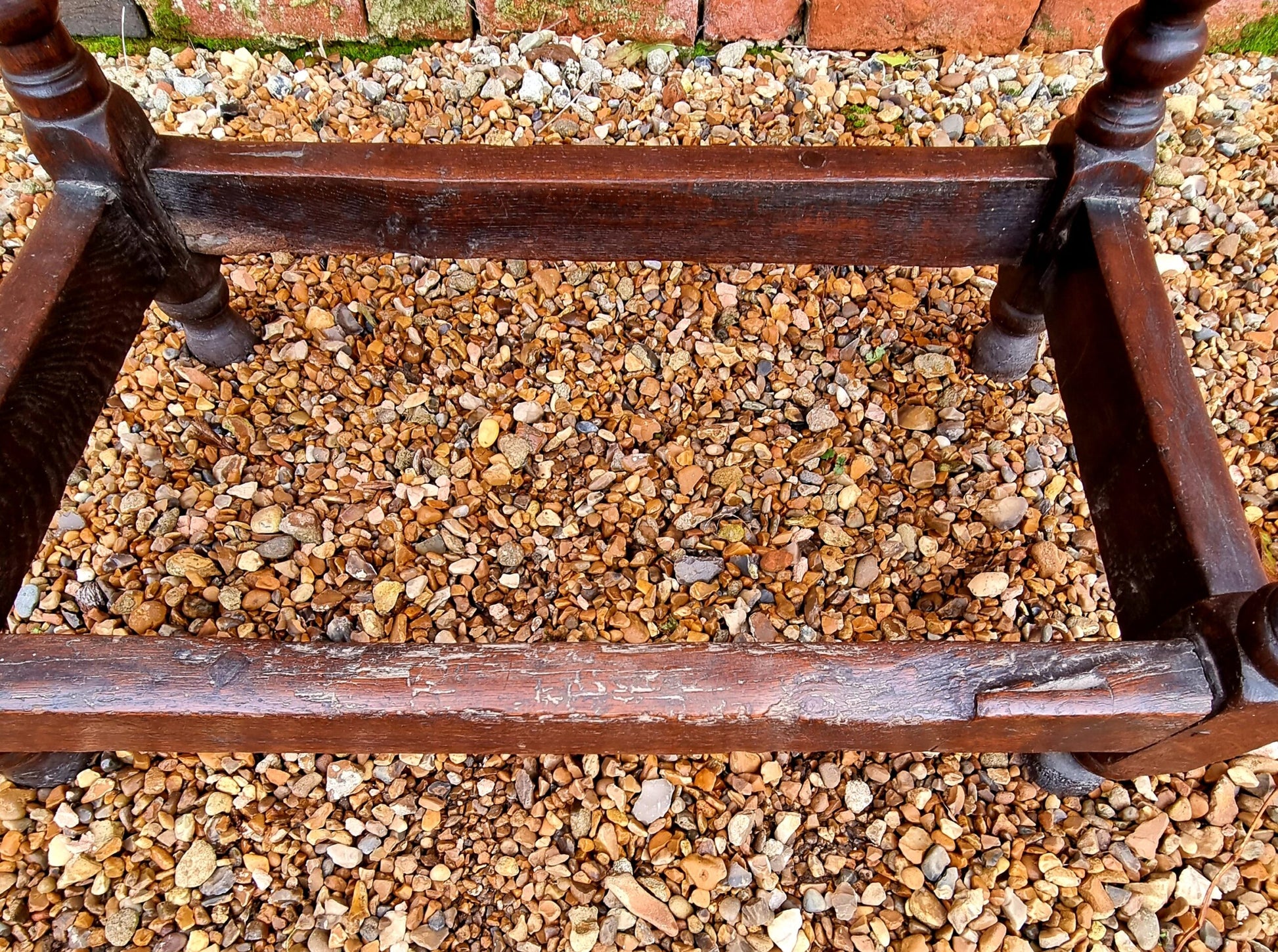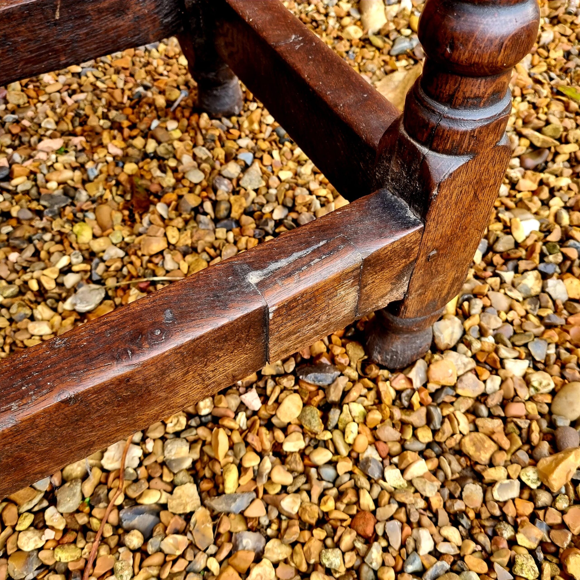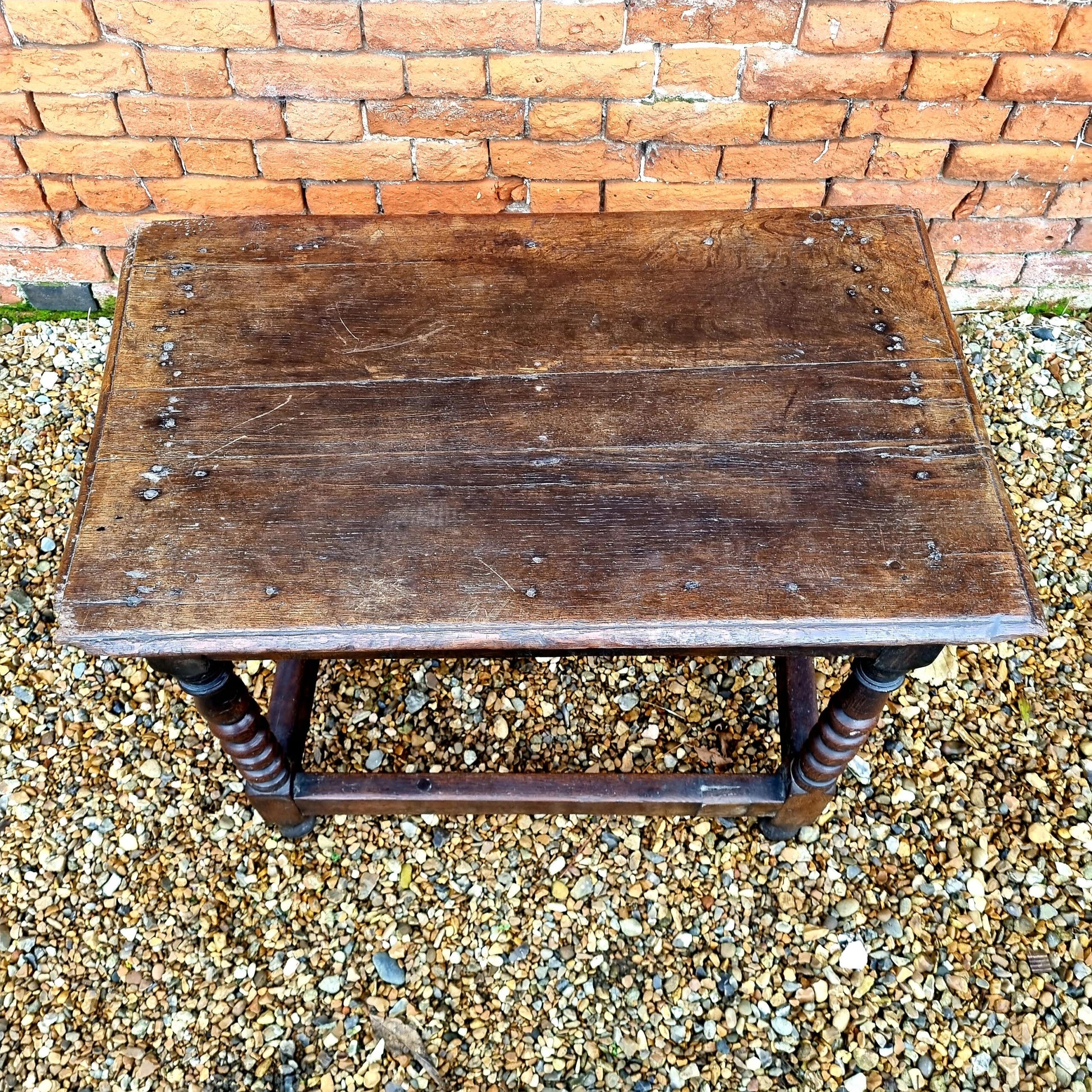 Condition - as per the images. All the joints are sound. This table is very useable and has rustic appeal. The two elongated stretchers have been infilled where the original rebates accommodated the "gates" when this table started life as a drop-leaf. There is a minor historic loss to the plank top as per the last image.