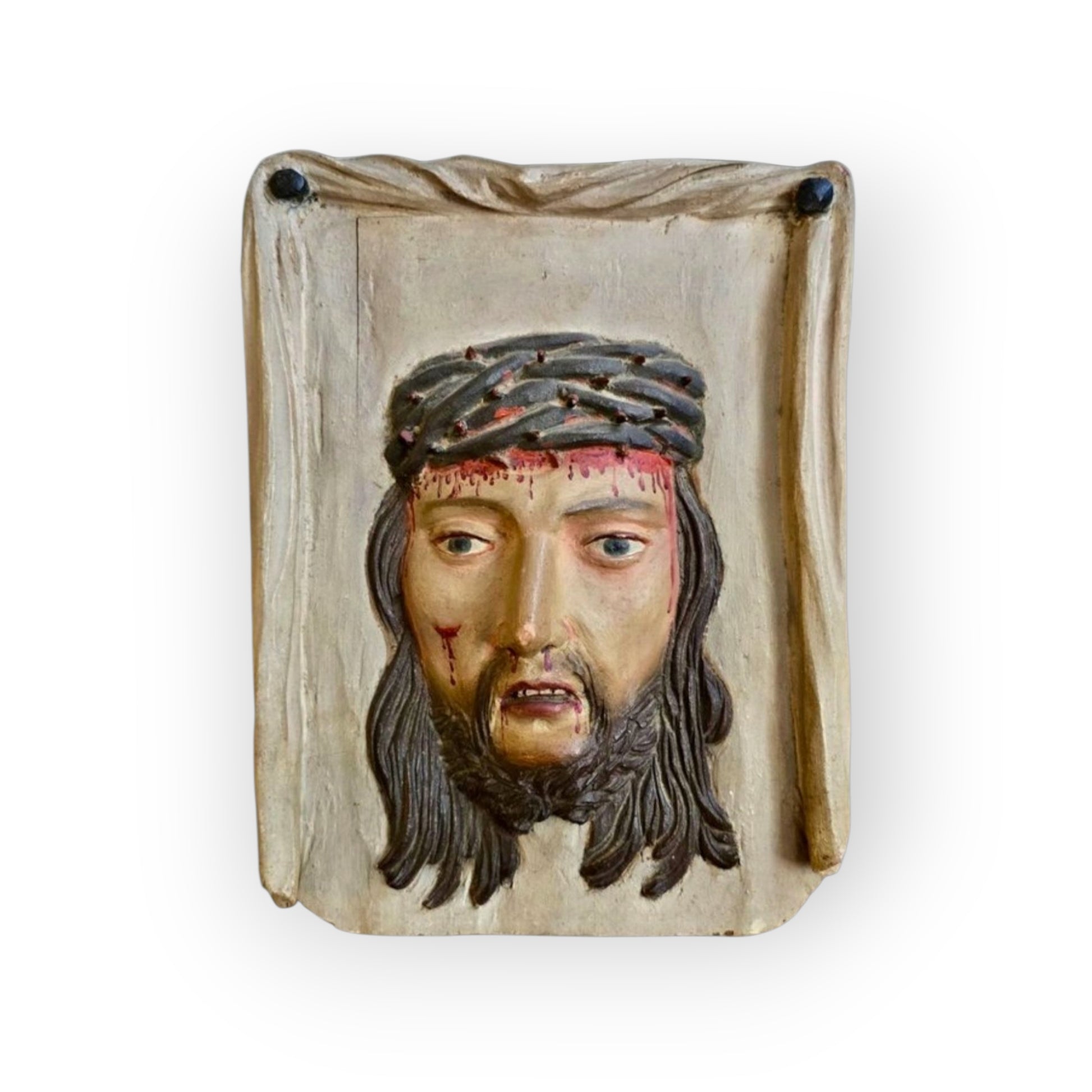 This finely hand-carved and hand-painted wooden relief depicts the face of Christ, crowned with thorns, an image traditionally known as Ecce Homo (“Behold the Man”). Probably of Tyrolean or Bavarian origin, dating to around 1750, the piece embodies the highest order of devotional craftsmanship.