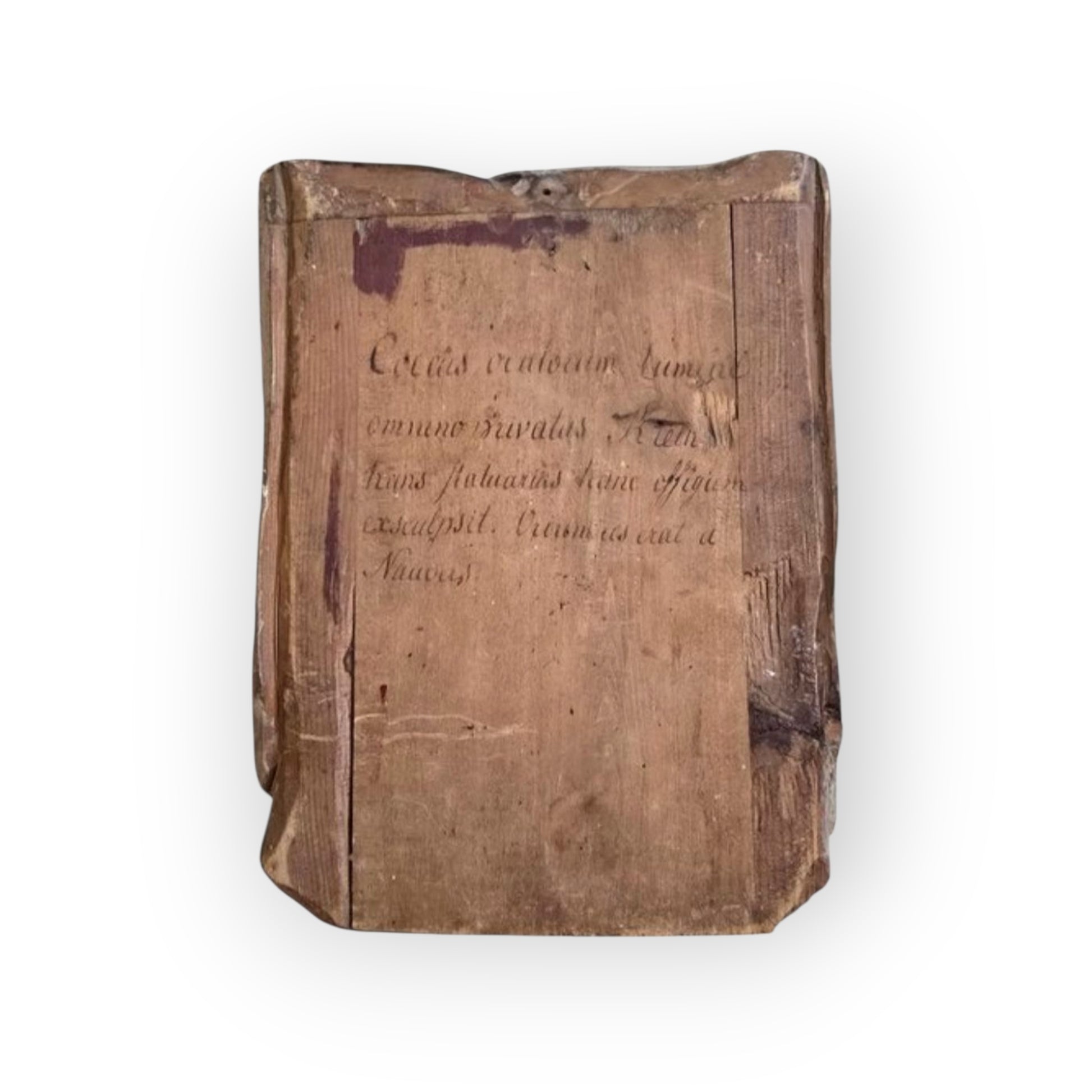 The carving shows remarkable detail in the features, enhanced by traces of the original polychromy and softened by a warm, aged patina. On the reverse, a Latin inscription reads: “Cœlitus oratorum lumine comitante favente... Hans Stalwartis hanc effigiem exsculpsit. Ornamenta erat et Navous.”