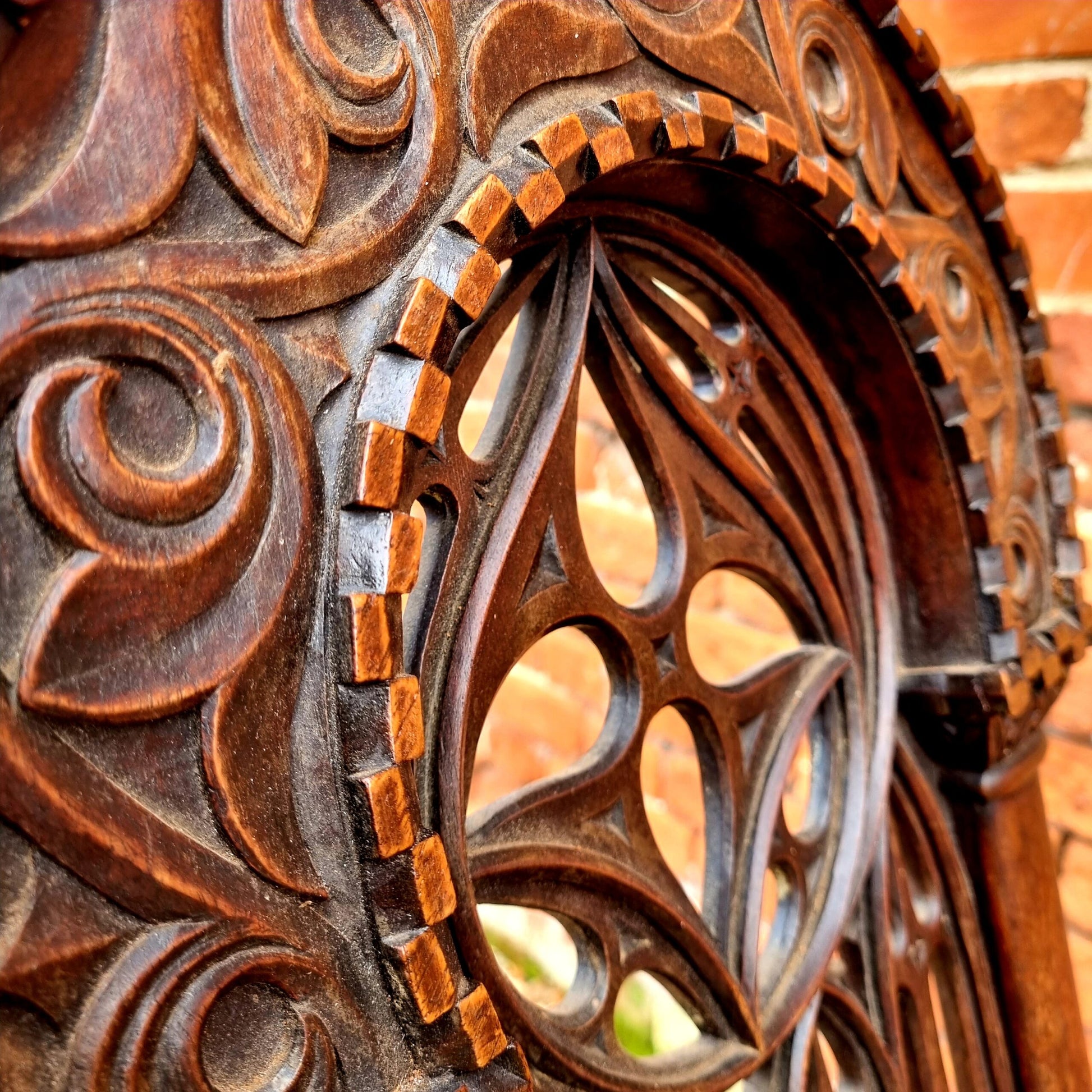 Both chairs are identical. The back support has an arching cresting rail, inset with carved-scrolling foliate detail. The edges are decorated with dentil moulding. Set above a tracery panel with a large roundel incorporating daggers above elongated lancets, flanked by columns.