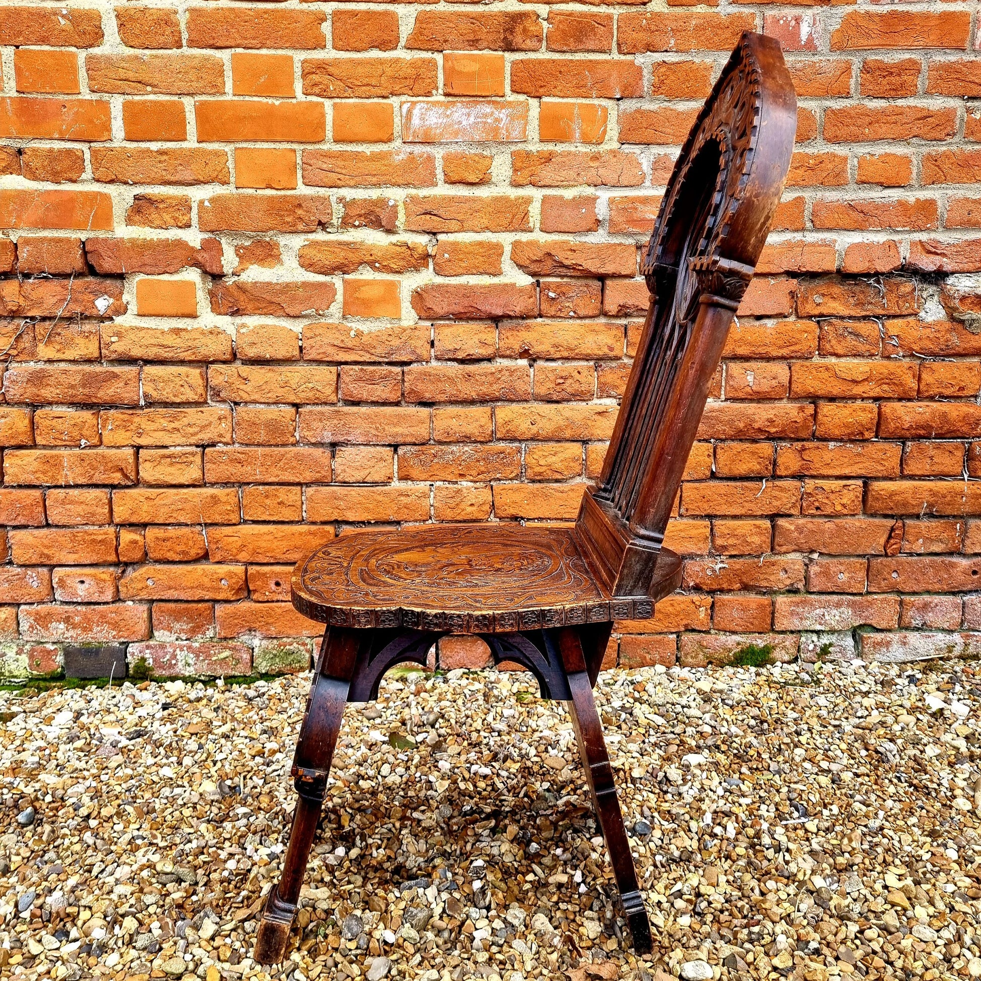 A rare pair of Mid-19th Century antique walnut Gothic revival hall chairs.