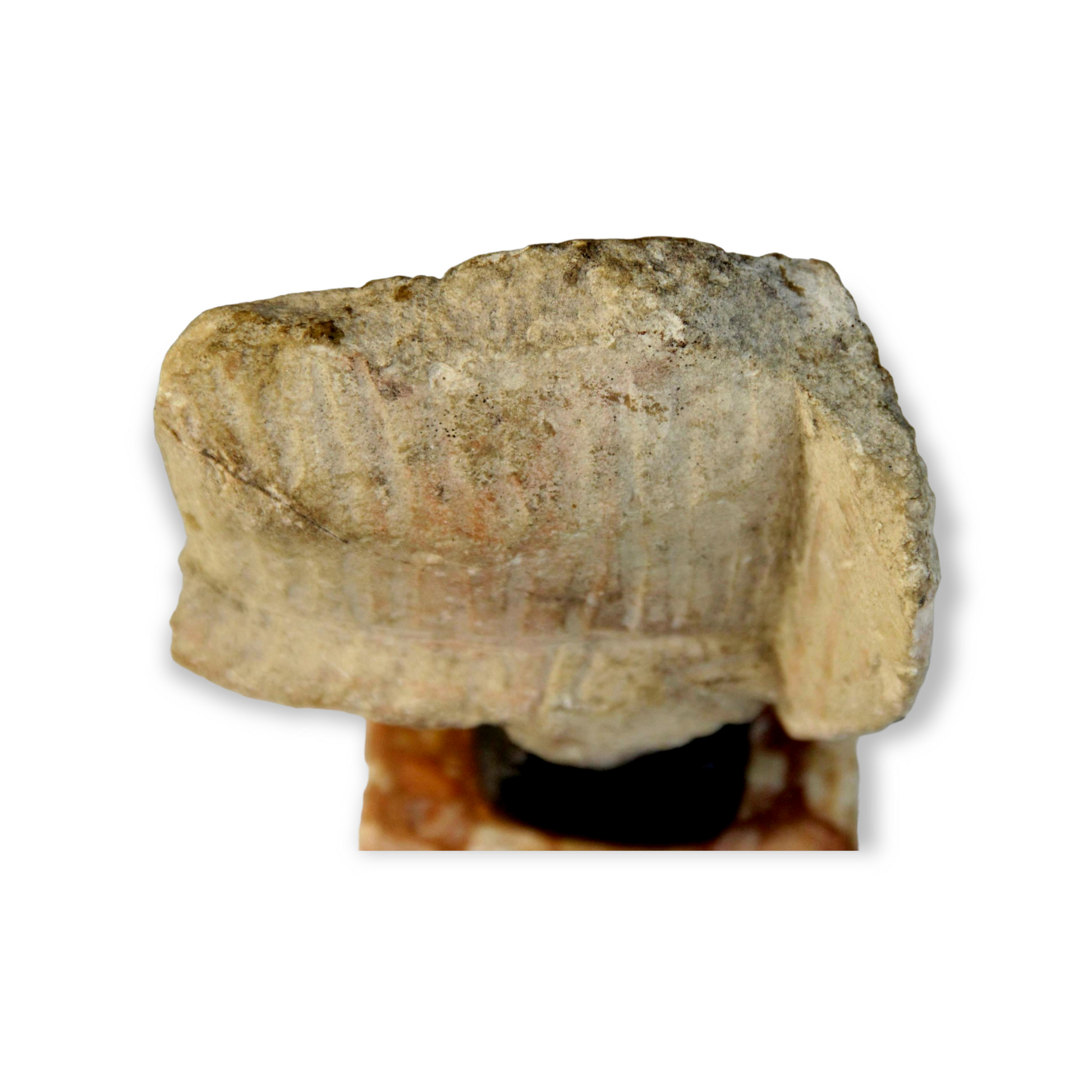 This carved classical limestone fragment collected on the Grand Tour depicts a male torso and has been attributed as Greco-Cypriot in origin, the drapery indicated by vertical incisions, the right hand folded across the body, circa 480 - 310 B.C (Classical Cyprus Period).