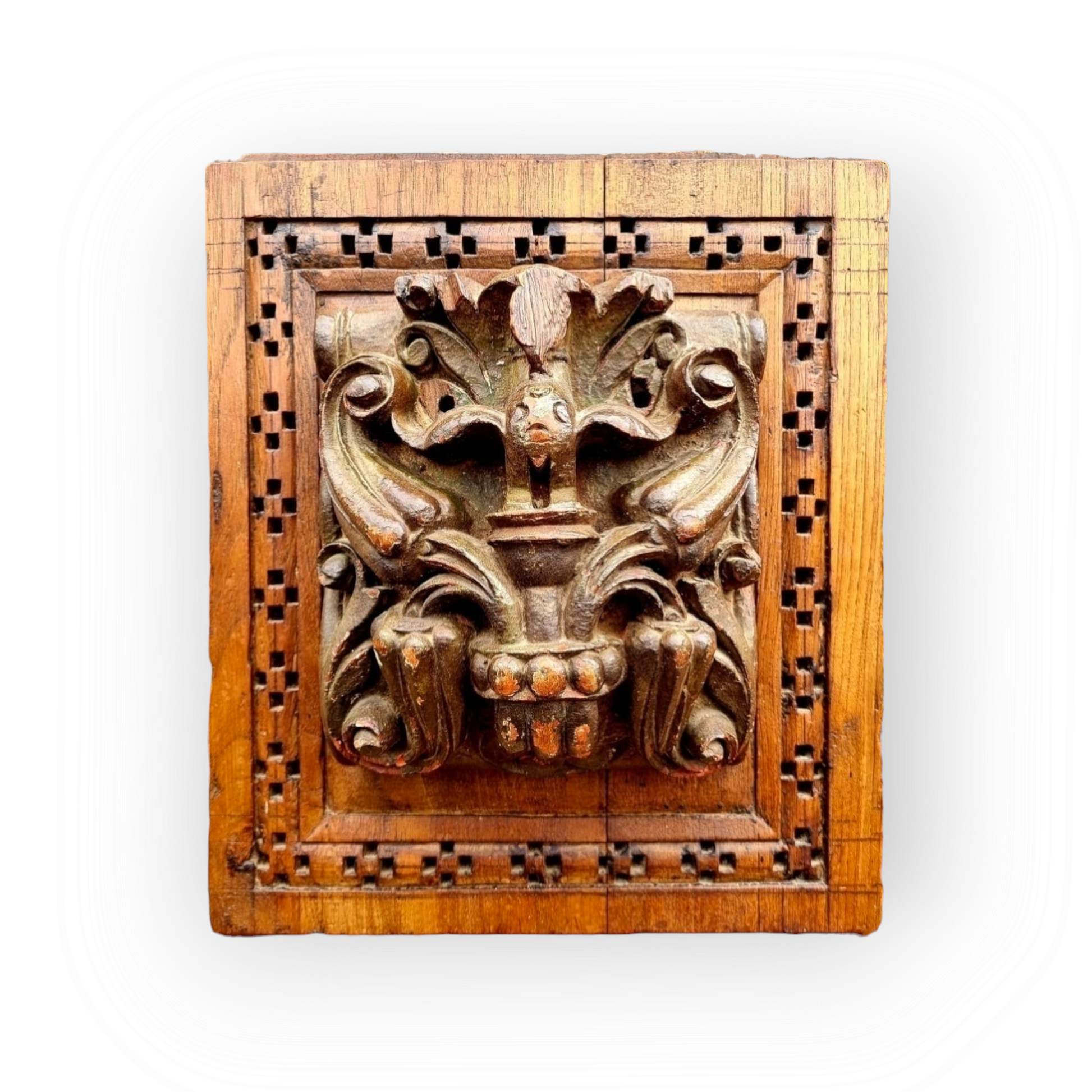 Mounted on a later oak backboard with chip carved decoration to the outer edges.