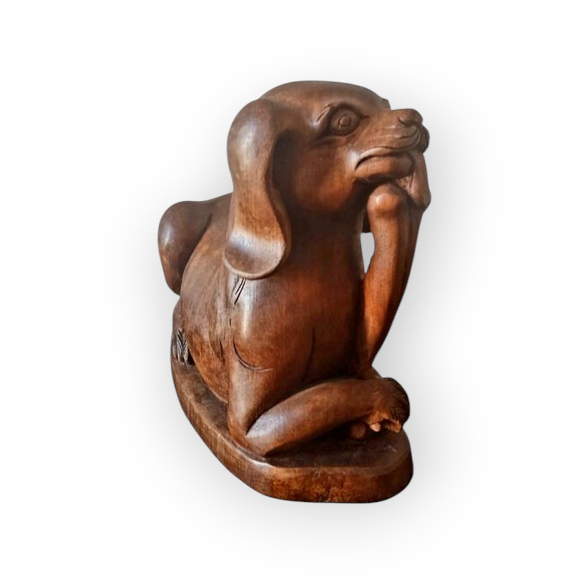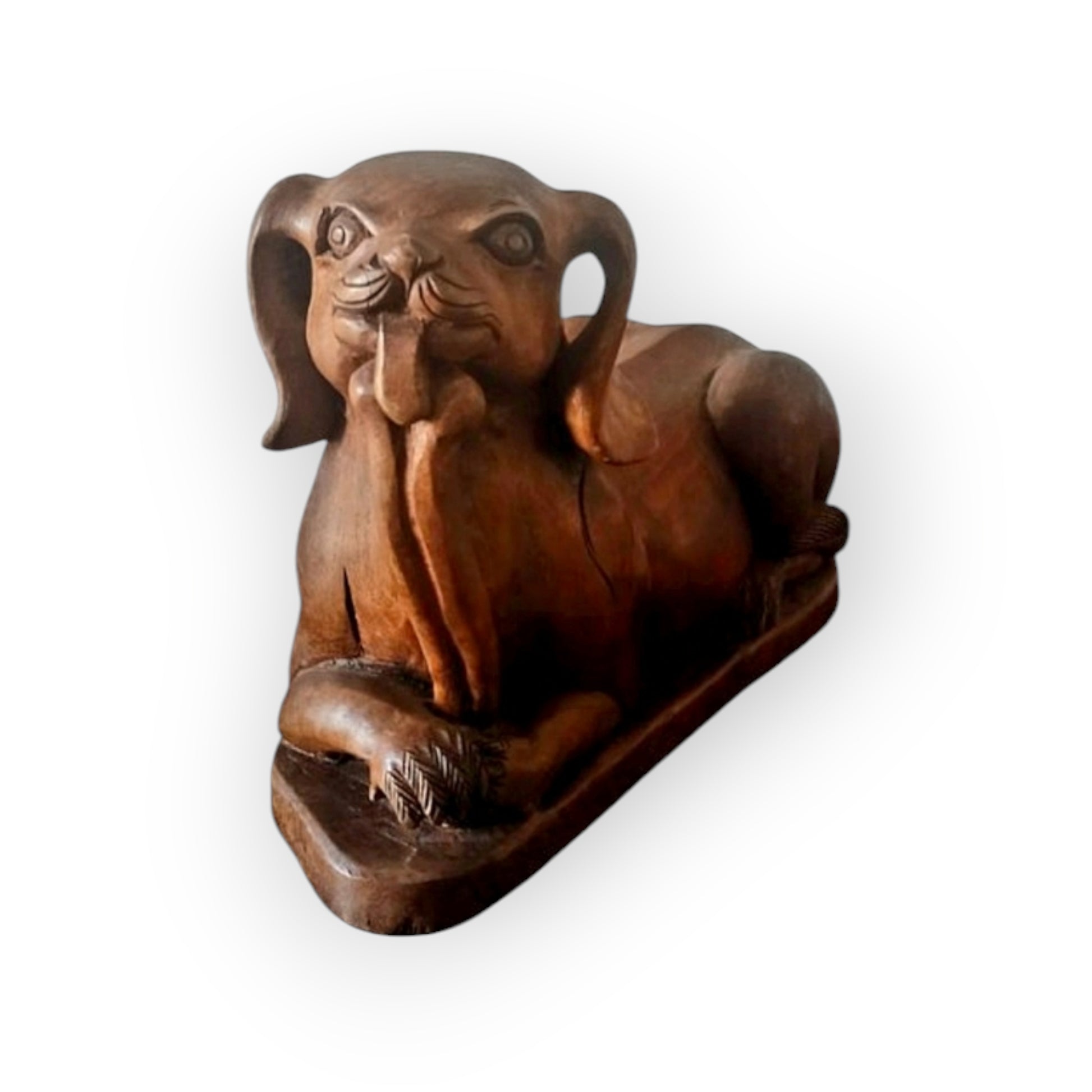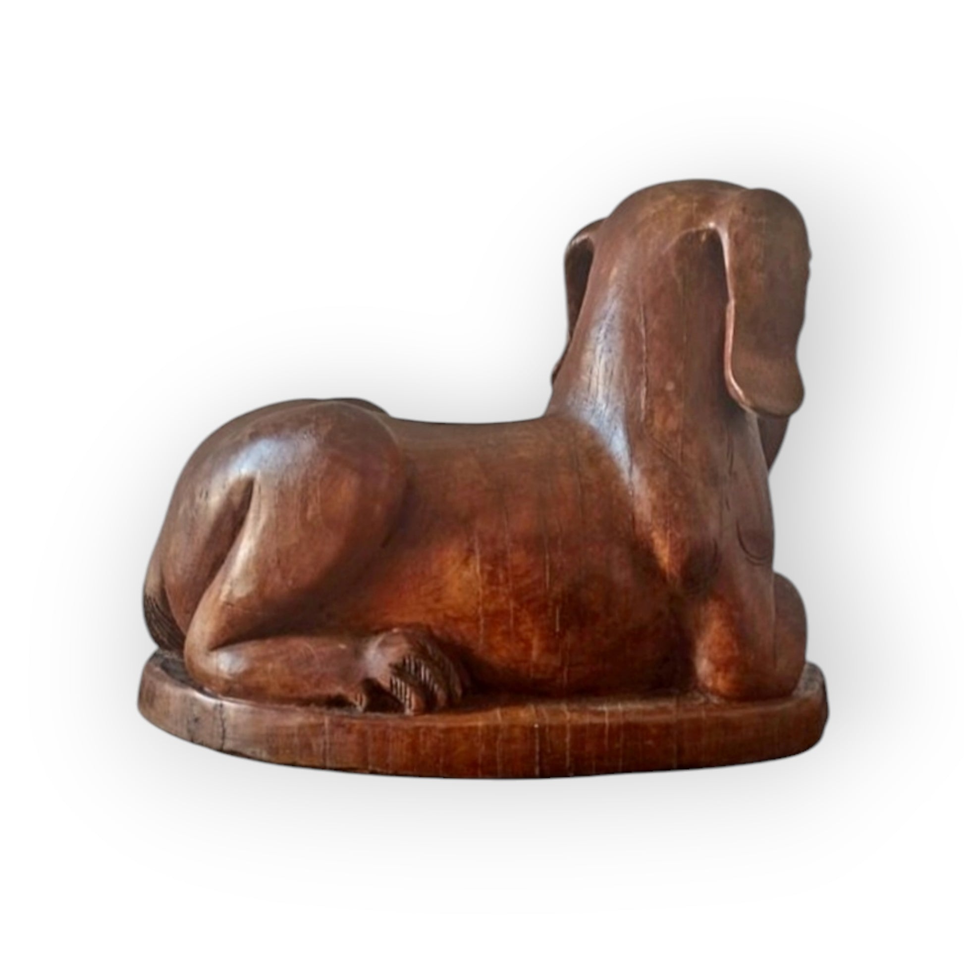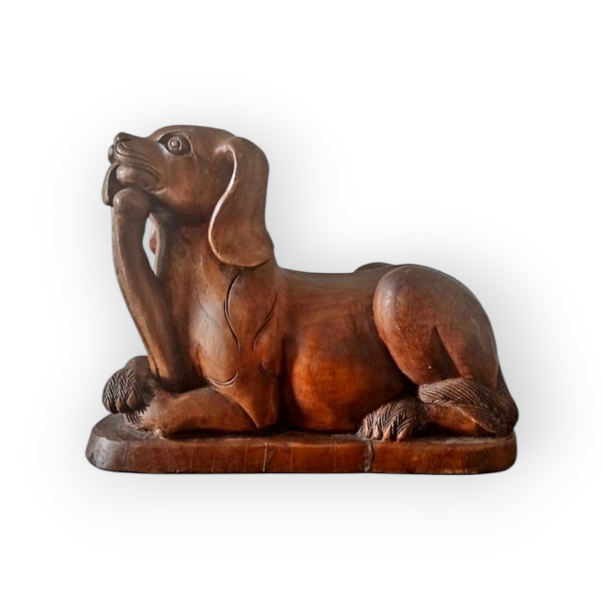 A large, charming, yet somewhat naive, 19thC carved wooden folk-art sculpture of a recumbent dog.
