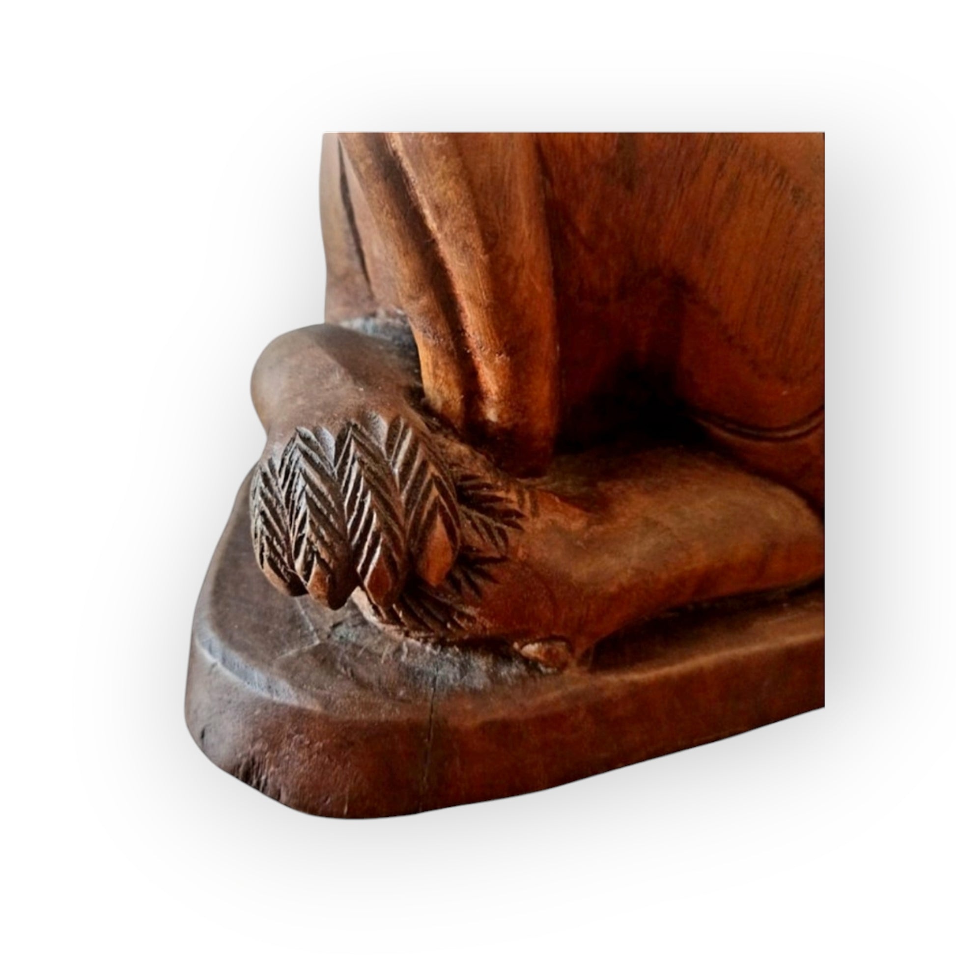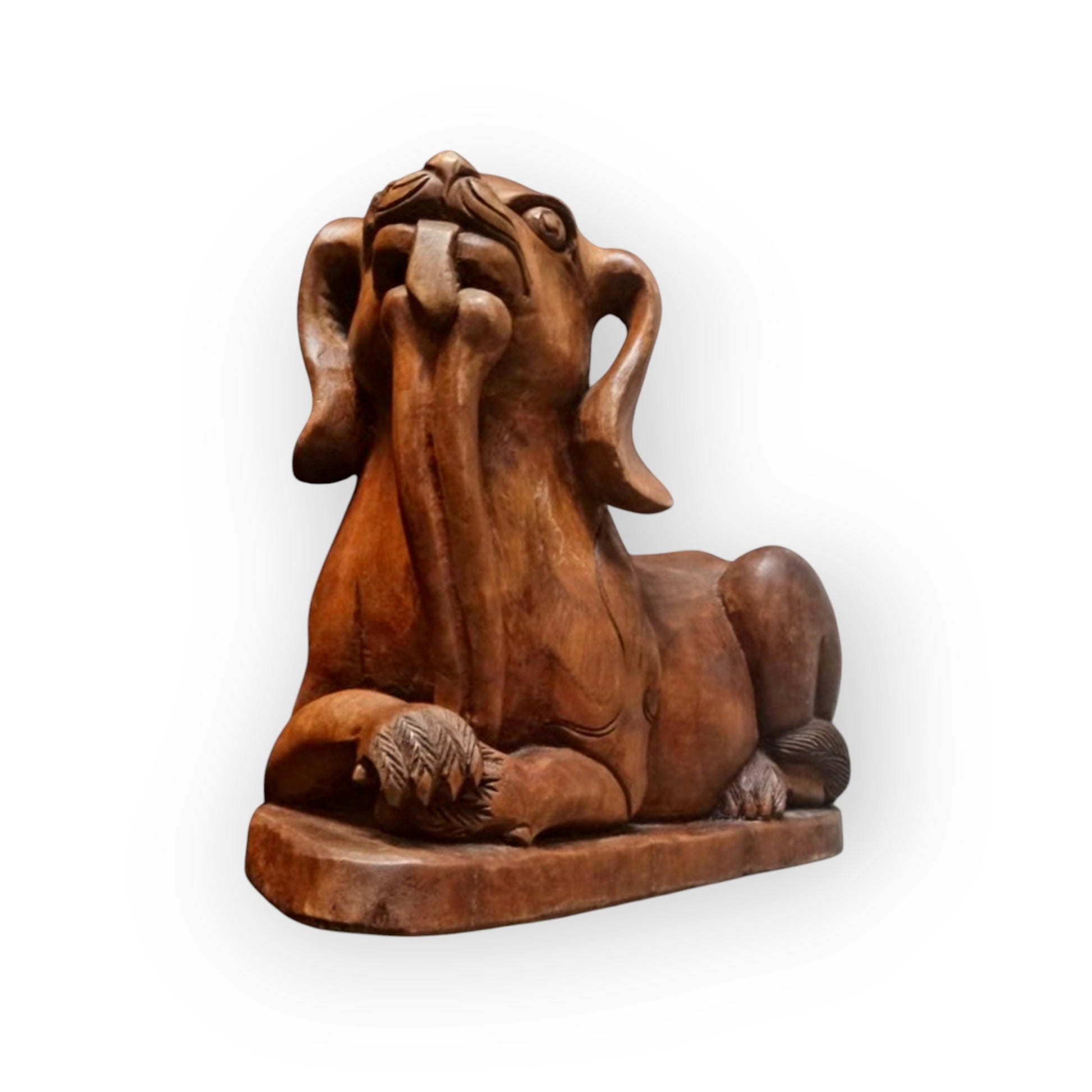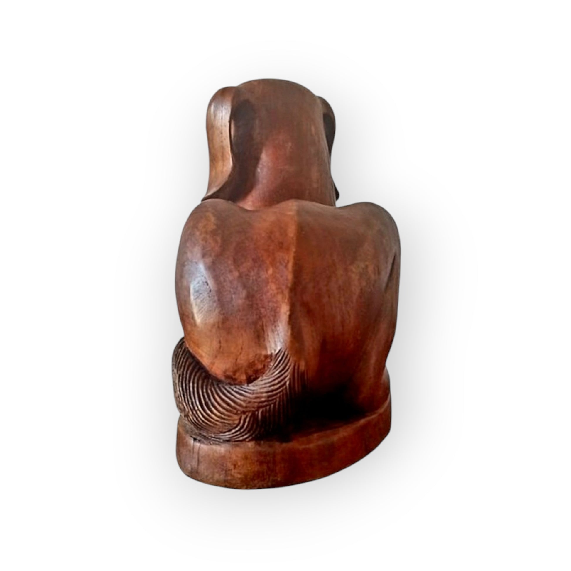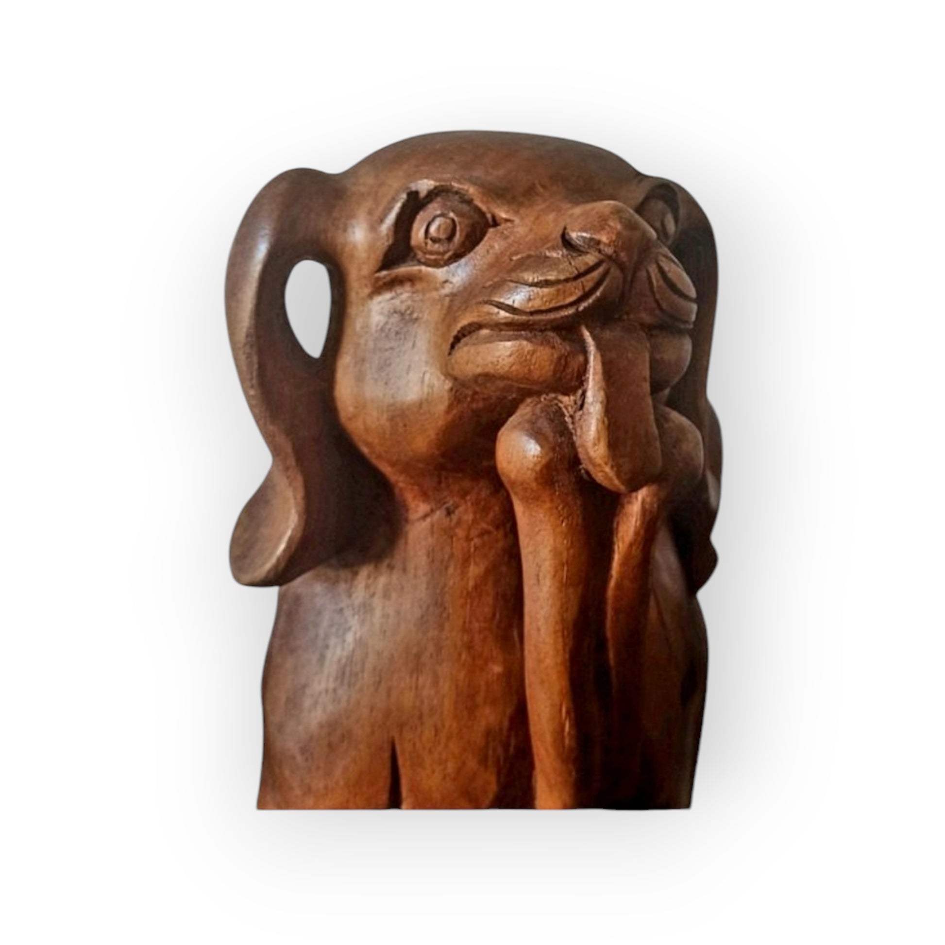 A large, charming, yet somewhat naive, 19thC carved wooden folk-art sculpture of a recumbent dog.