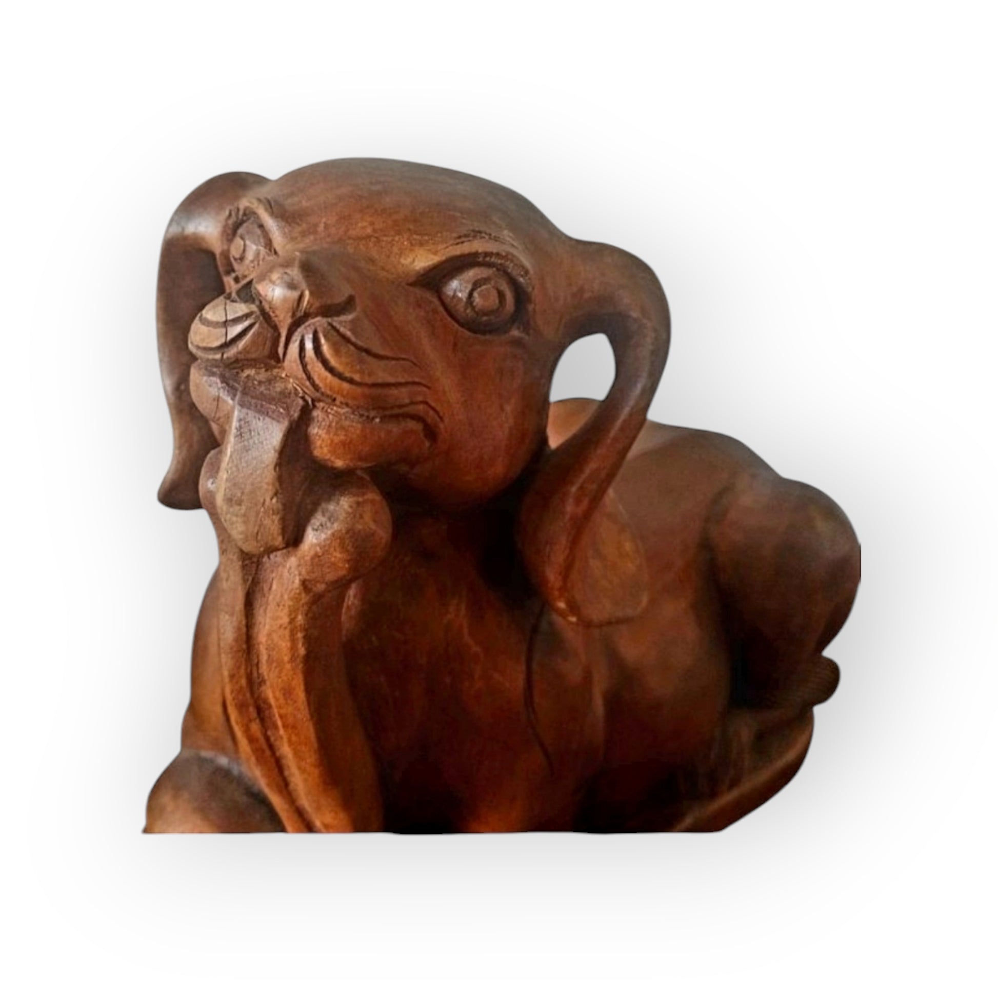 Large 19th Century Antique Folk-Art Carved Wooden Sculpture Of A Recumbent Dog With A Bone