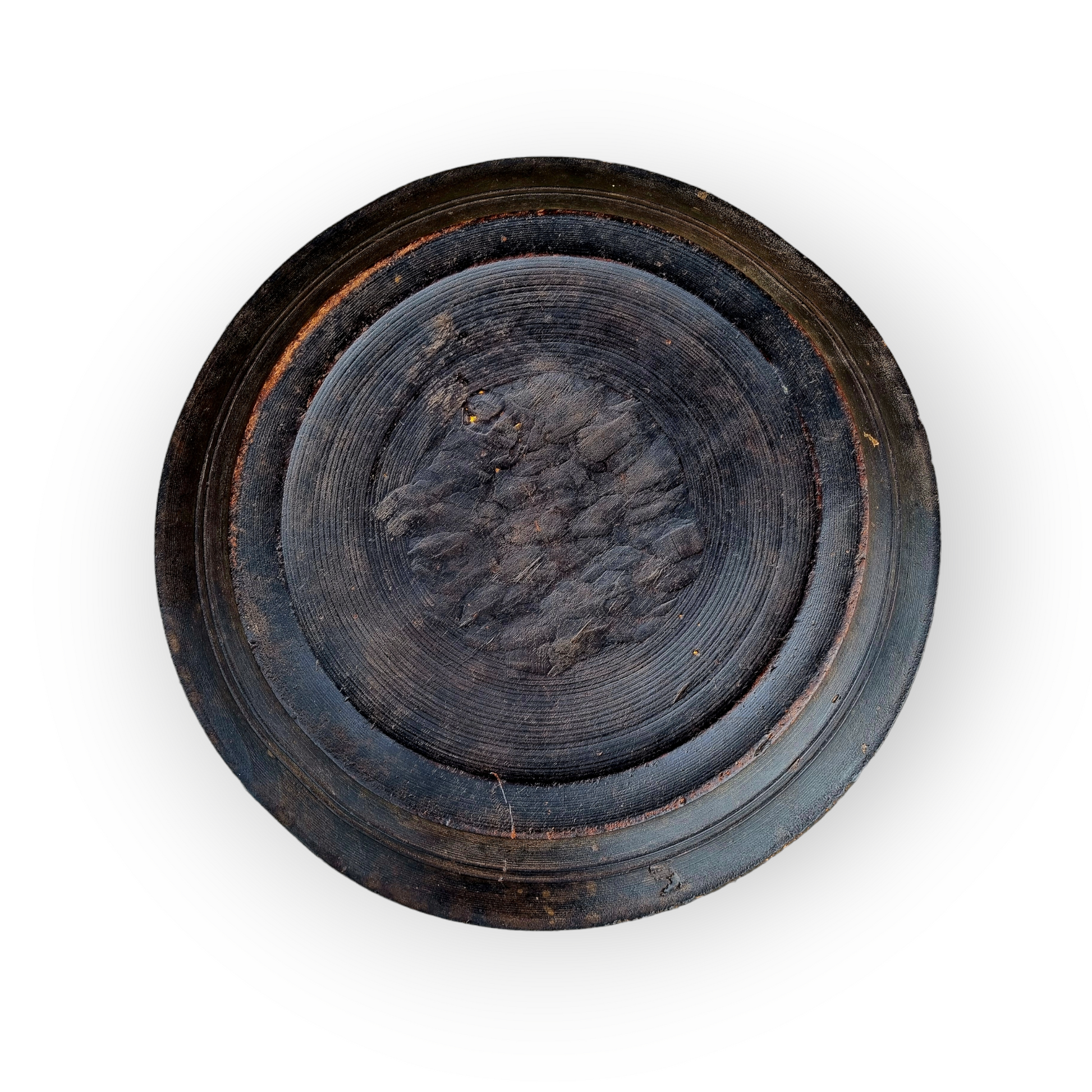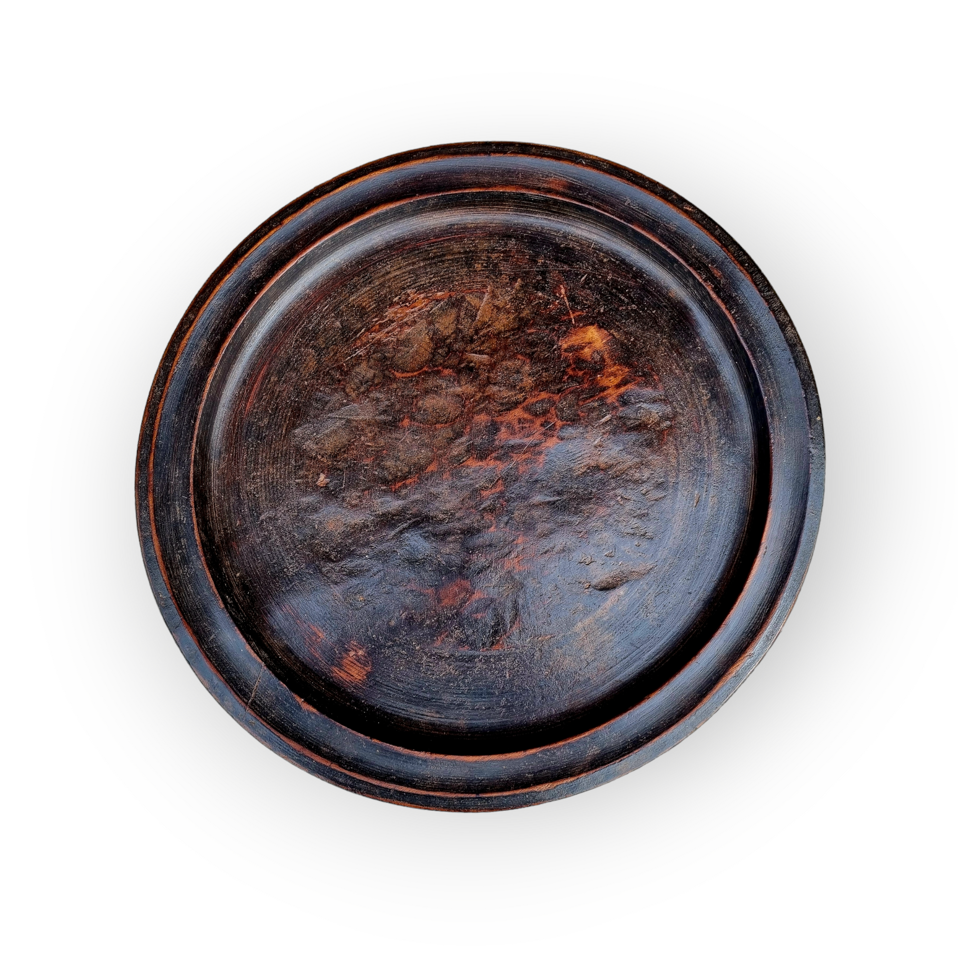 Made from a single piece of timber, the centre shows old tool marks from an adze. The outer part of the platter and shaped rim show line turning from a pole lathe.