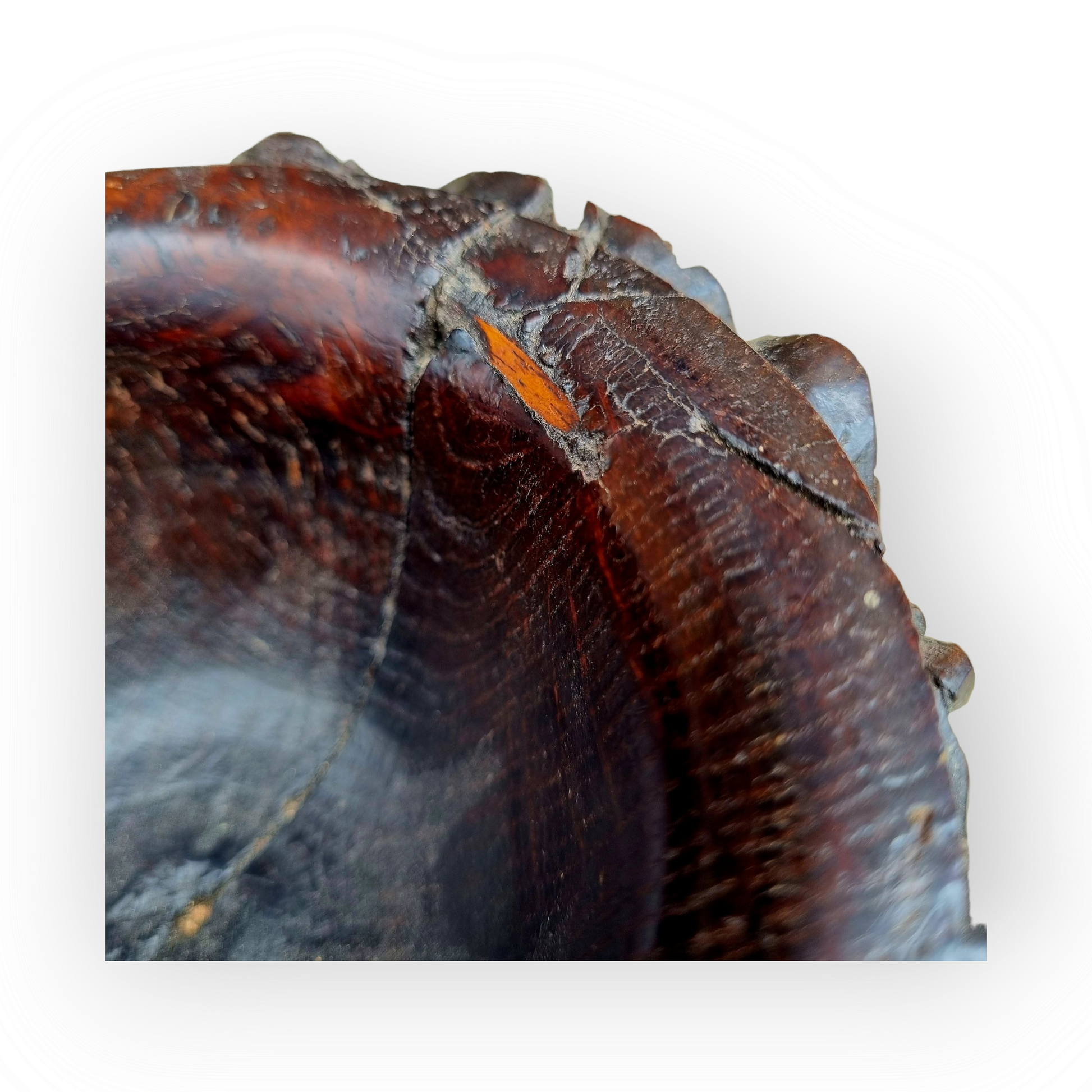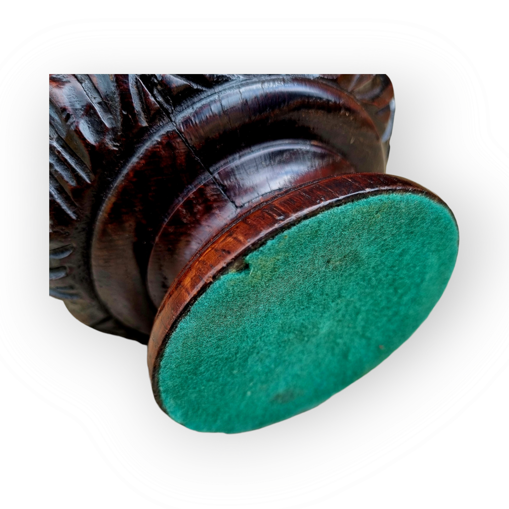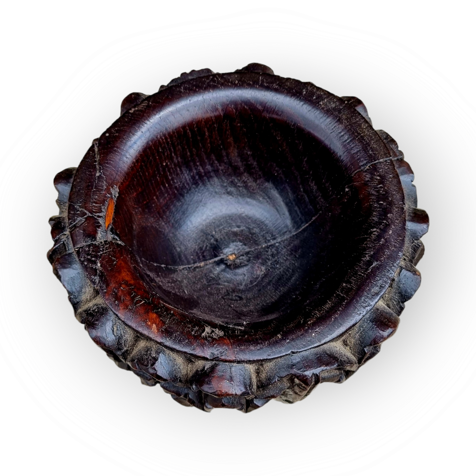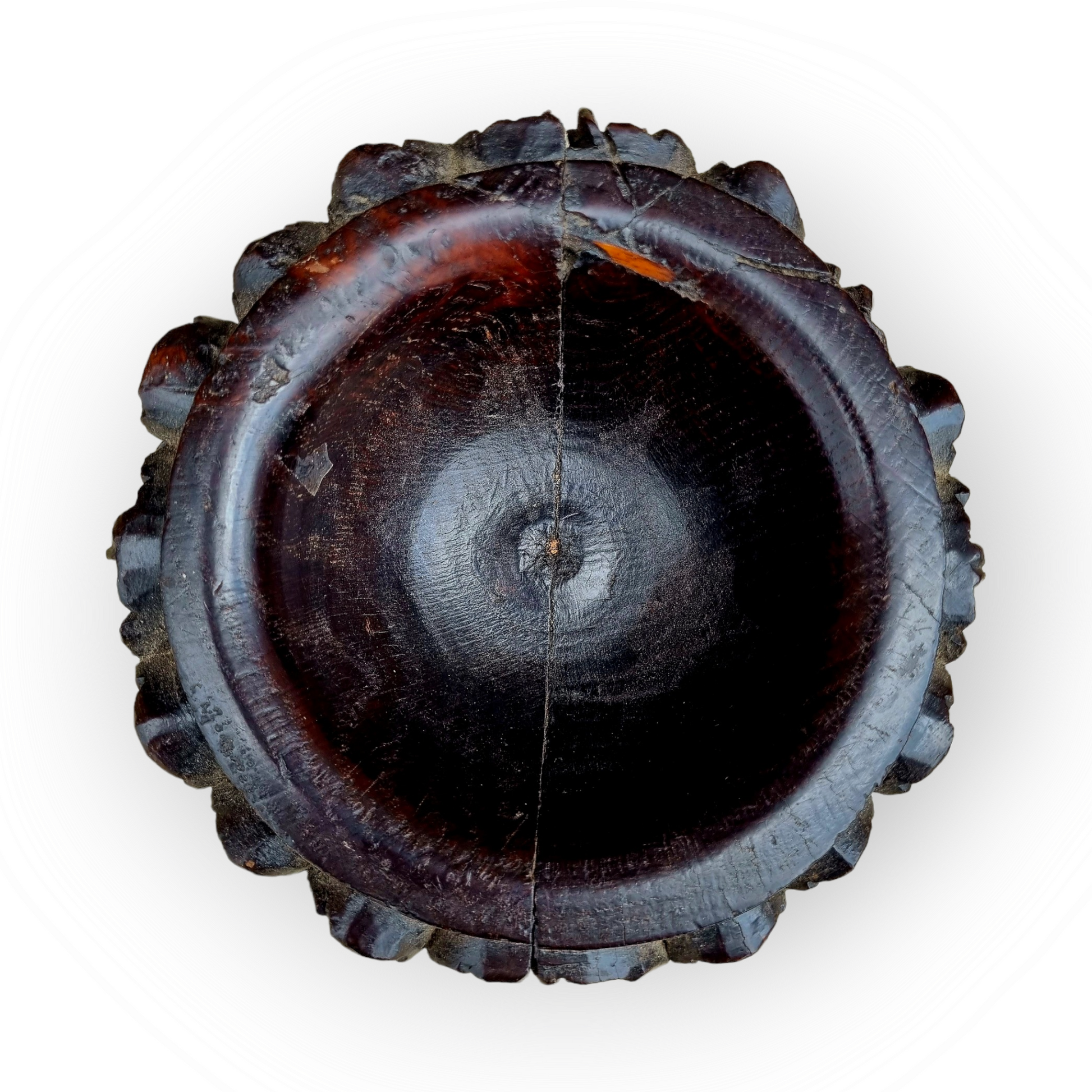 Turned on a pole lathe. The outer surface of the bowl is heavily carved with stylised acanthus leaves. Supported overall on a raised circular foot.
