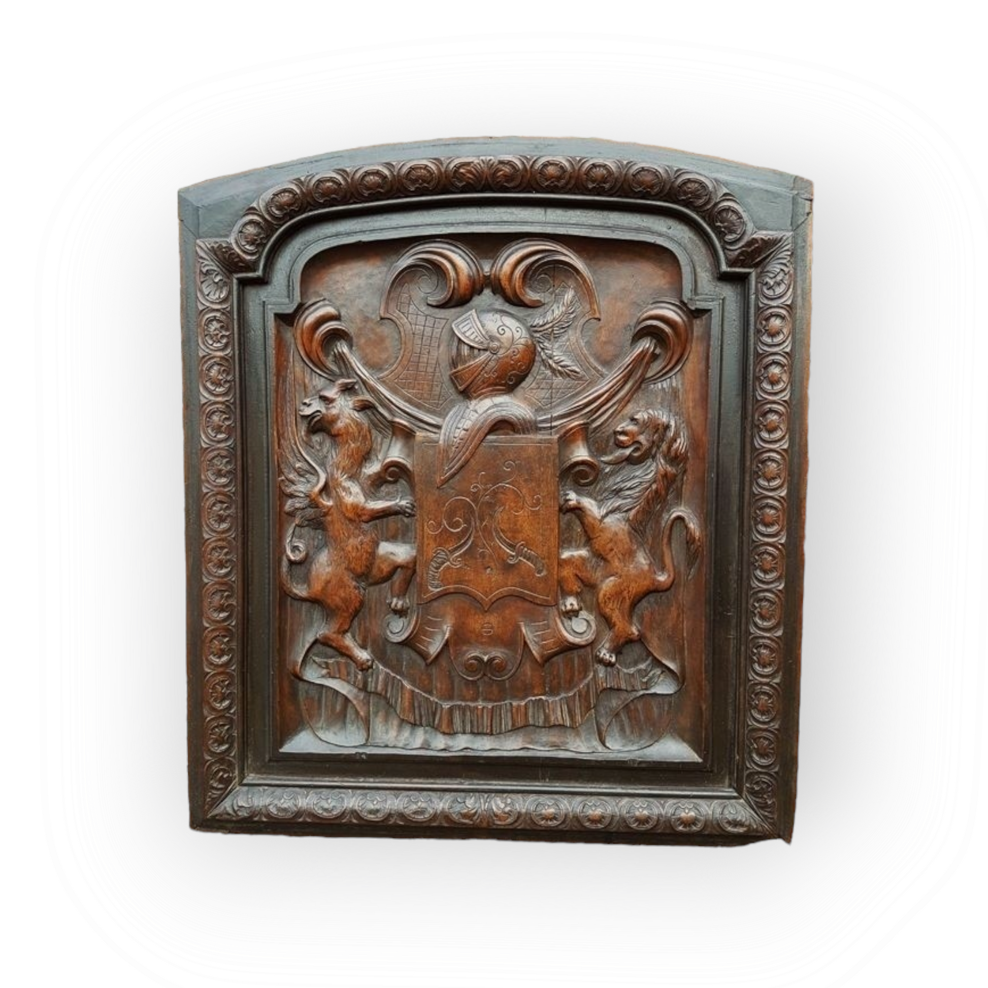 Large and Impressive Late 17th Century French Antique Carved Walnut Overmantel with Armorial Crest