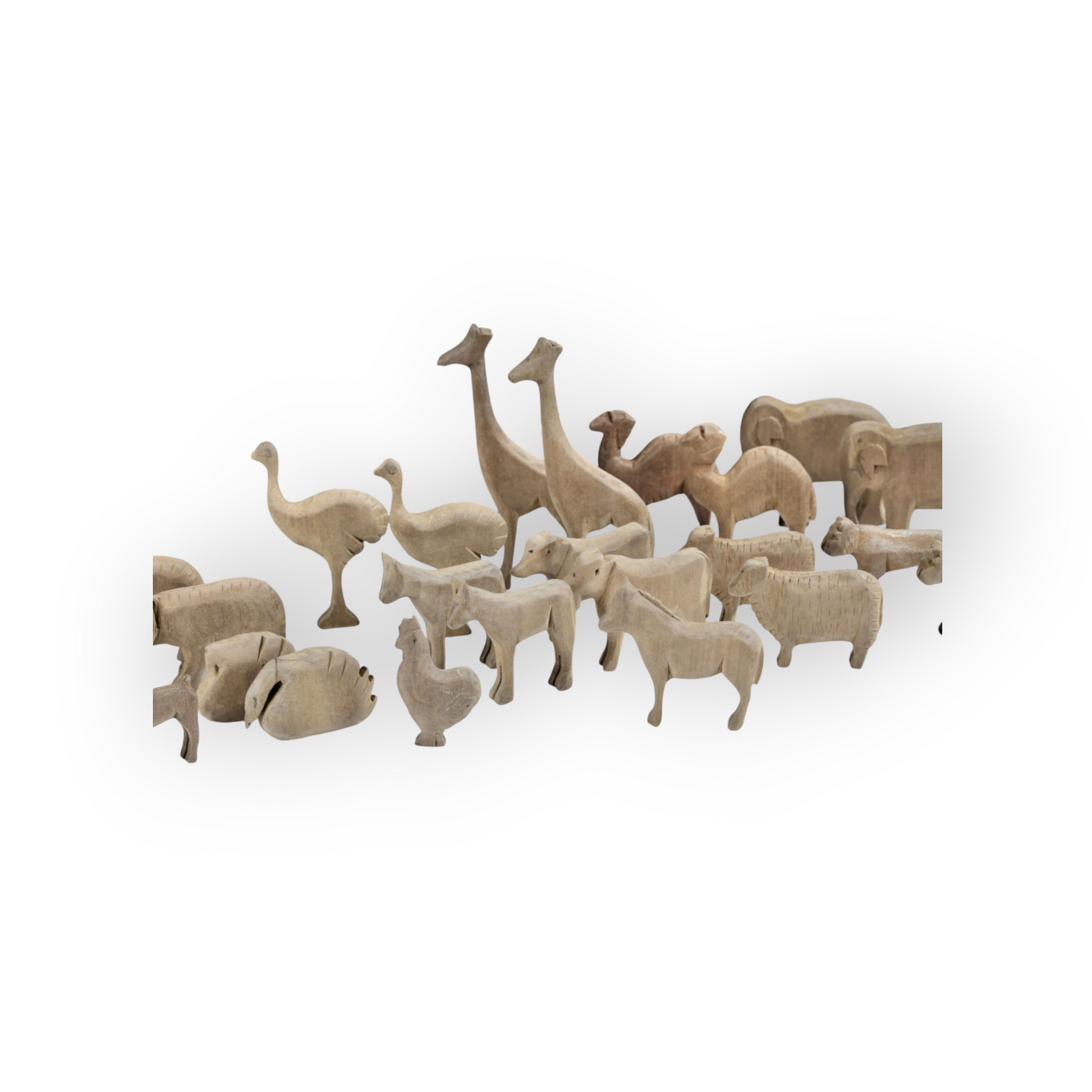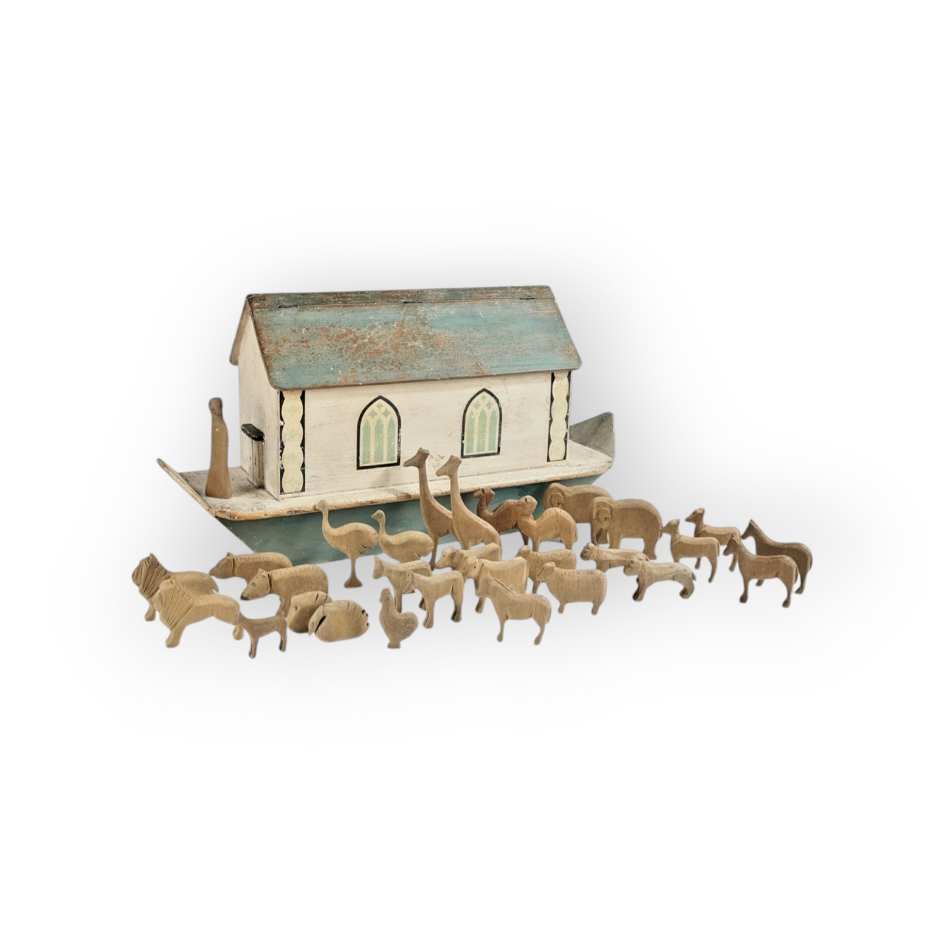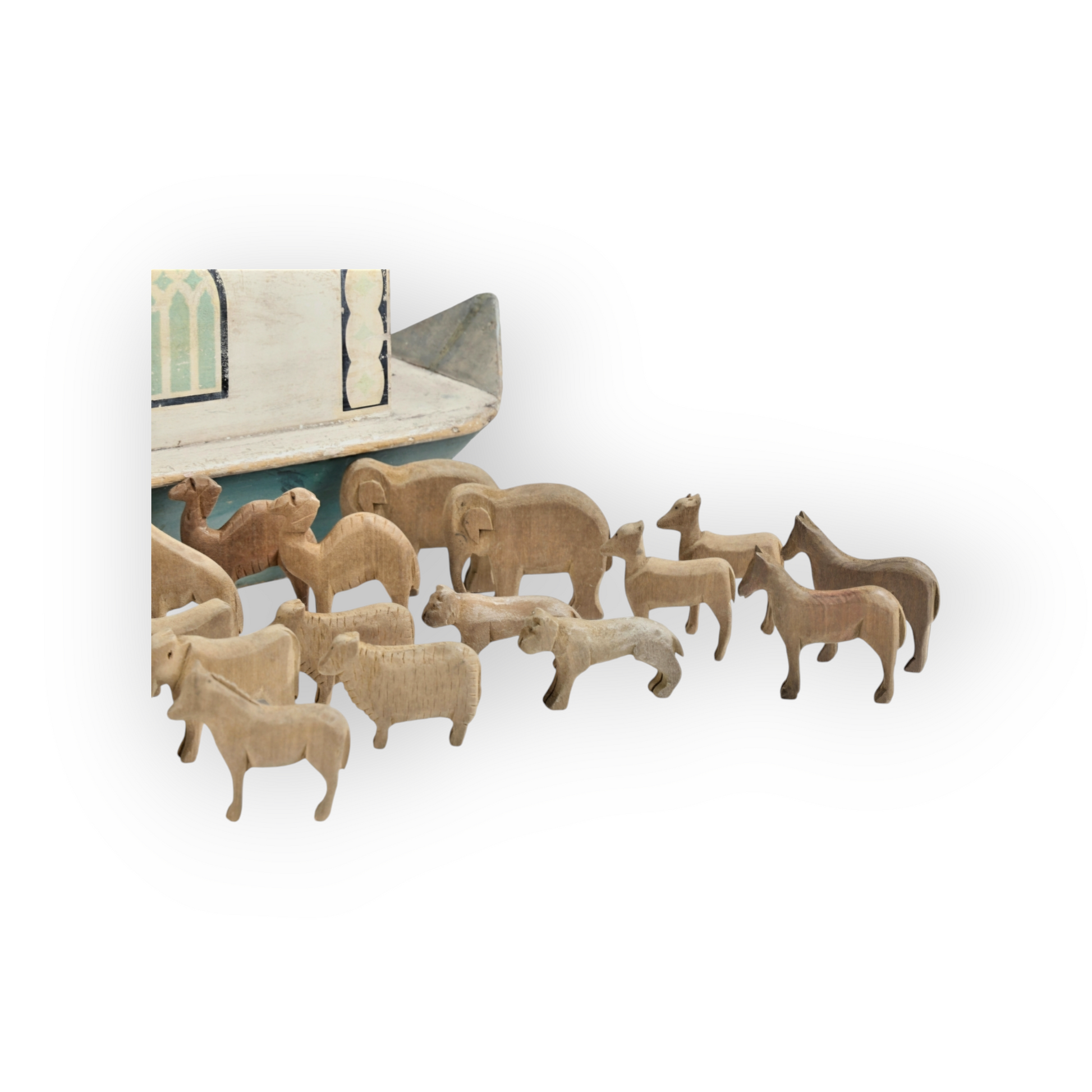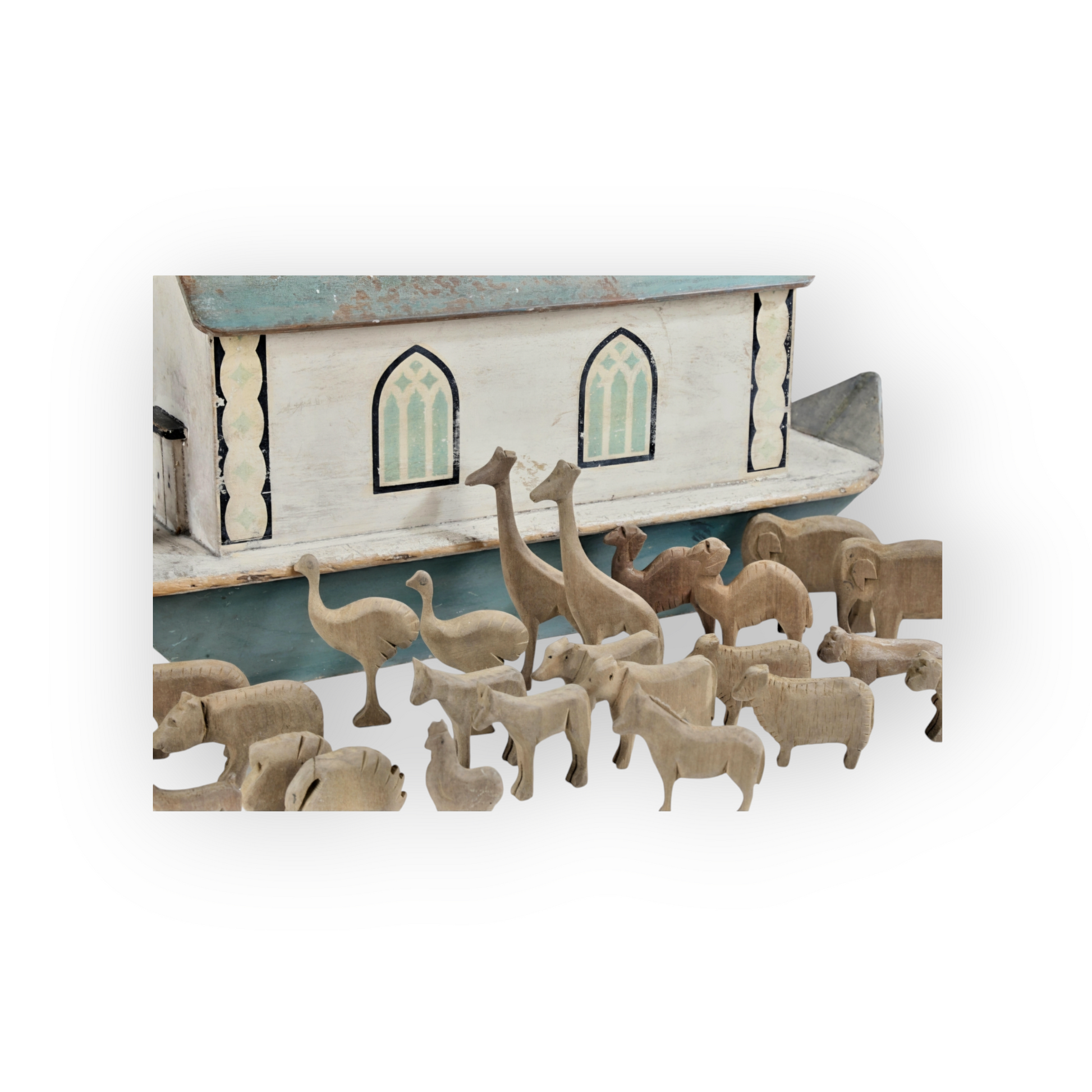 Complete with a herd of naively carved wooden animals of varying species and in pairs, after the biblical story, along with a naively-carved Noah too!