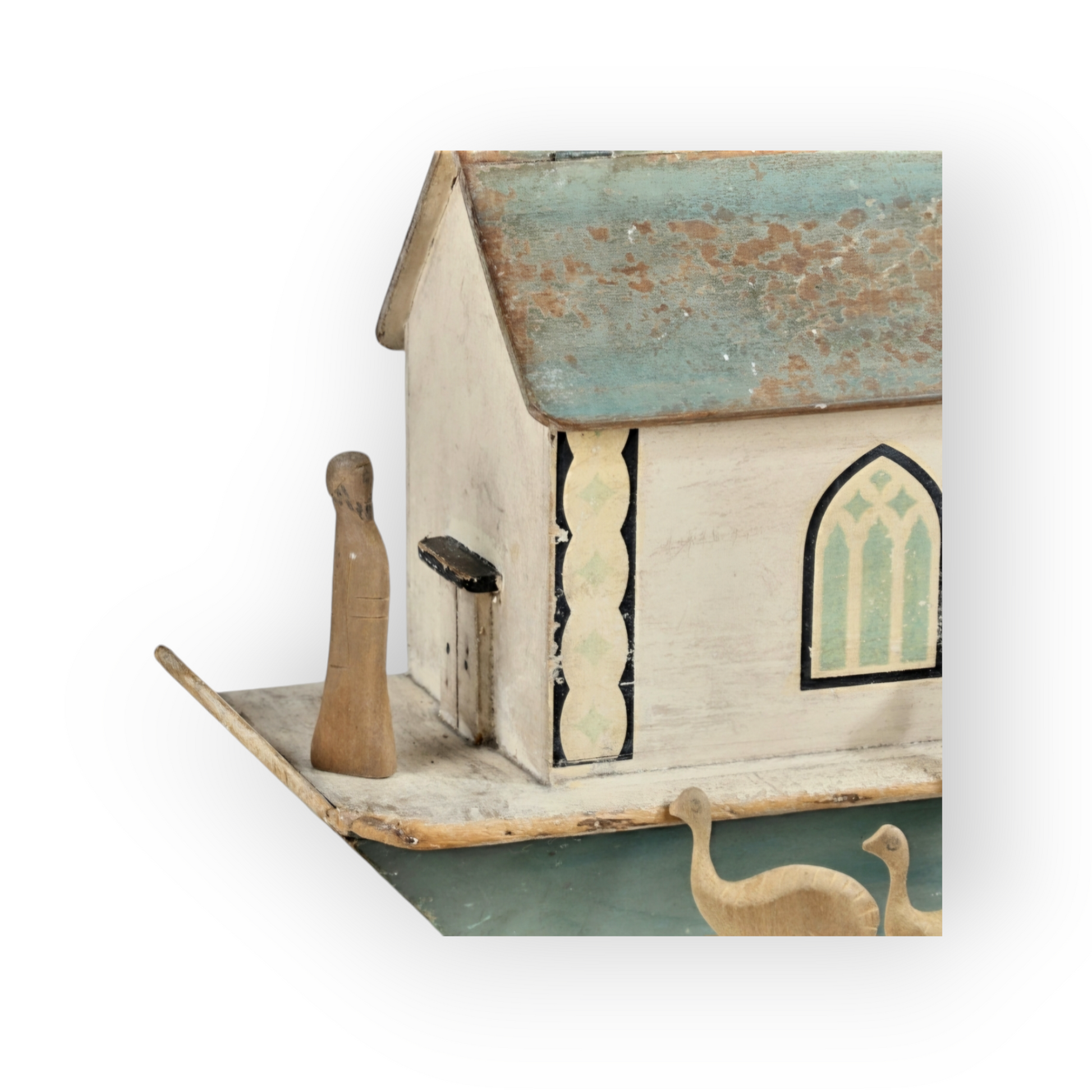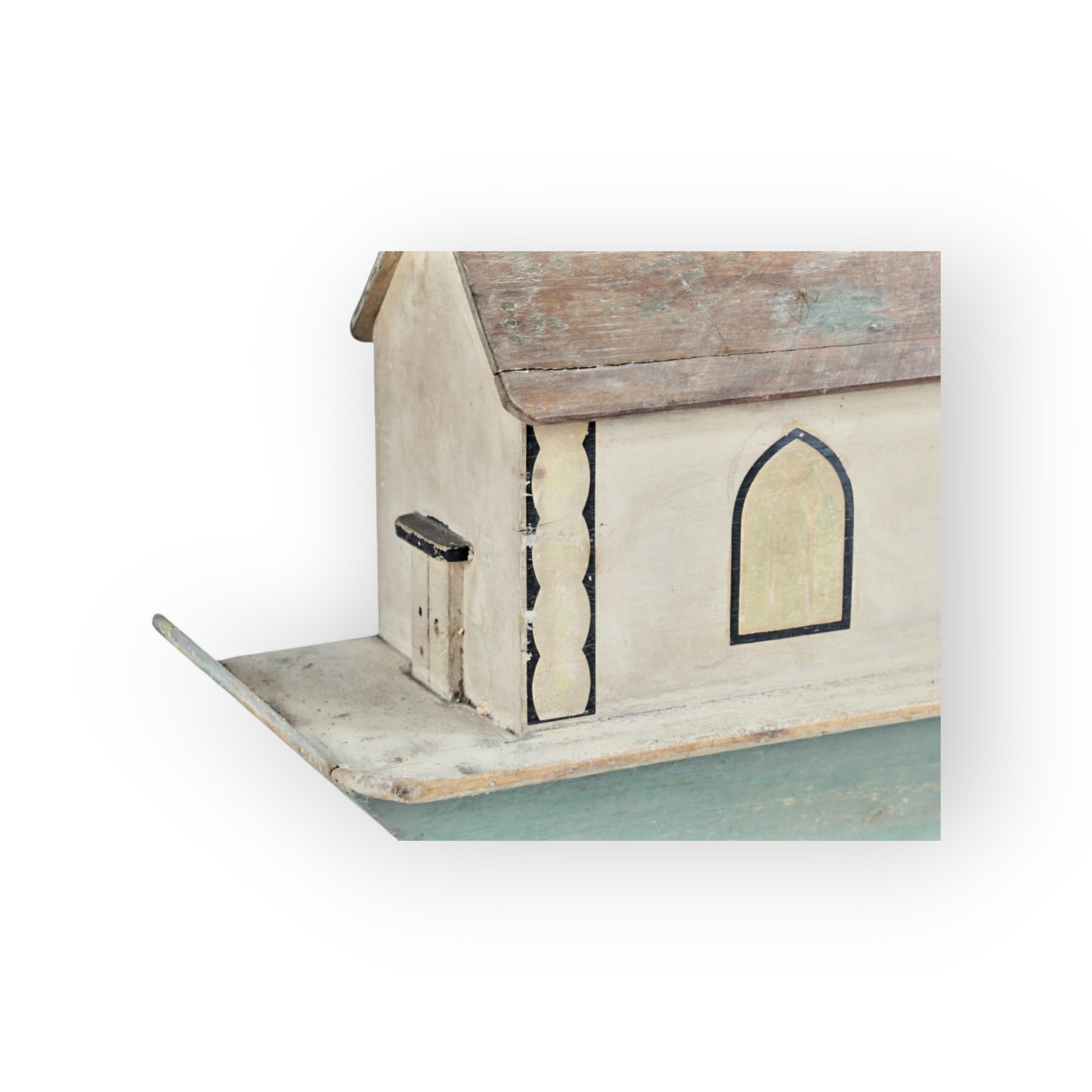 A large 19thC antique child's toy in the form of a Noah's Ark, constructed from wood and painted in green and white and of typical form.