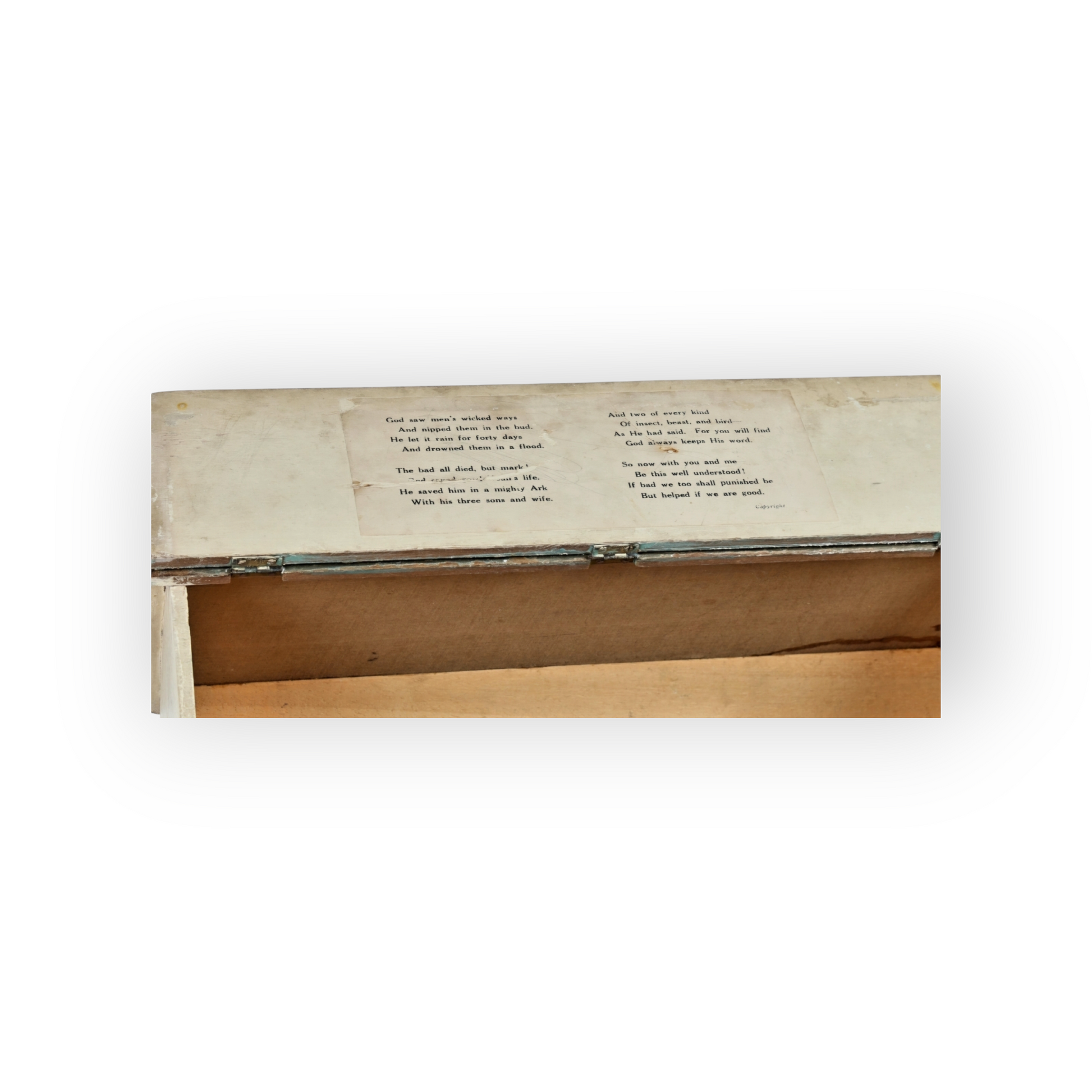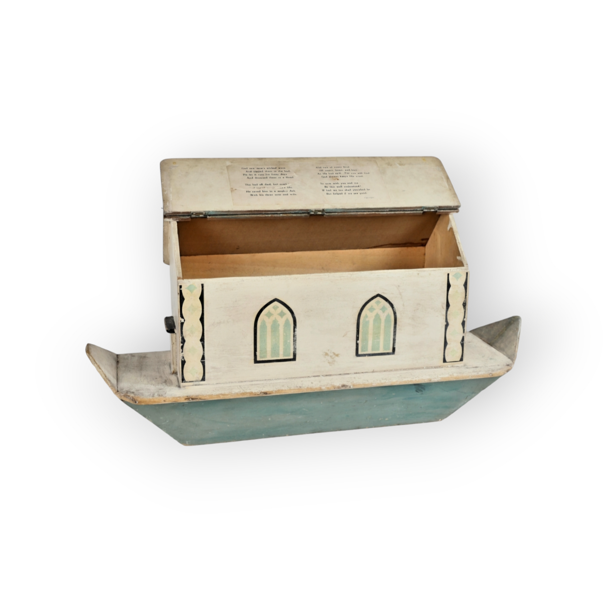 The roof opens to reveal a void interior aside an applied label to the underside with a biblical text, in English, referring to Noah, his family and the story of The Ark.