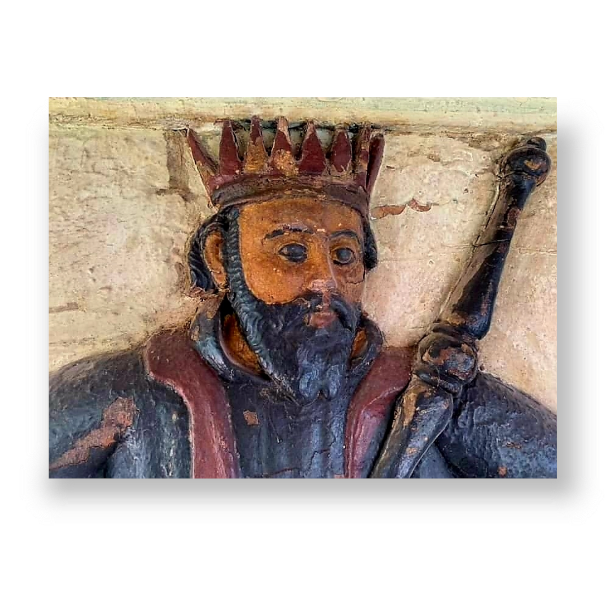 A large mid 17th Century Indo-Portuguese carved wooden panel depicting a King or Saint, circa 1650.
