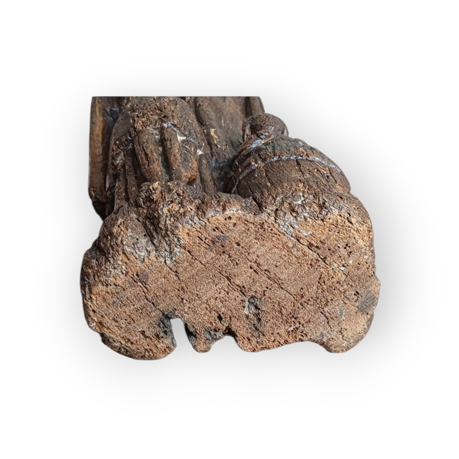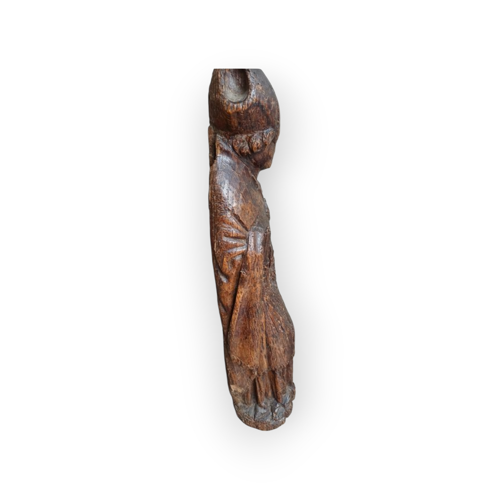 Carved from oak, the statue displays the warm patina and surface character that only centuries of age can impart. Its proportions are compact yet commanding, making it suitable for both private devotion in its original context and modern display as a collector’s piece.