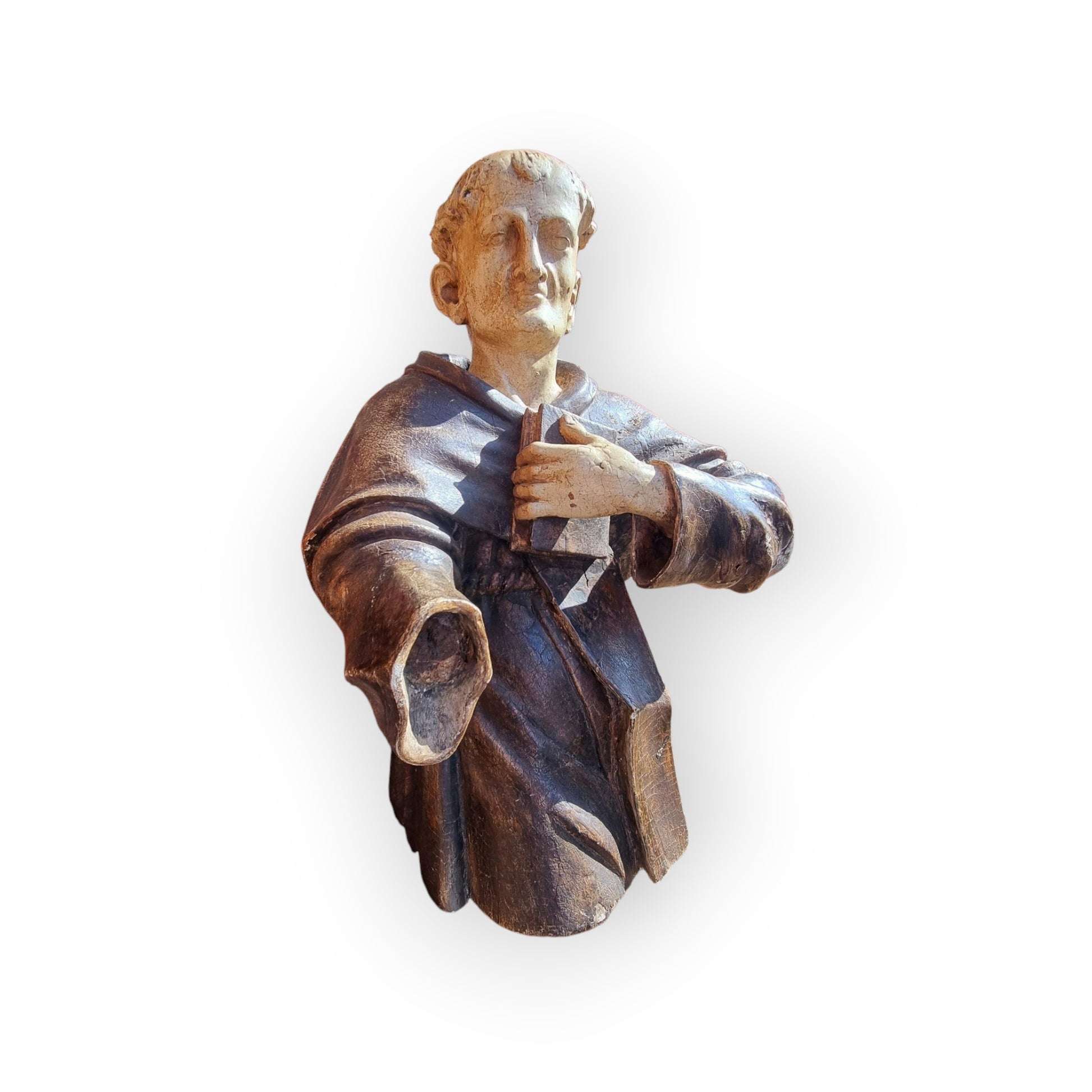 An impressive head and torso wooden carved polychrome statue of a monk. Mostly likely carved from limewood.