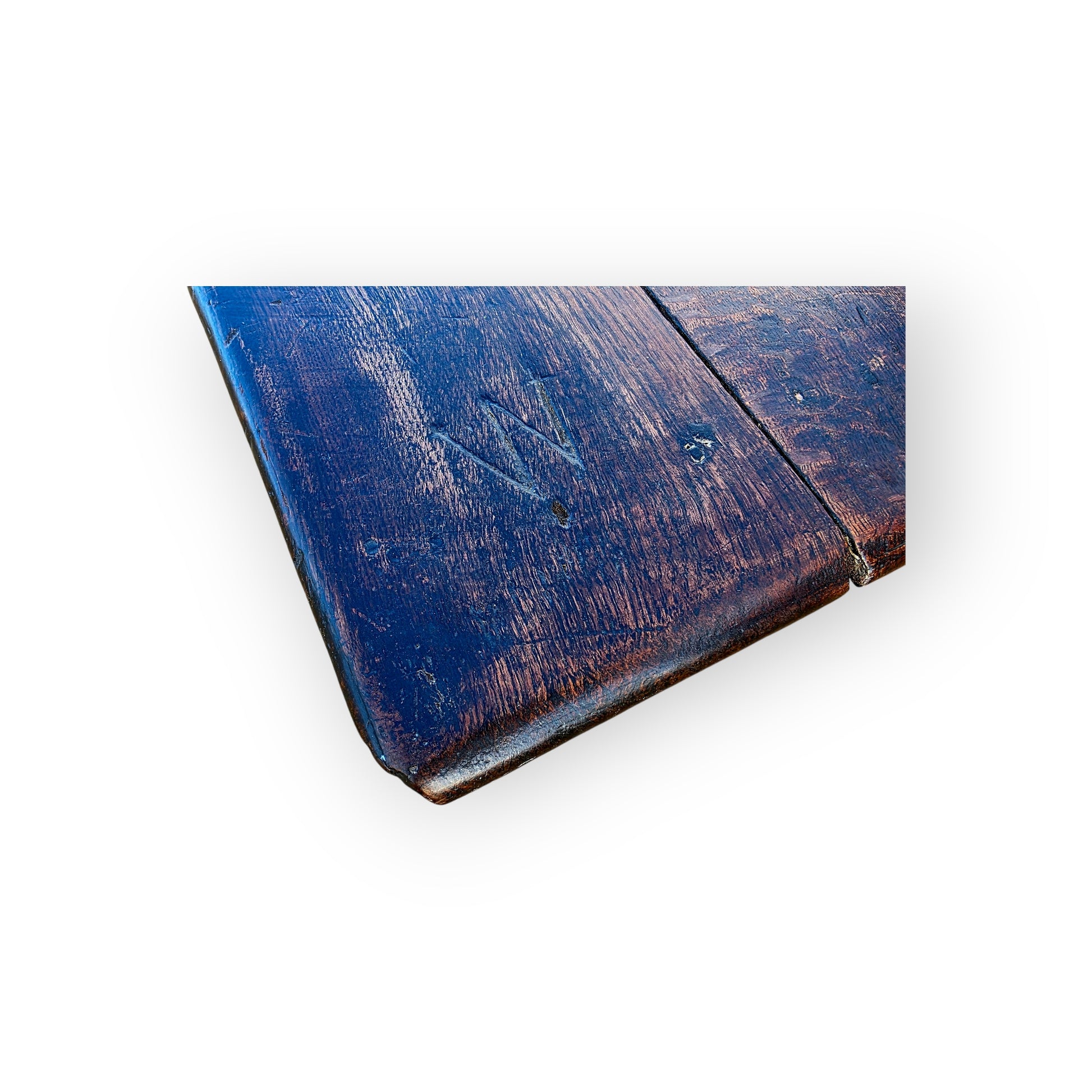 The surface bears the marks of centuries of use, including a graffiti-style scratch-carved “W” to one corner — a poignant, possibly personal inscription that adds a layer of mystery and human connection. Whether the initial of a long-lost owner, craftsman, or later admirer, it invites speculation and storytelling.