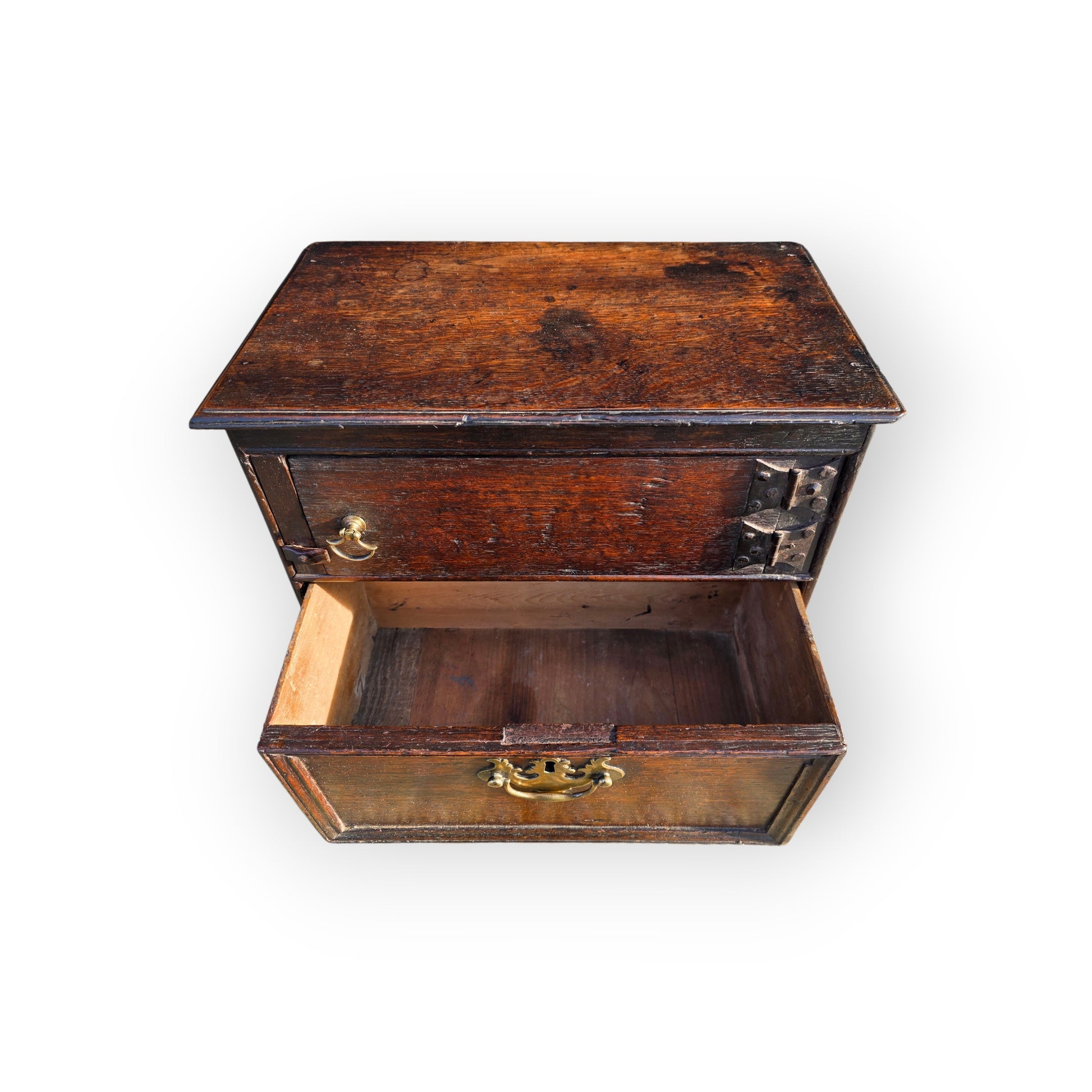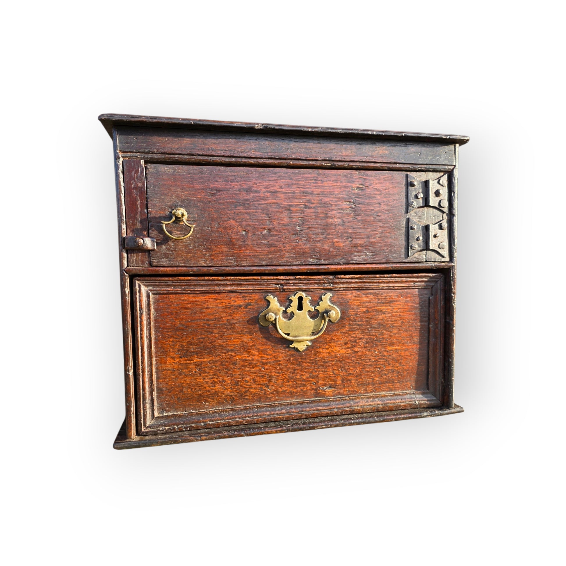 A charming early 18th‑century English oak spice cupboard, modest in scale yet full of period character. The door is a simple rectangular panel joined to the carcass by way of two wonderful iron butterfly hinges, honest and functional, typical of vernacular furniture made for everyday domestic use. Opening to reveal a plain interior, the cupboard retains no fittings or divisions — a clean, open space that speaks to centuries of practical adaptation and changing household needs. Below is a single drawer, again void of any fittings.