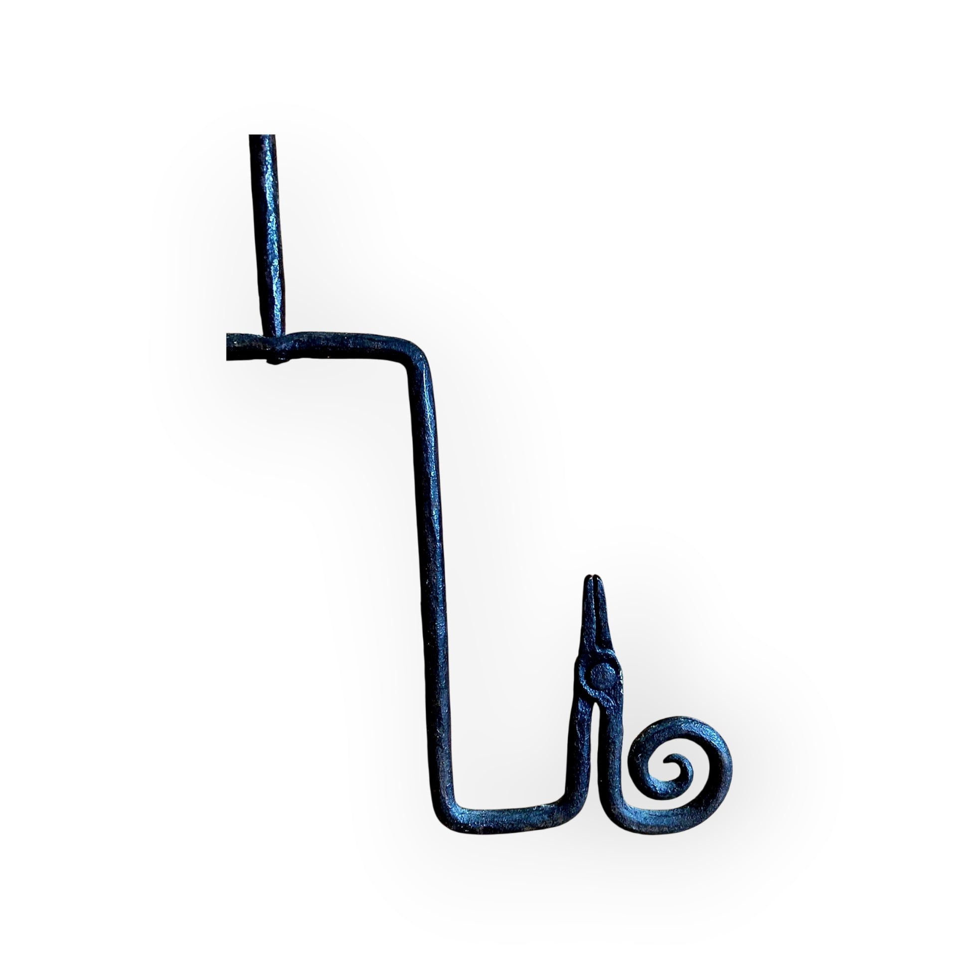 A late 18th‑century English antique wrought‑iron hanging rushlight and candleholder, forged with the elegant, functional geometry typical of rural domestic lighting. The suspended, elongated shaft, tipped with an ornate scrolled hook and hanging ring, splits into two separate branches/arms, terminating with a circular drip pan and single, rolled, candleholder to one side, and a rushlight to the other, with a pair of jaws united by a single rivet and a decorative scrolled counter-balance. This form offers both practicality and decorative appeal.