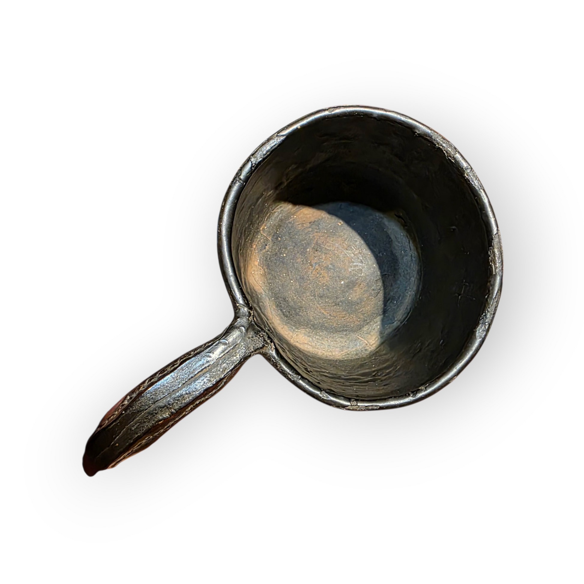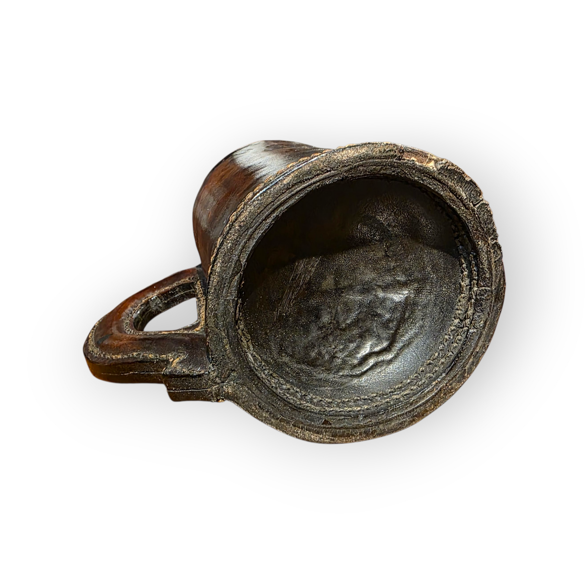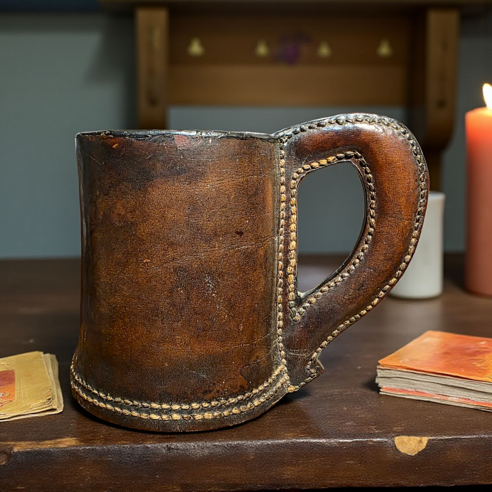 Formed from wet leather shaped over a mould, historically, these vessels were made watertight by being lined on the interior with a coating of pitch, resin, or wax, which often contributed to their dark color. This particular tankard, with its simple, robust form and stitched construction, reflects the traditional craftsmanship used for centuries for these durable, practical drinking vessels.