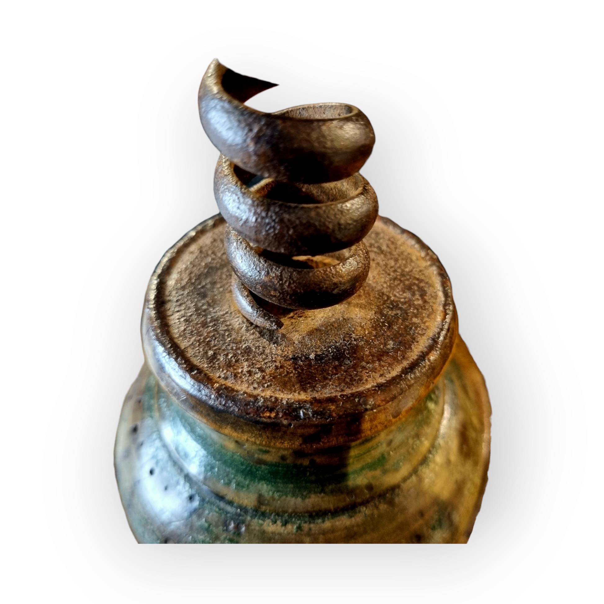 This example, constructed from iron which has been wound to form a coil with a carrying hook (also known as a "rat tail"), over a circular iron drip pan and a turned wooden base made from beech. The base retains its original green paint.