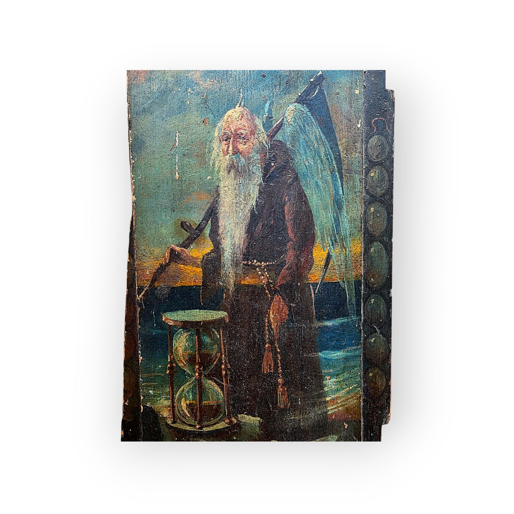 The figure of Father Time is shown full‑length, rendered with expressive, almost theatrical detail. He appears as an elderly, bearded man with flowing white hair, dressed in a dark robe. He holds a scythe in one hand — the traditional emblem of mortality — while the other rests upon an hourglass, the classic symbol of passing time. Behind him, a moody seascape and clouded sky heighten the sense of drama and transience. His wings, painted in soft tones, reinforce his mythic, celestial nature.