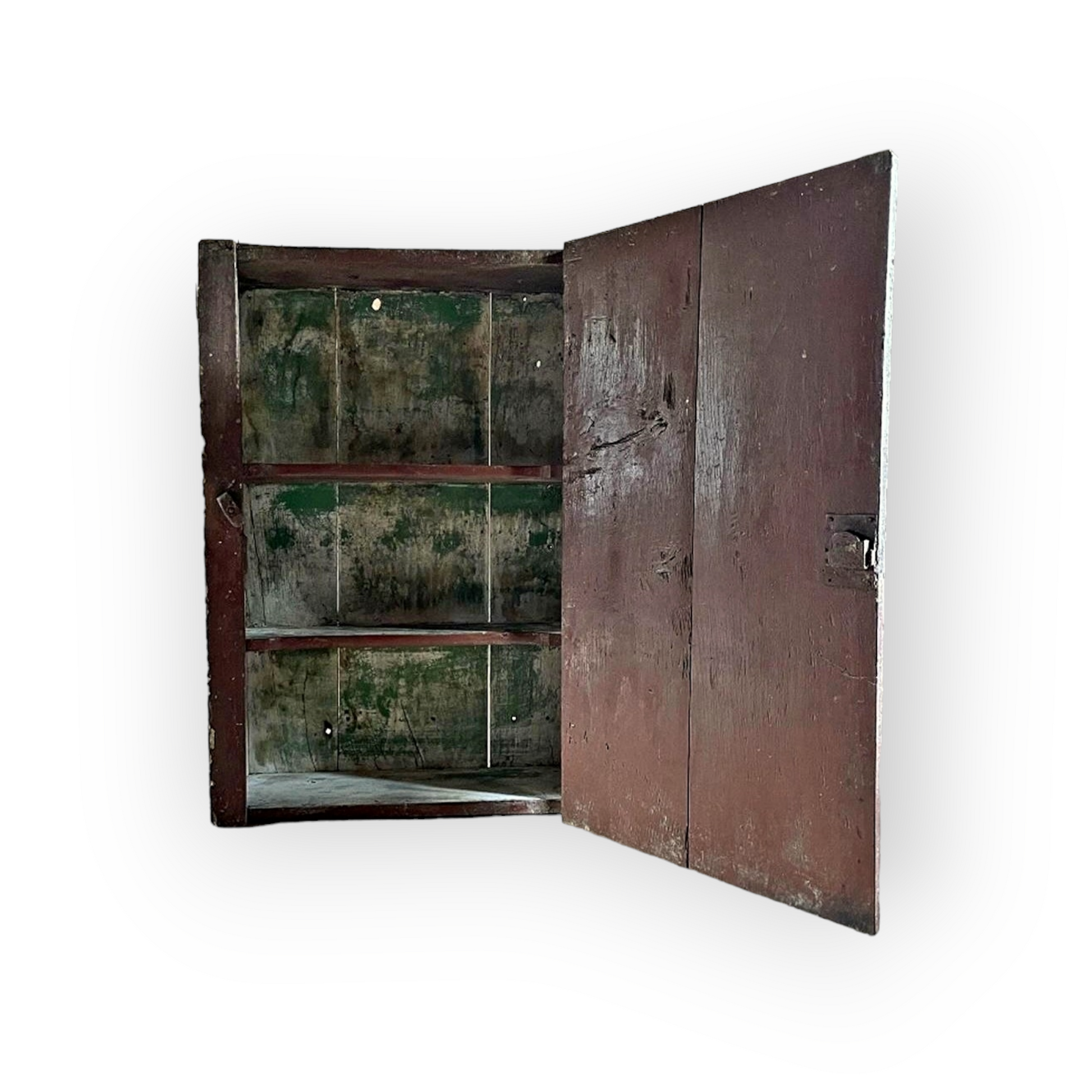 With a single plank door, joined to the carcass by way of old hand-forged "T-hinges", the door with an old iron lock opens once the wooden catch is released to reveal an interior fitted with two shelves. Again the interior retains its original paint.