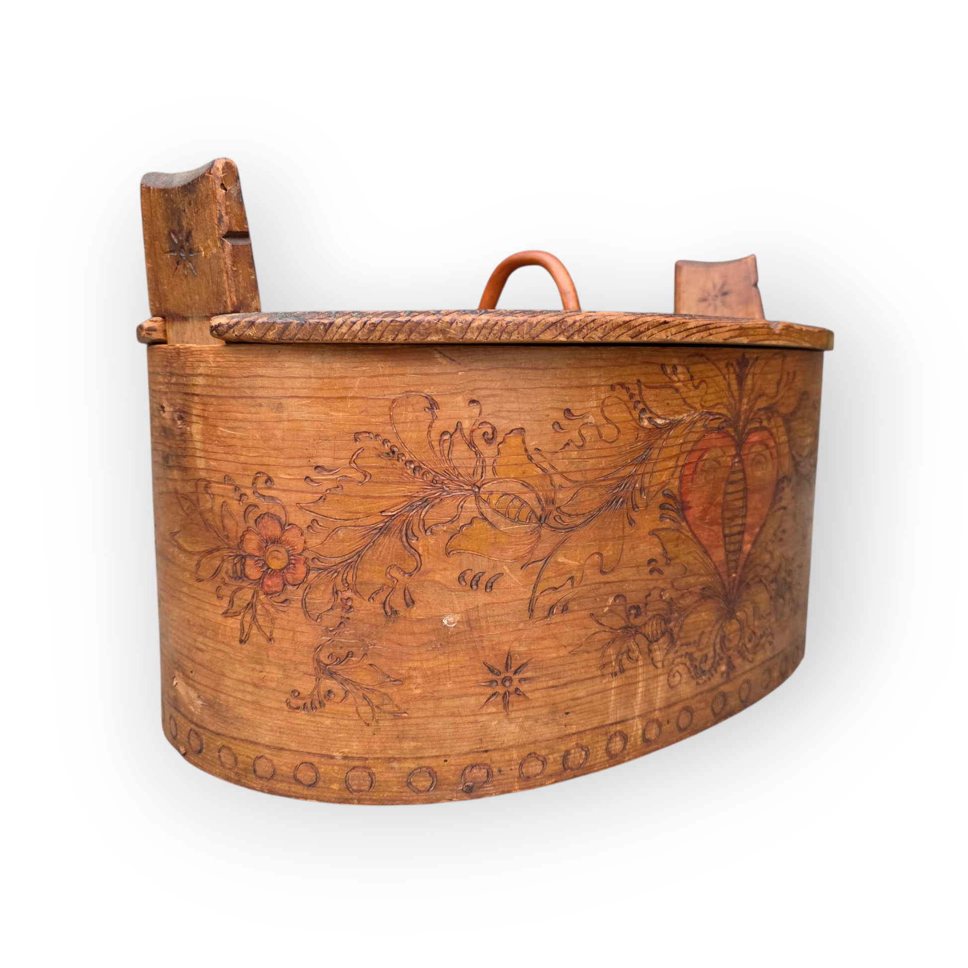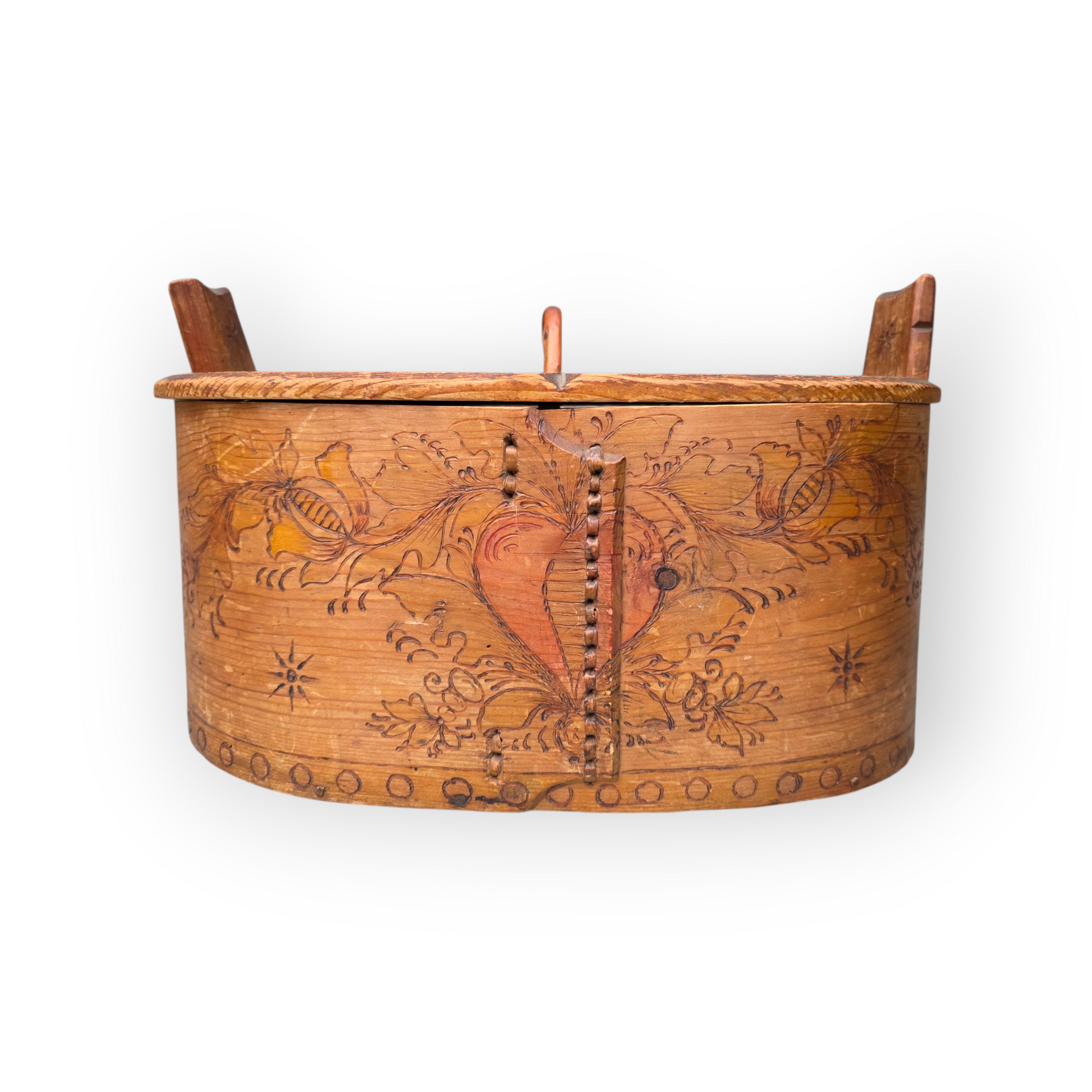 A rare and evocative late 18th-century Scandinavian bentwood box, handcrafted as a traditional love token. This oval box features a lift-off lid with an integrated carry handle and is adorned with pyrography and two polychrome love hearts, symbolizing affection and fidelity.