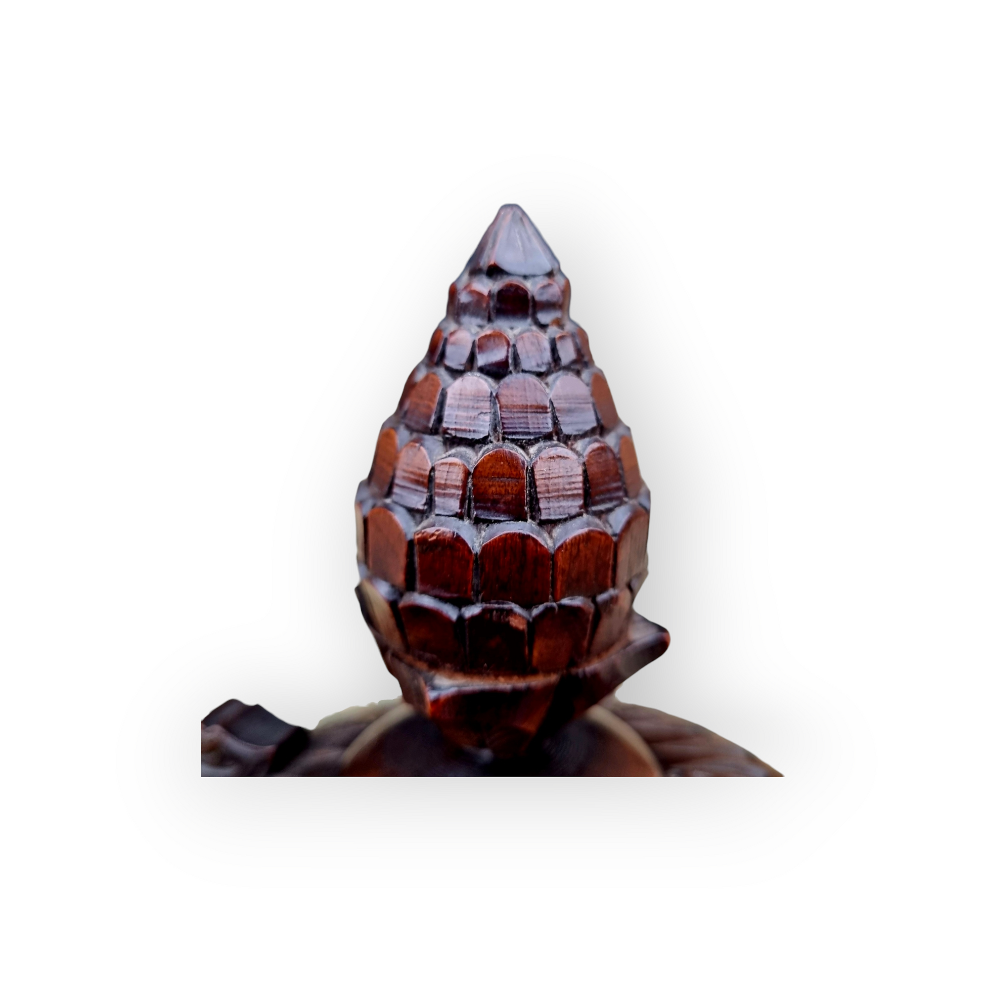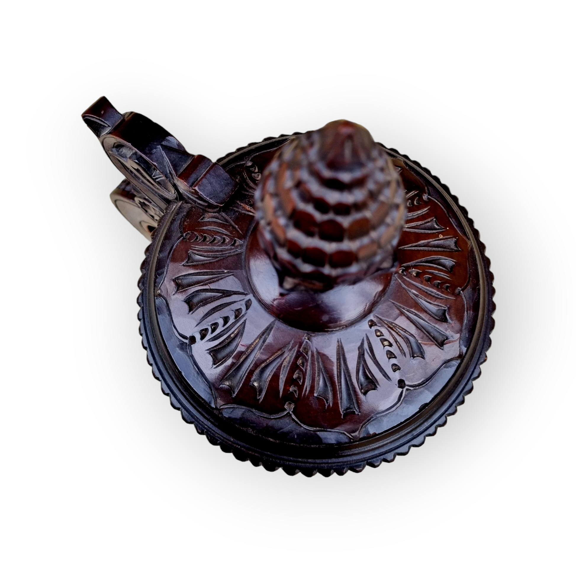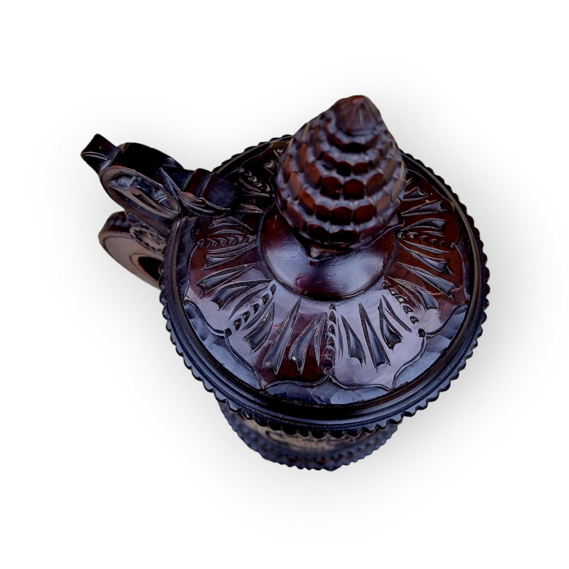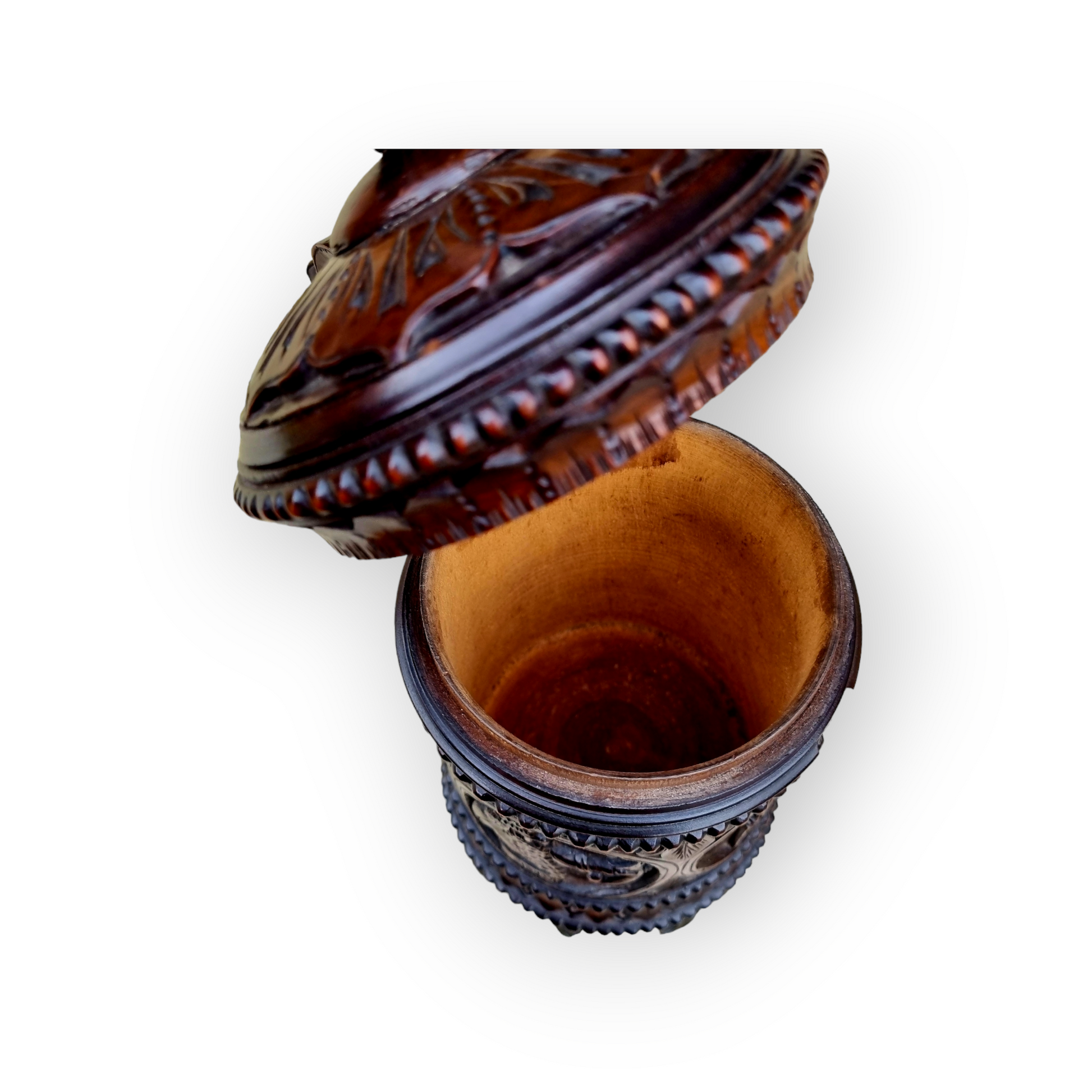 The lid is carved with a geometric pattern and tipped with an ornate "pineapple style" finial and, is joined to the main carcass by way of a carved scrolled handle.